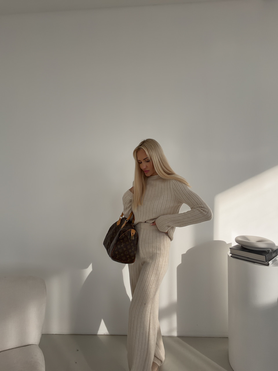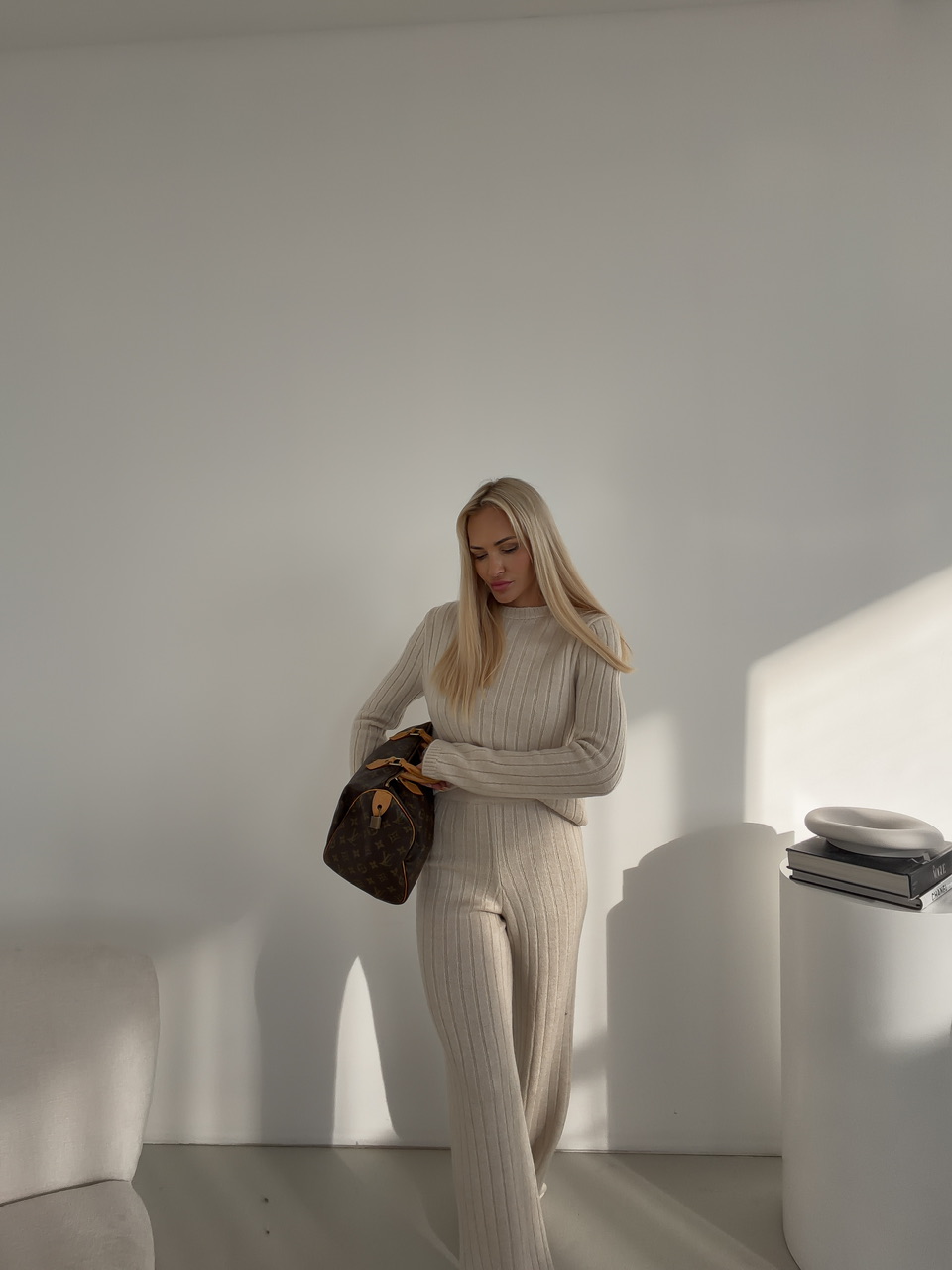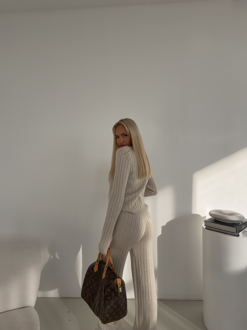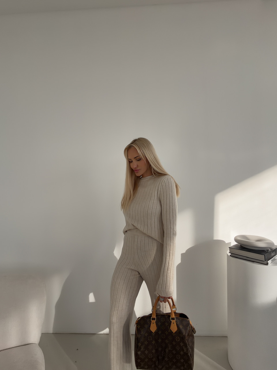 Štýlový komplet spája pohodlie s moderným dizajnom. Nohavice s elastickým pásom na gumu sú dlhšieho strihu a poskytujú voľnosť pohybu a maximálne pohodlie počas celého dňa. Sveter s okrúhlym výstrihom dodáva outfitu nadčasový vzhľad a ľahko sa kombinuje s ďalšími kúskami. Celý komplet je ideálny na každodenné nosenie, či už doma, v práci alebo na voľný čas, a ponúka praktický a zároveň elegantný look.