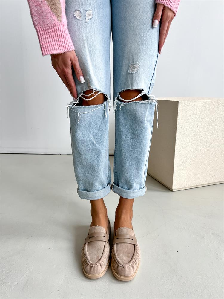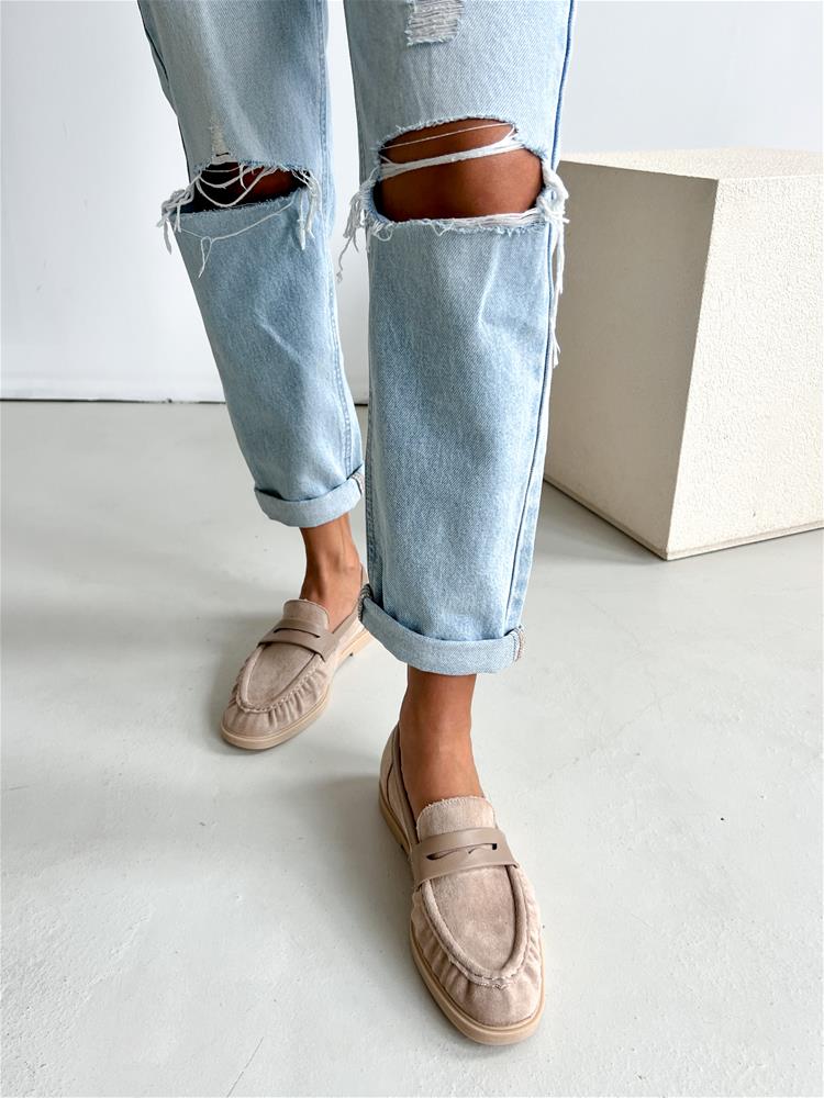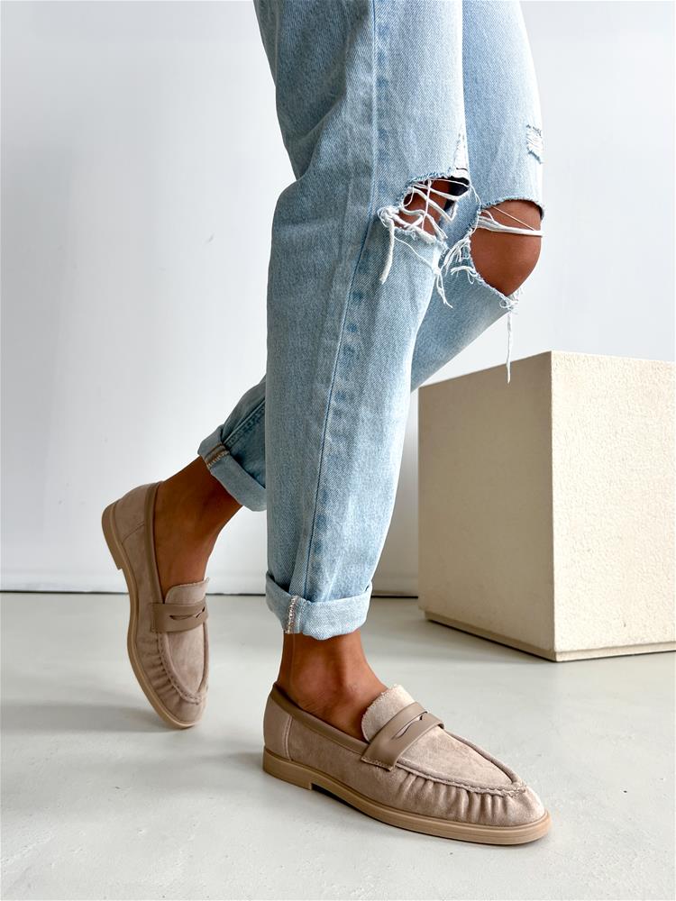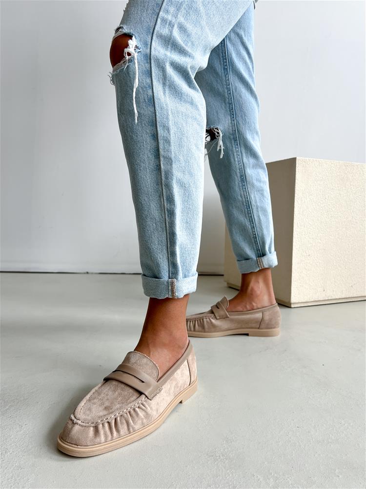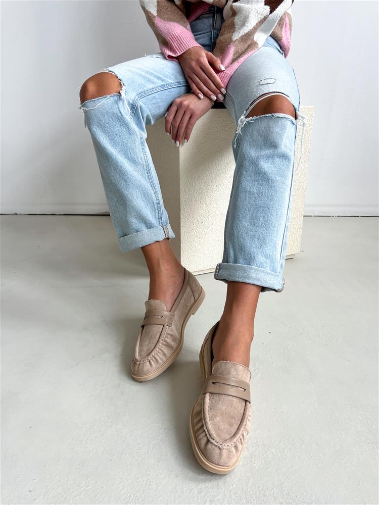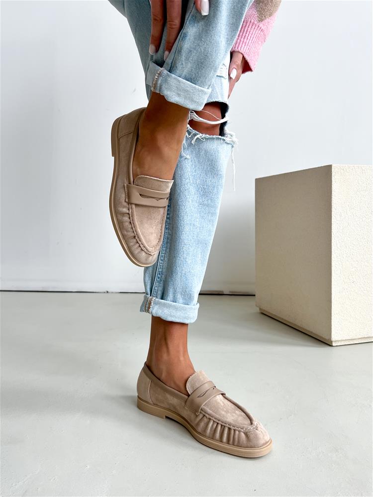 Semišové mokasíny na nízkej podrážke. Zvršok je zdobený s nariaseným prešitím a ozdobným koženkovým putkom.