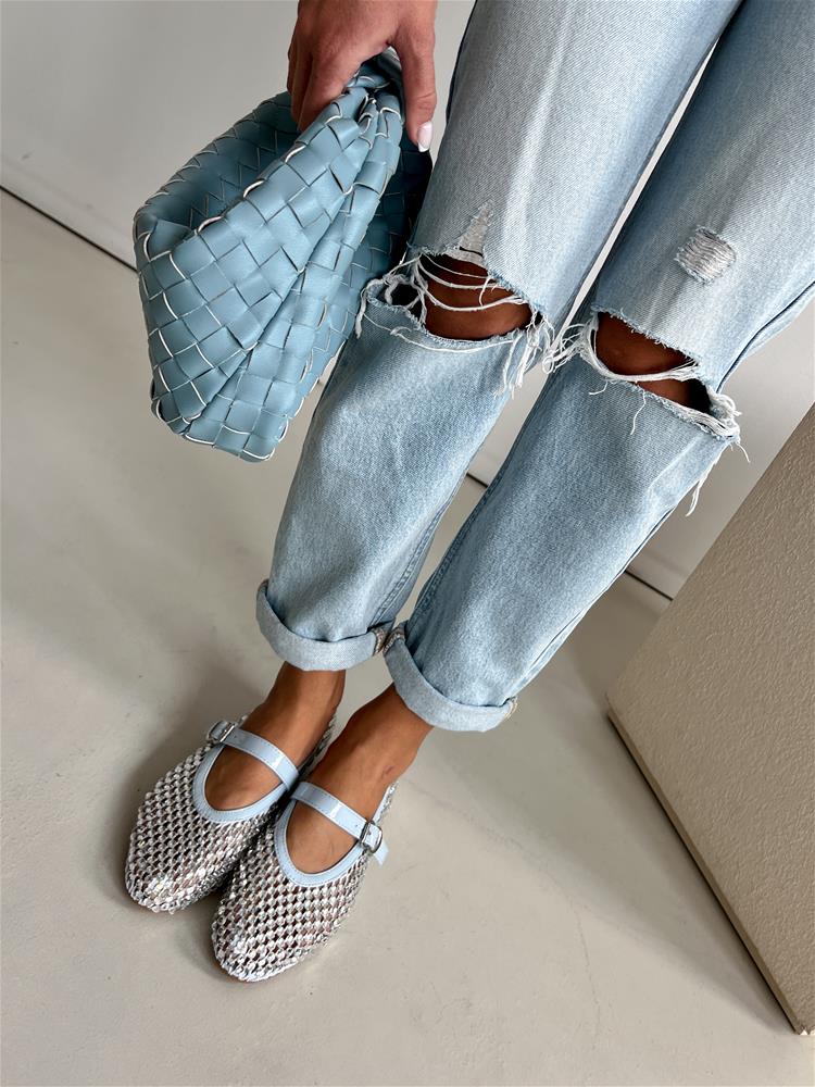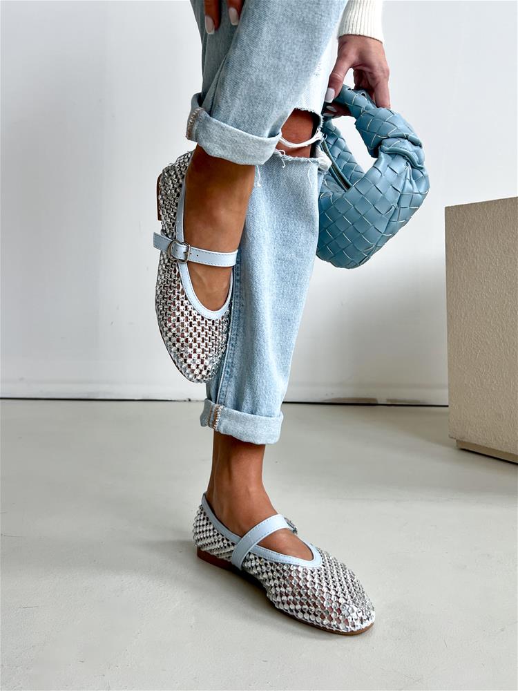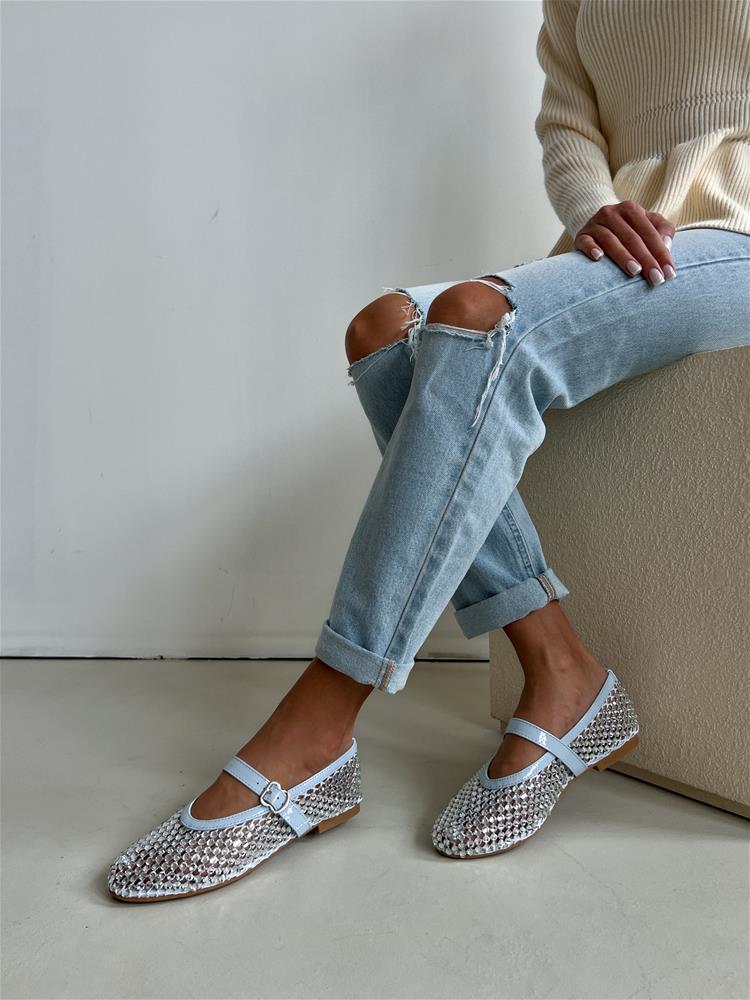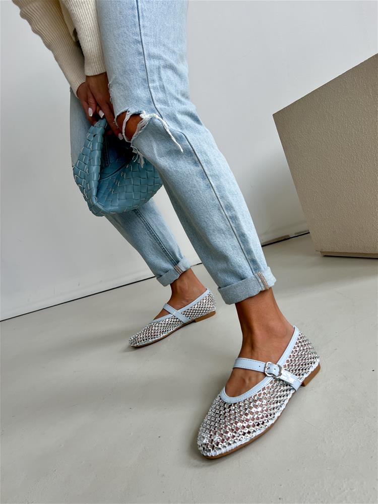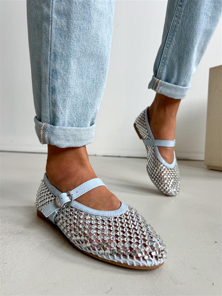 Nízke topánky na rovnej podrážke. Predná časť je okruhlého tvaru. Zvršok je z čiernej pevnej sietoviny, zdobené výraznými štrasovými kamienkami. Na vrchnej časti je lakovaný remienok s prackou na zapínanie.