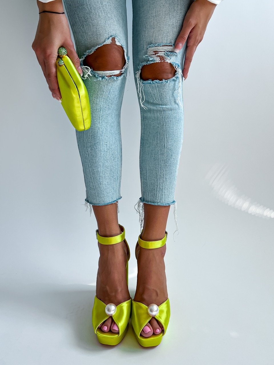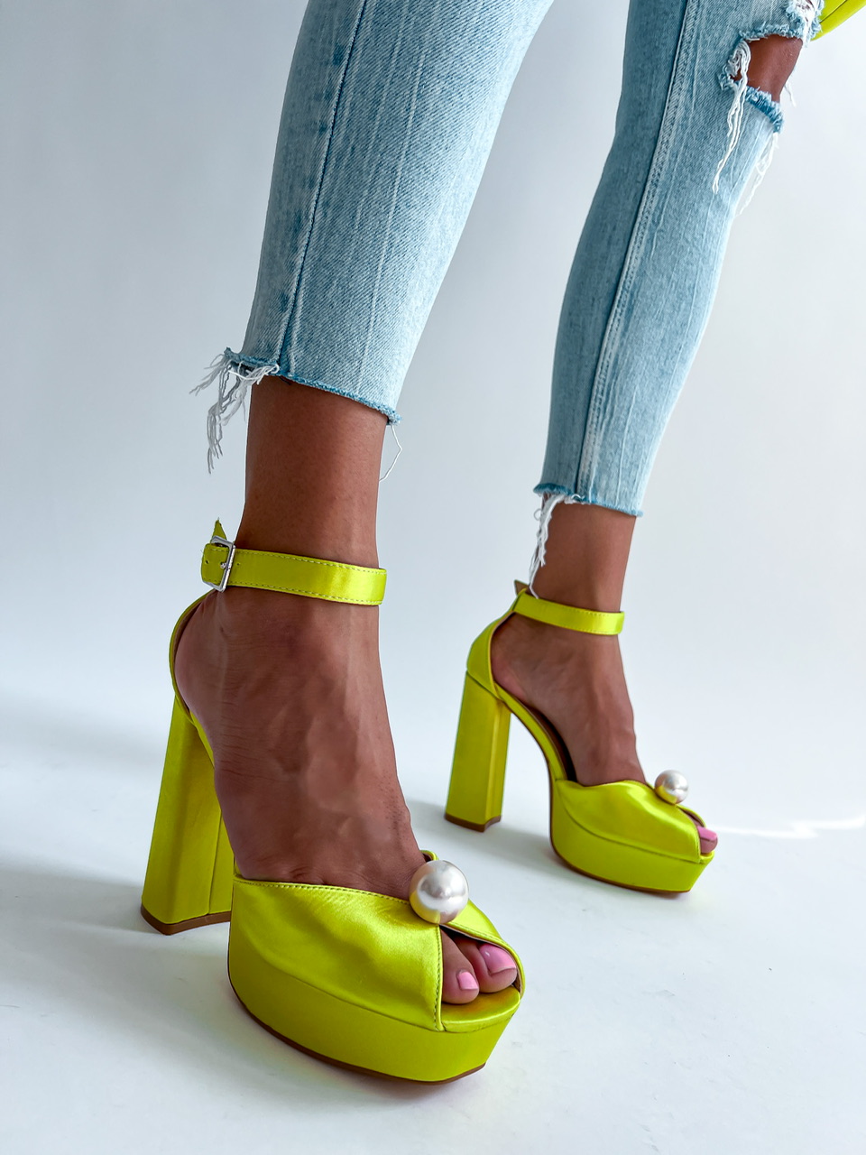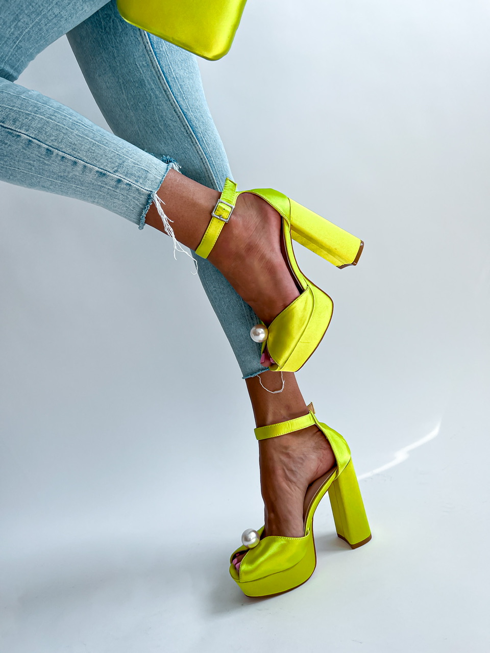 Vysoké topánky na platforme. Zvršok je potiahnutý saténom. Predná časť je zdobená výraznou perlou. Okolo členku je remienok s prackou na zapínanie.