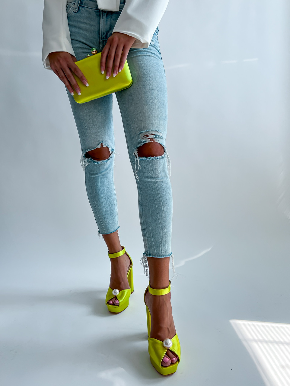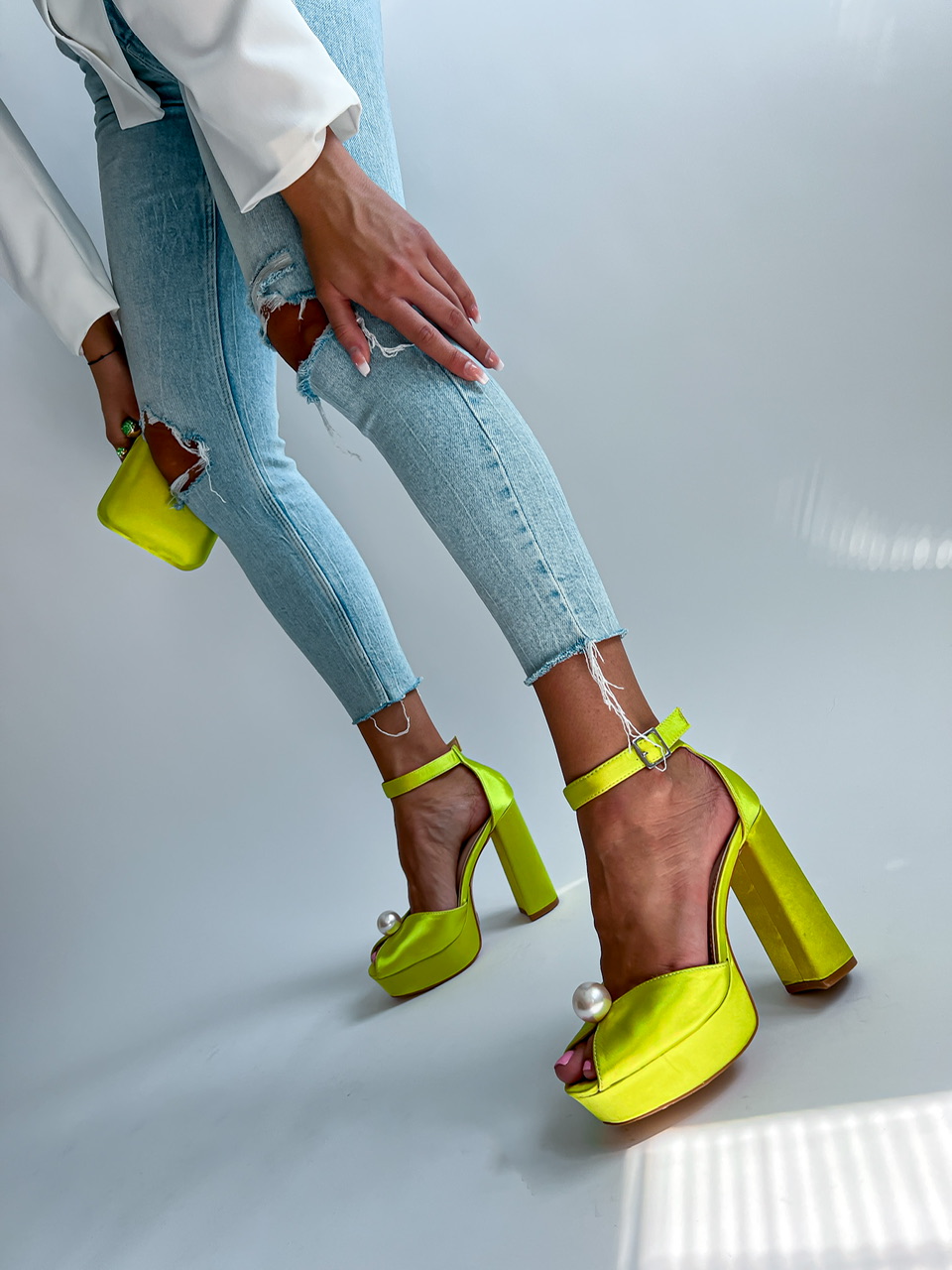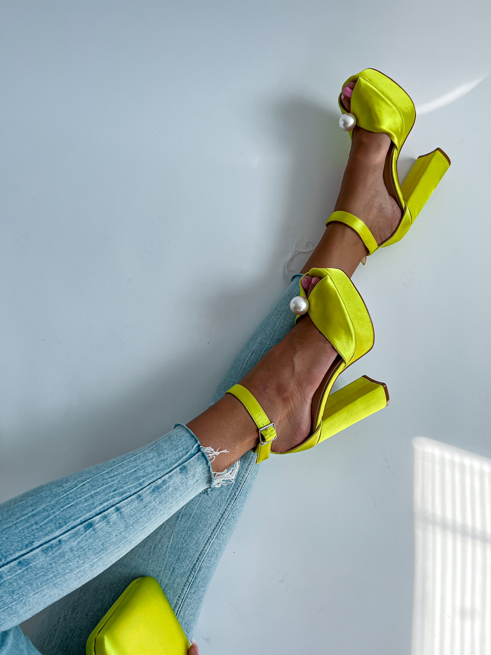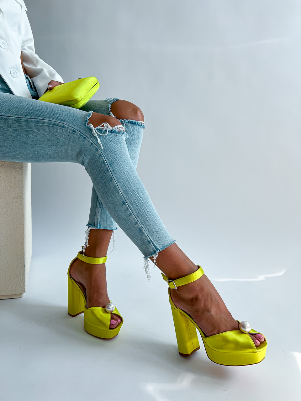 Vysoké topánky na platforme. Zvršok je potiahnutý saténom. Predná časť je zdobená výraznou perlou. Okolo členku je remienok s prackou na zapínanie.