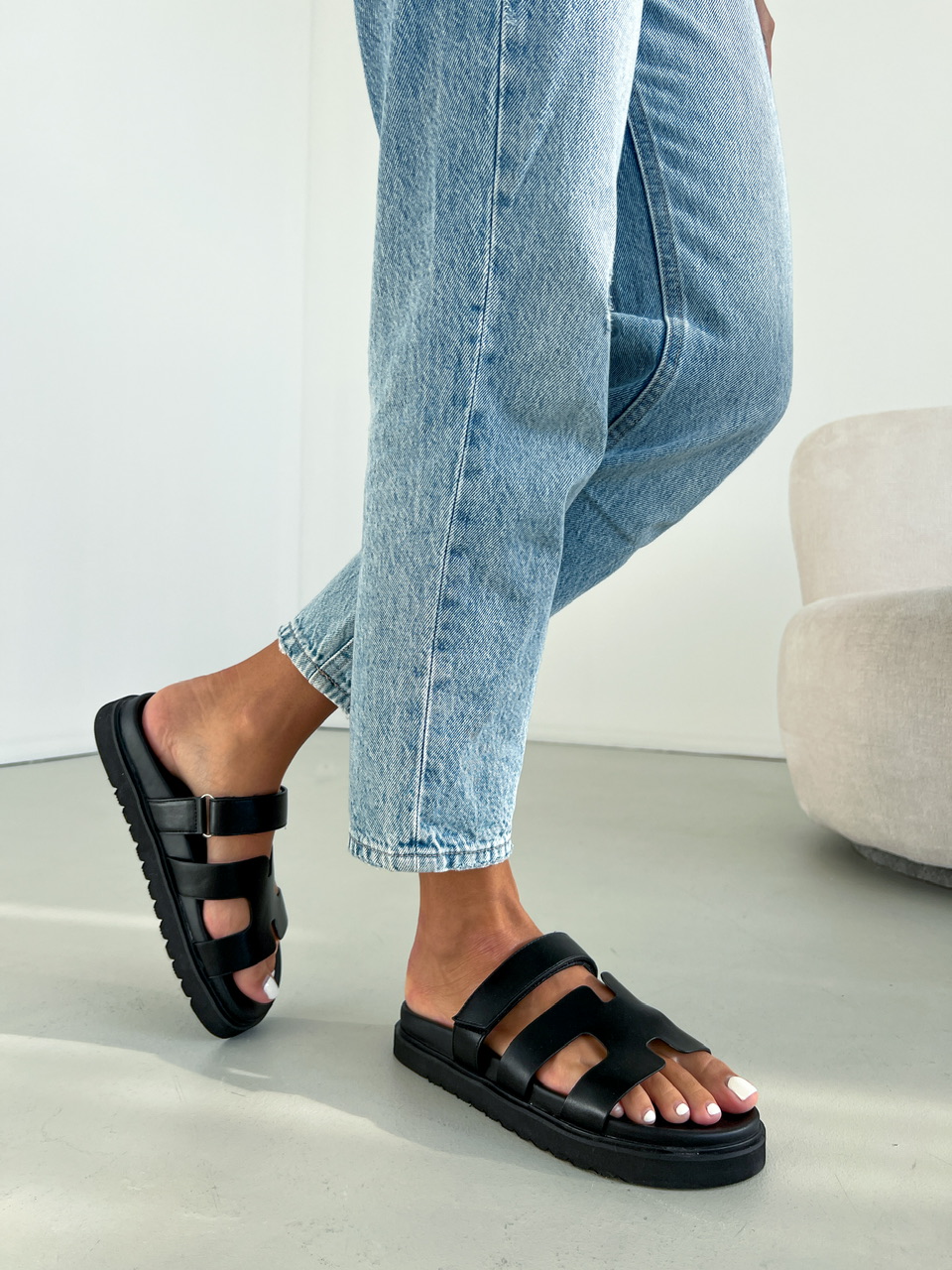 Nízke šľapky na výraznej čiernej podrážke. Zvršok sa skladá z dvoch častí. Jedna časť má suchý zips, ktorý sa dá prispôsobiť.