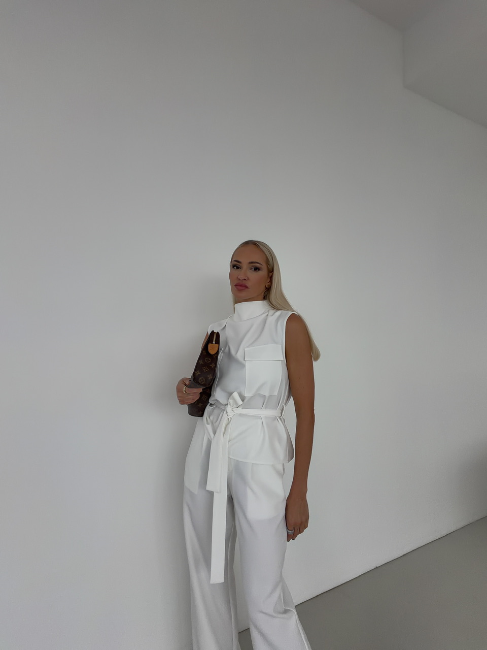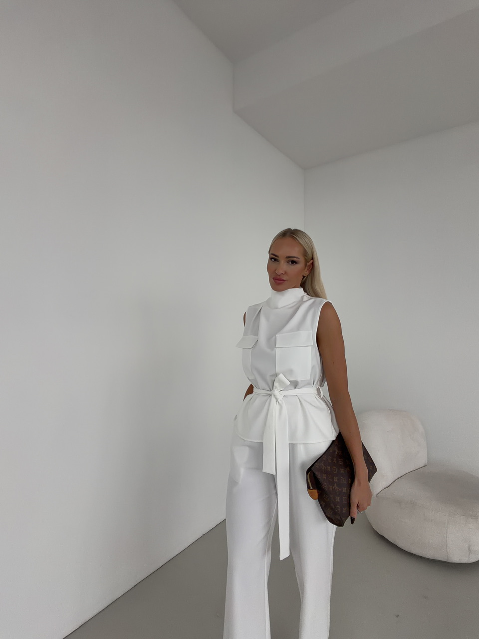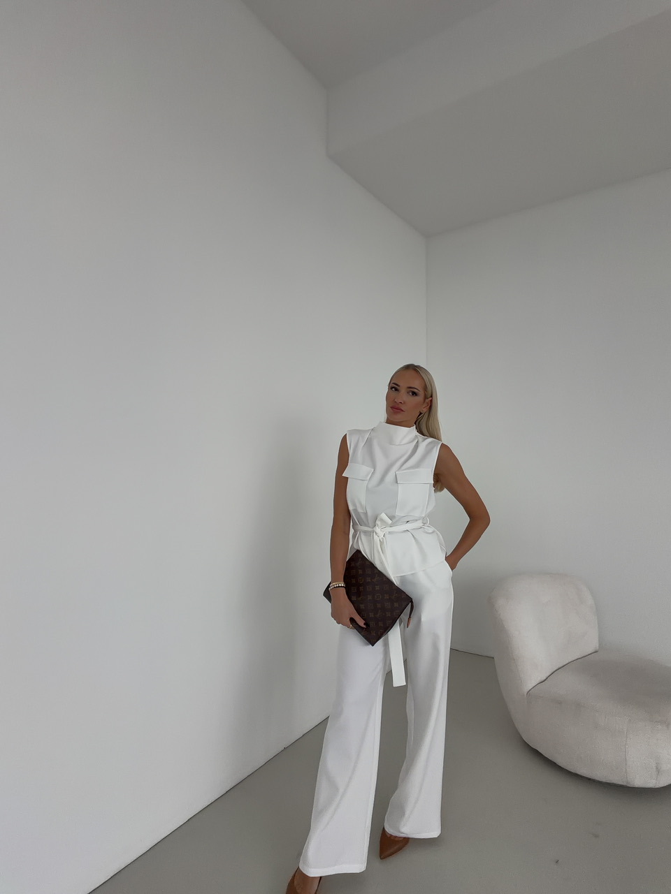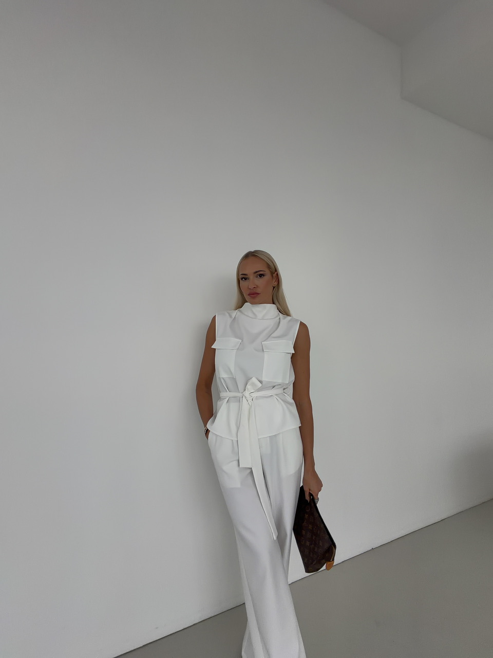 Elegantná vesta, ktorú si jednoducho prispôsobíte podľa svojej postavy. Vďaka opasku na viazanie krásne zvýrazní pás a umožní nastaviť si ju presne podľa potreby. Dve náprsné vrecká dodávajú veste moderný, mierne utilitárny vzhľad. Zadné zapínanie na gombík zaisťuje pohodlné obliekanie a zároveň pôsobí ako štýlový detail. Vesta je ideálna na vrstvenie a skvele doplní ležérne aj elegantnejšie outfity.