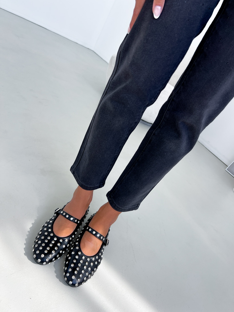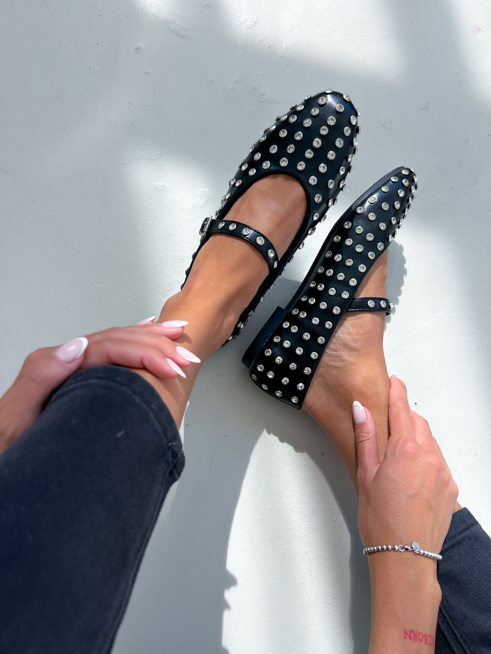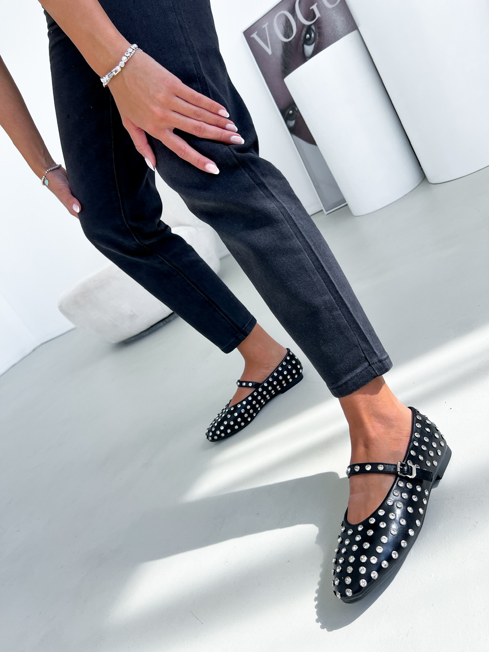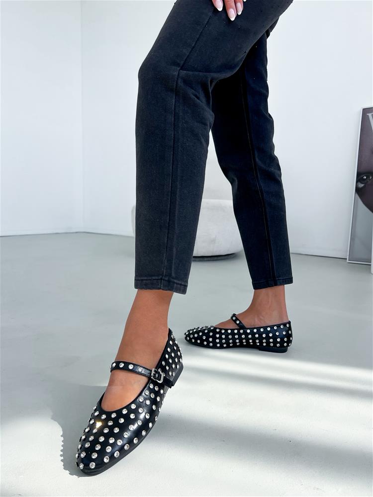 Nízke topánky na rovnej podrážke. Predná časť je okruhlého tvaru. Zvršok je zdobený výraznými štrasovými kamienkami. Na vrchnej časti je remienok so striebornou prackou na zapínanie.