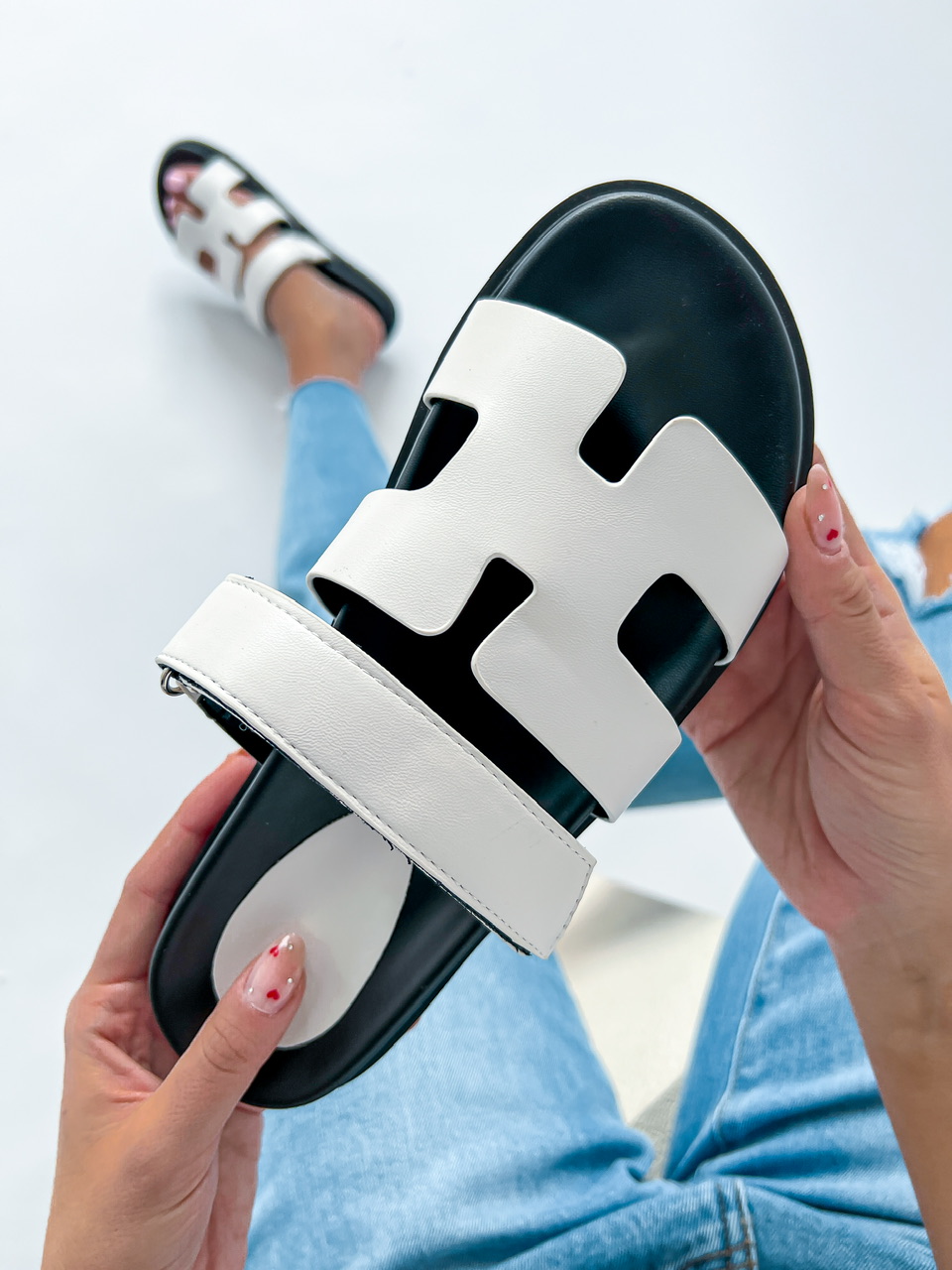 Nízke šľapky na výraznej čiernej podrážke. Zvršok sa skladá z dvoch častí. Jedna časť má suchý zips, ktorý sa dá prispôsobiť.