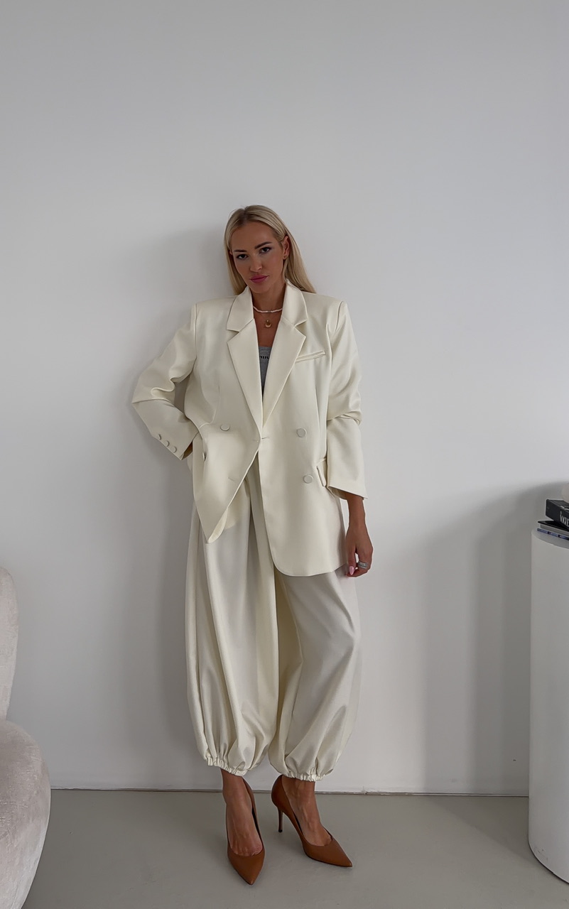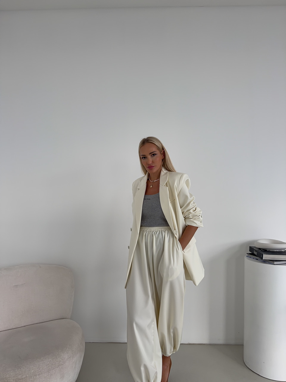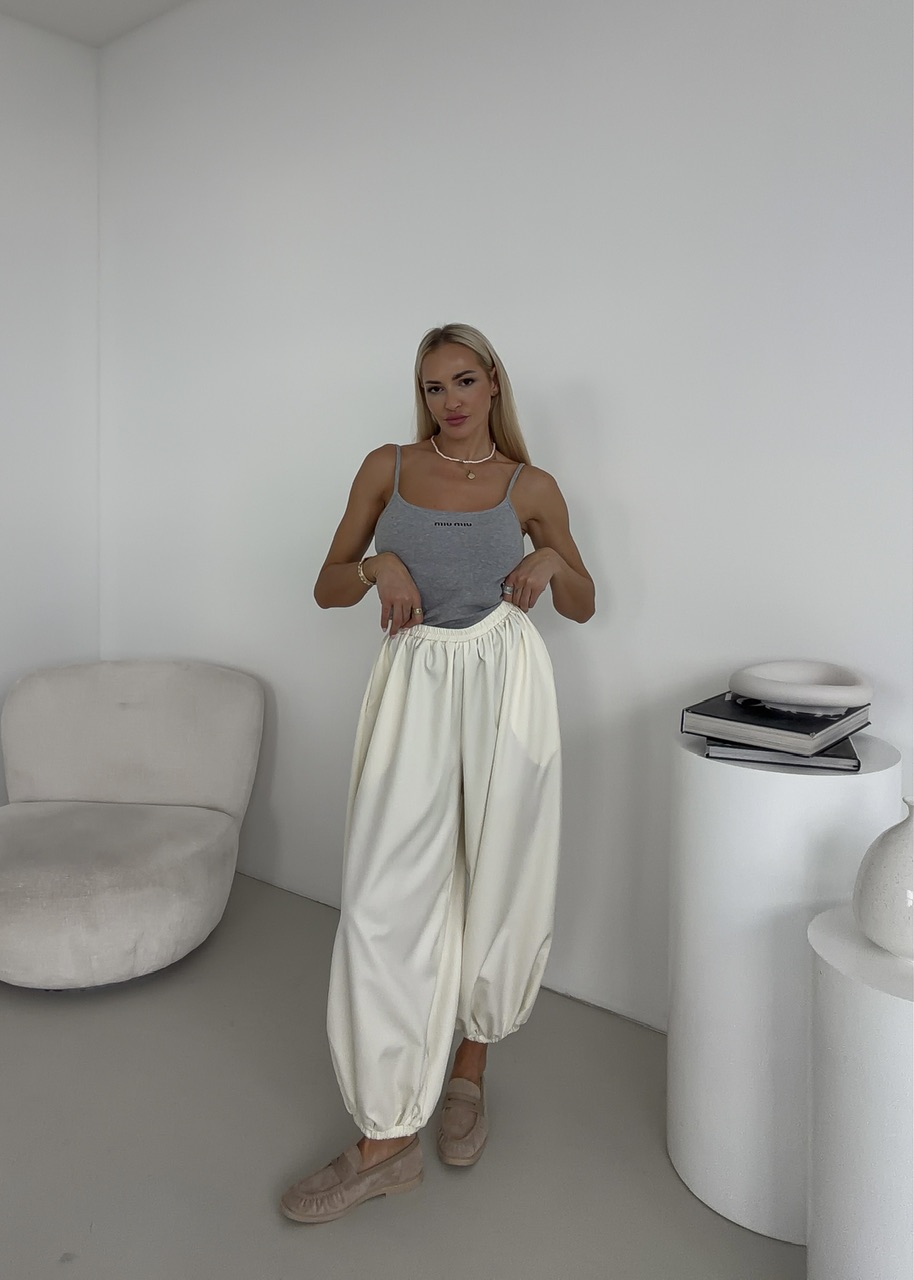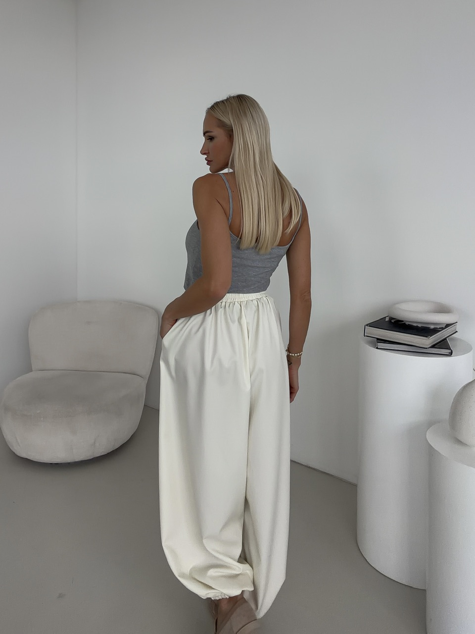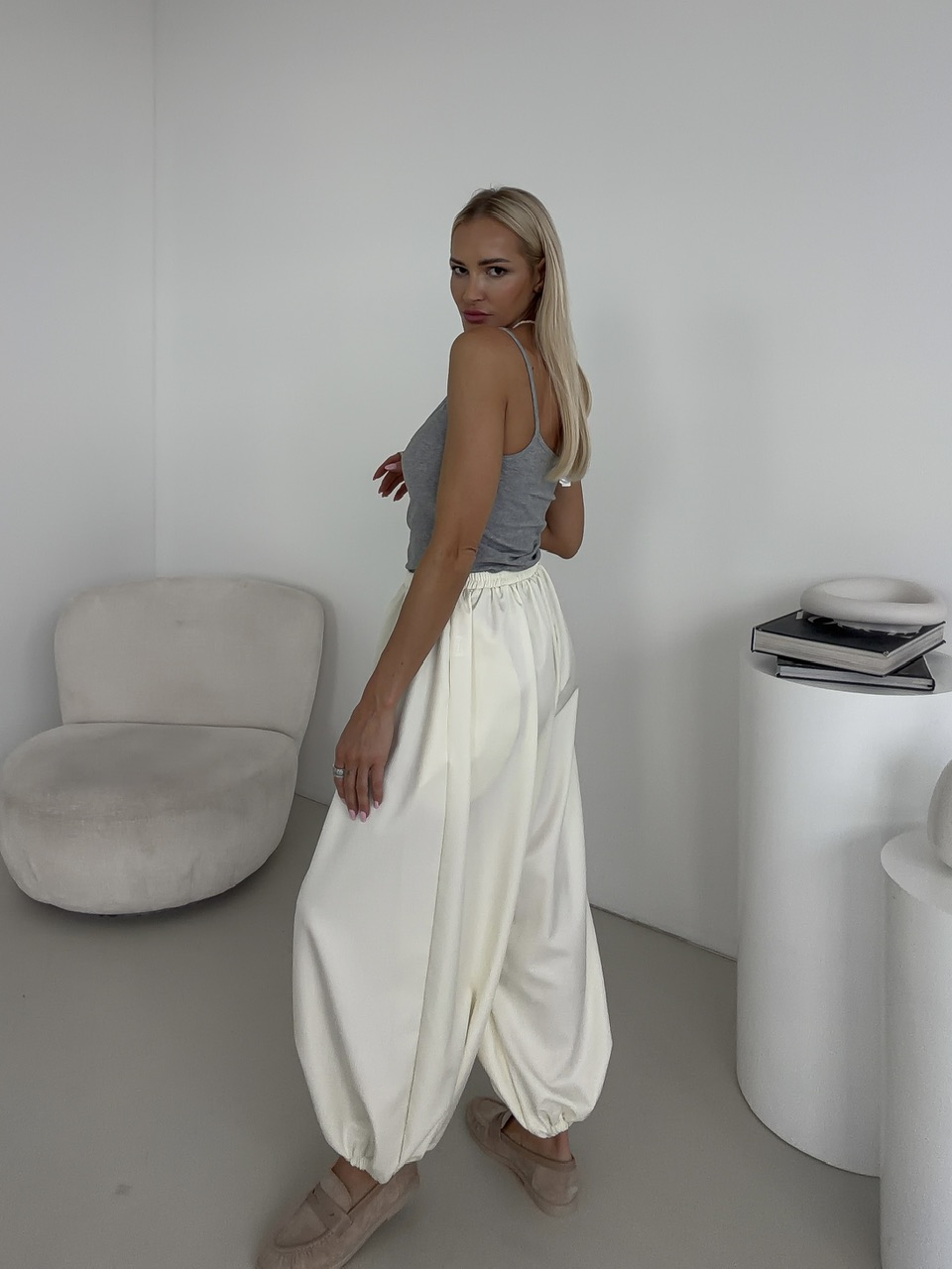 Moderné baggy nohavice ponúkajú maximálny komfort a súčasne výrazný módny štýl. Elastický pás zaručuje pohodlné nosenie, zatiaľ čo stiahnutie na spodku nohavíc vytvára jemný balónový efekt a dodáva nohaviciam hravú siluetu. Bočné vrecká poskytujú praktický priestor na drobnosti a zároveň dopĺňajú celkový dizajn nohavíc. Tento univerzálny model je ideálny na každodenné nosenie, do práce aj na voľný čas, keď chcete spojiť pohodlie s trendovým vzhľadom.