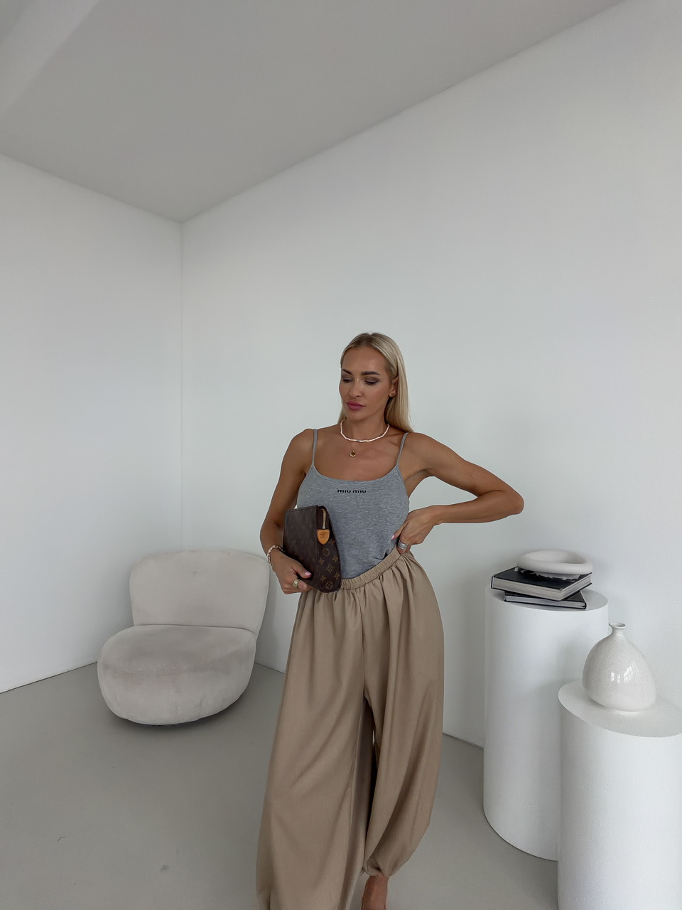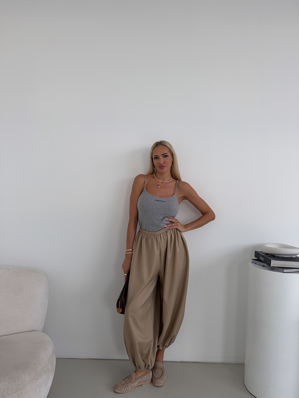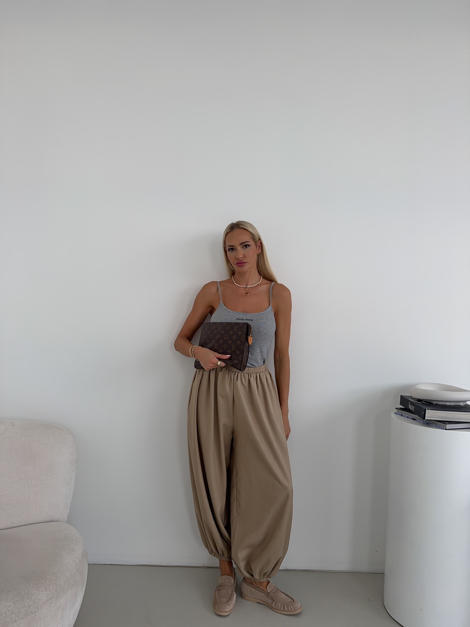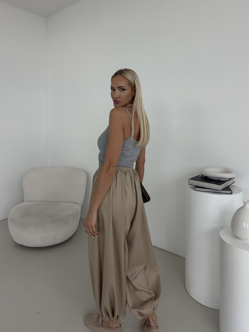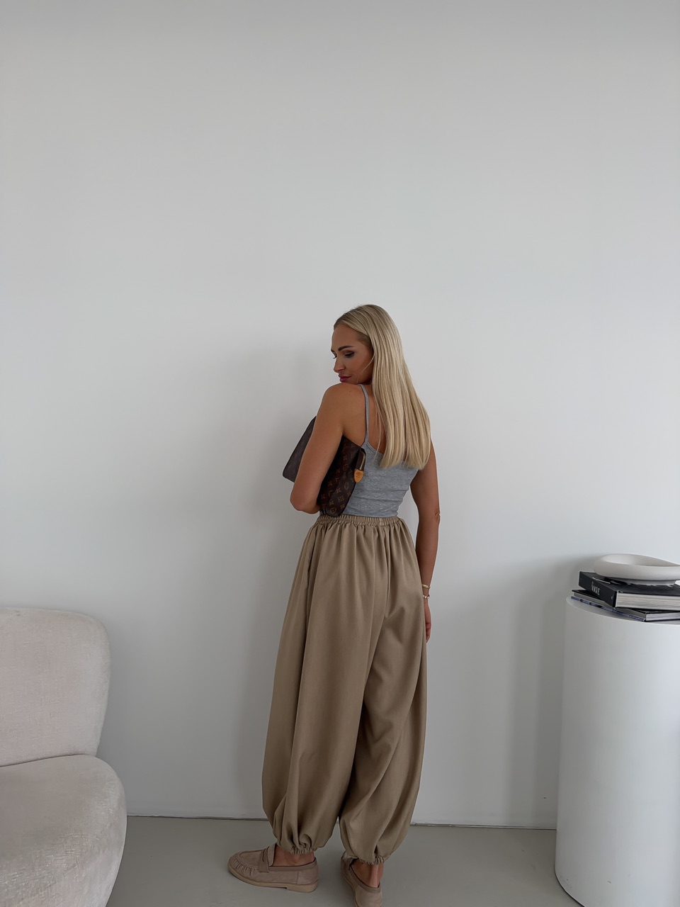 Moderné baggy nohavice ponúkajú maximálny komfort a súčasne výrazný módny štýl. Elastický pás zaručuje pohodlné nosenie, zatiaľ čo stiahnutie na spodku nohavíc vytvára jemný balónový efekt a dodáva nohaviciam hravú siluetu. Bočné vrecká poskytujú praktický priestor na drobnosti a zároveň dopĺňajú celkový dizajn nohavíc. Tento univerzálny model je ideálny na každodenné nosenie, do práce aj na voľný čas, keď chcete spojiť pohodlie s trendovým vzhľadom.