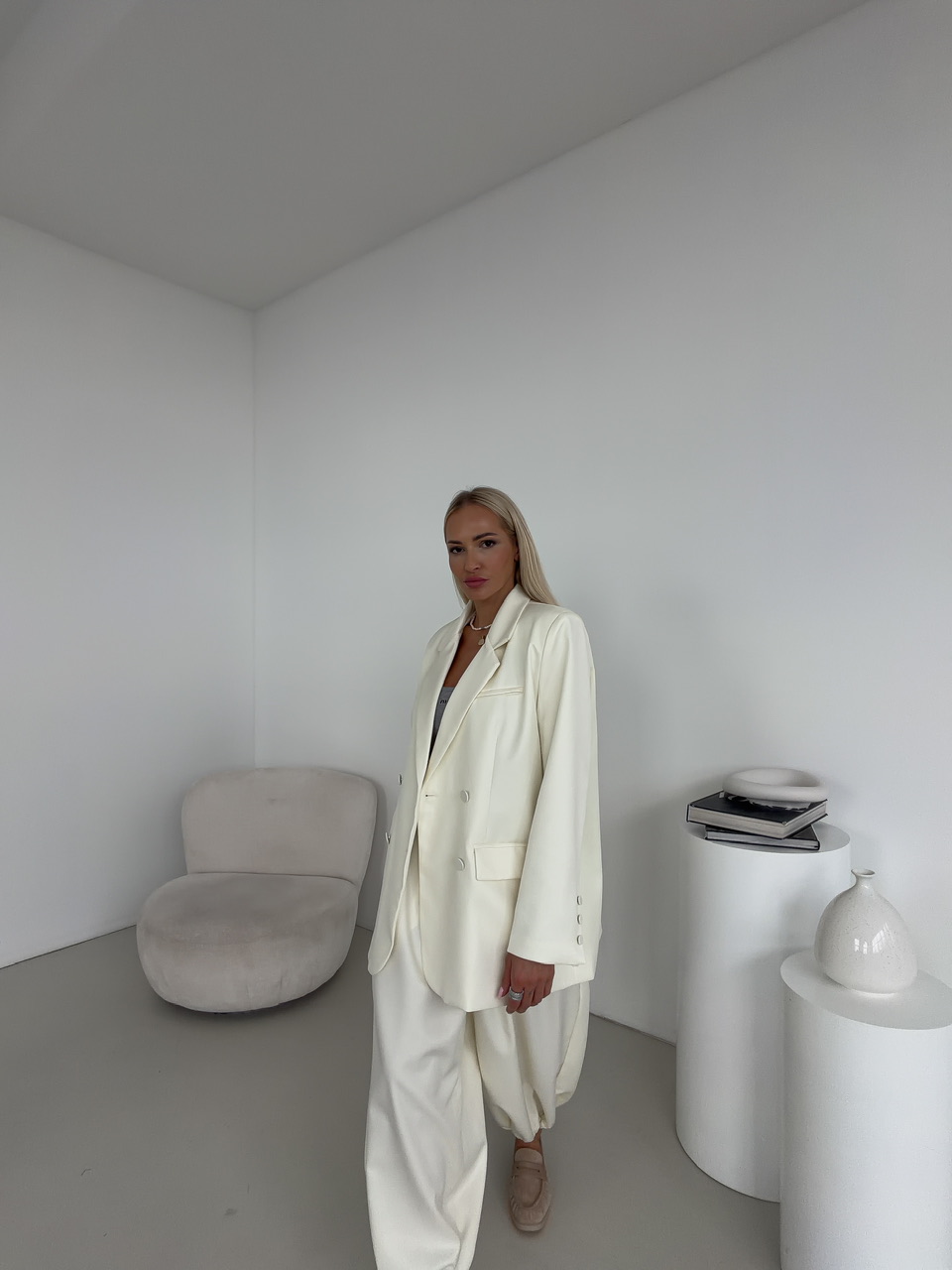 Štýlové dámske sako s dvojradovým zapínaním na gombíky prináša nadčasový a elegantný vzhľad vhodný do práce aj na spoločenské príležitosti. Vypchávky na pleciach jemne zvýrazňujú siluetu a dodávajú outfitu štruktúrovaný, sofistikovaný charakter. Sako je doplnené o falošné náprsné vrecko, ktoré podčiarkuje klasický dizajn, a dve praktické predné vrecká, ktoré kombinujú funkčnosť s moderným štýlom.