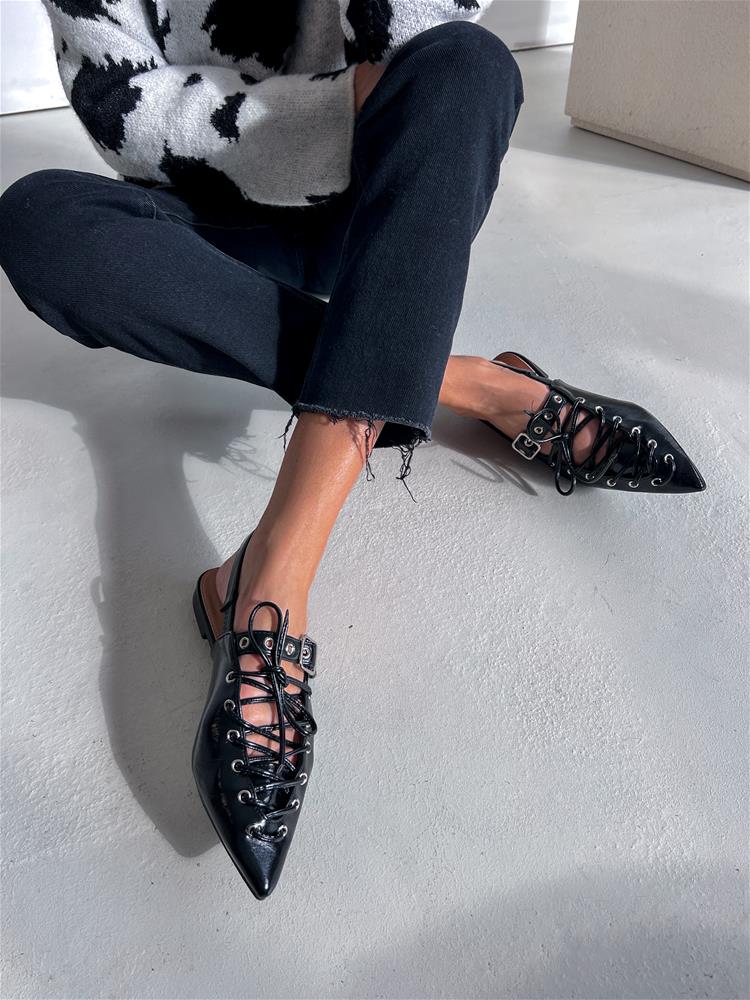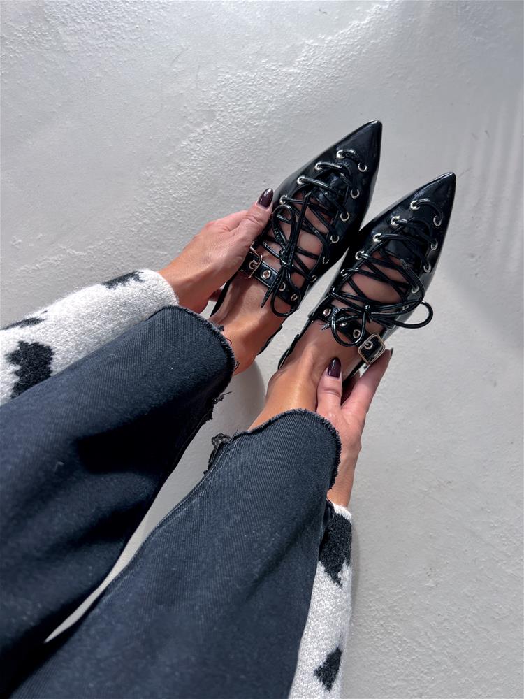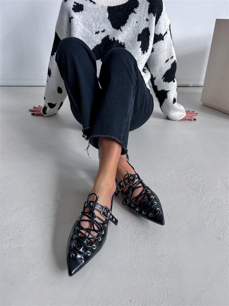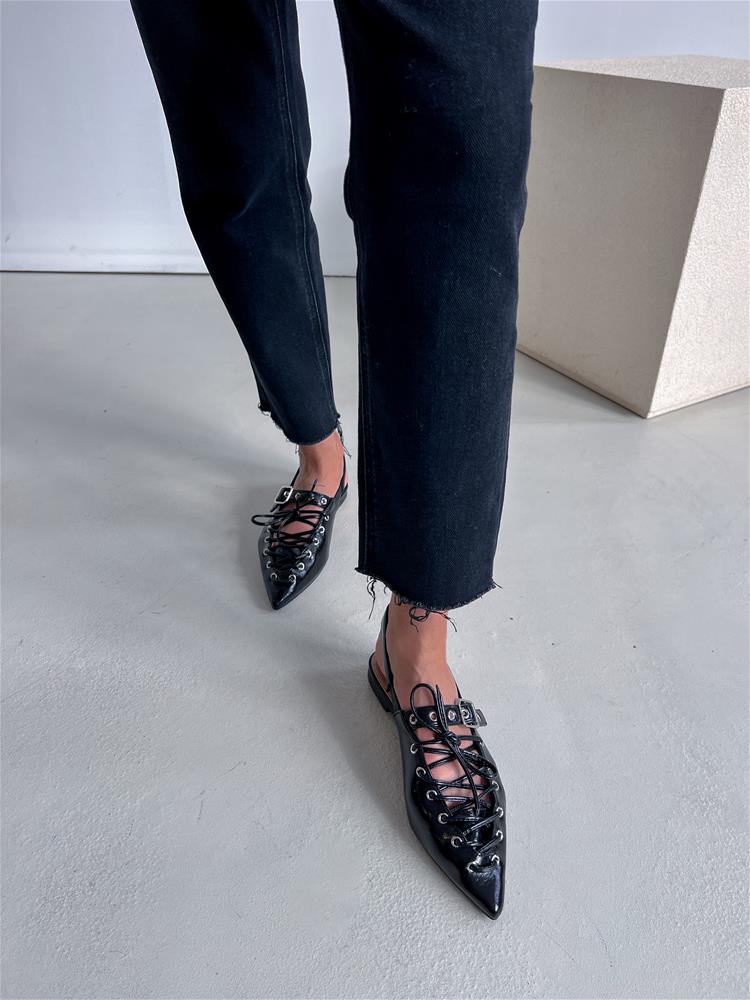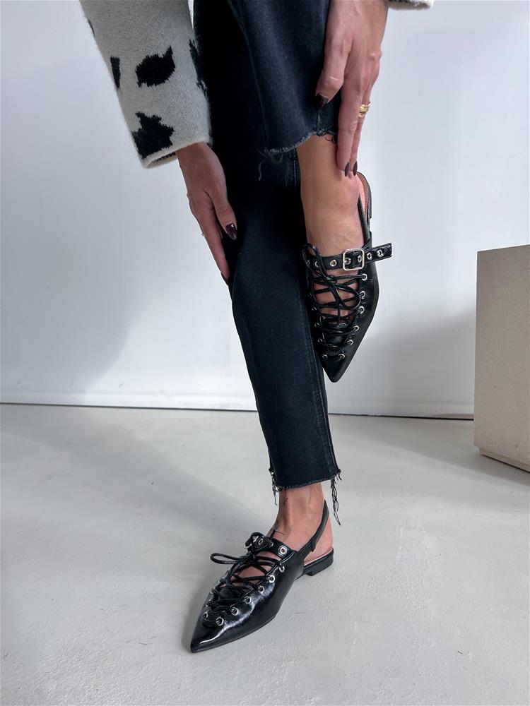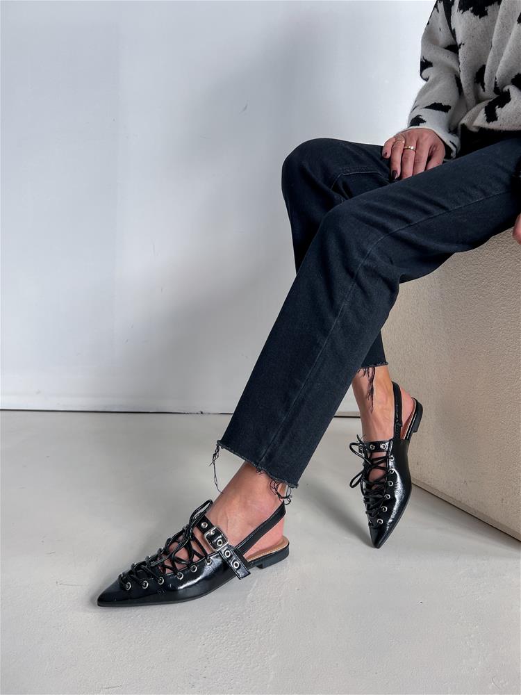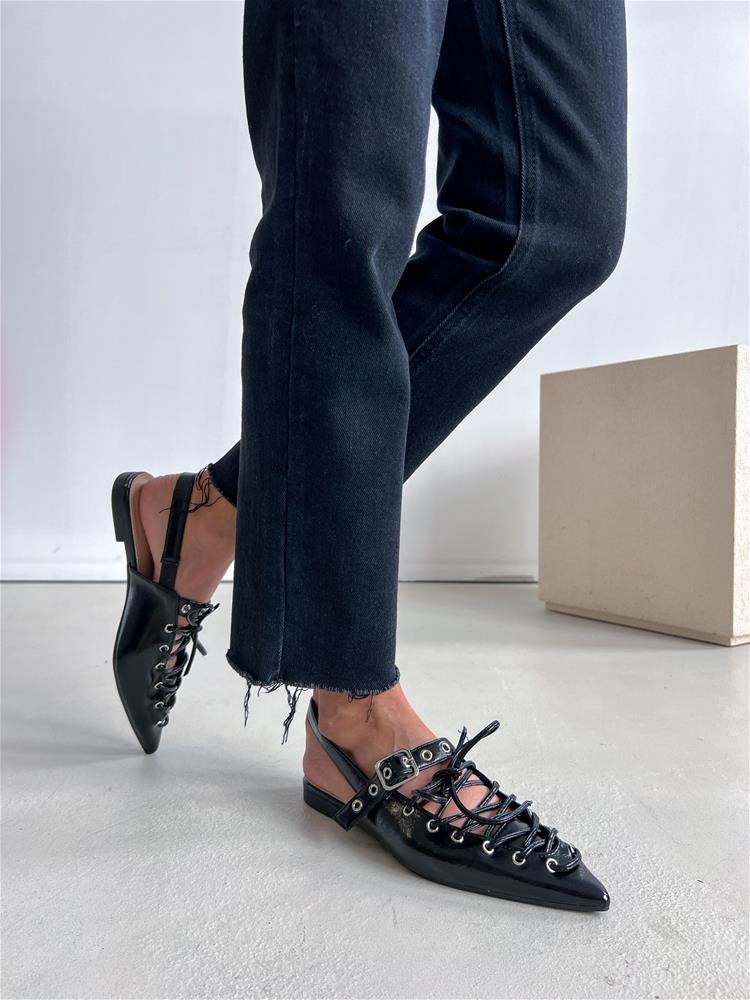 Nízke topánky na rovnej podrážke. Zadná časť päty je otvorená. Predná časť je zdobená šnurovaním a vybíjaným remienkom so striebornou prackou.