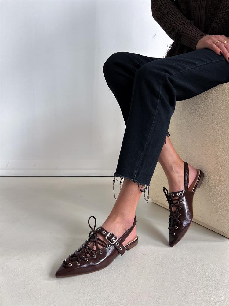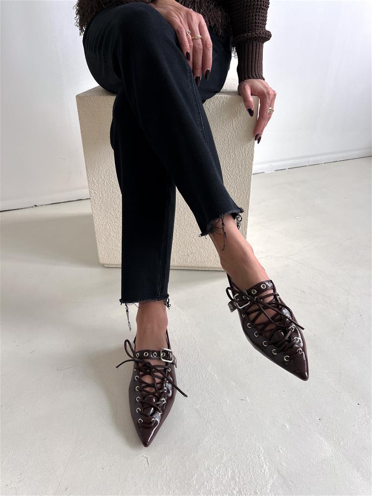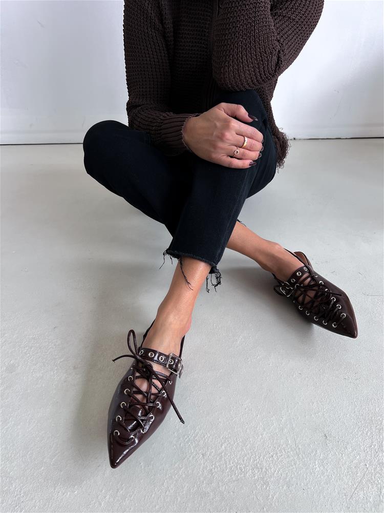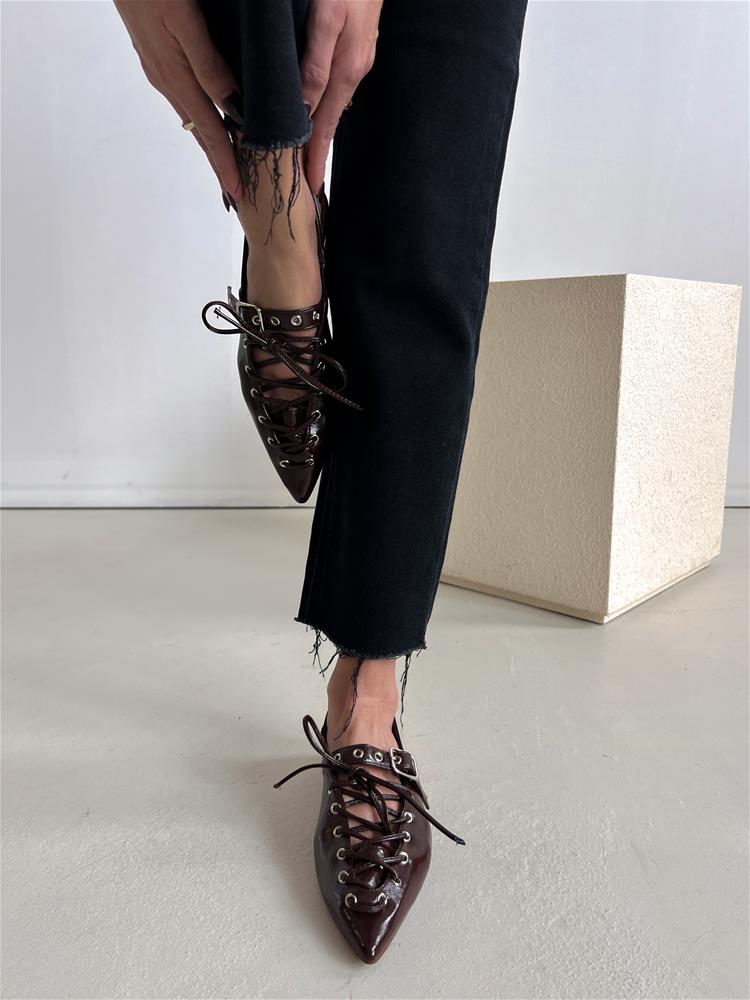 Nízke topánky na rovnej podrážke. Zadná časť päty je otvorená. Predná časť je zdobená šnurovaním a vybíjaným remienkom so striebornou prackou.