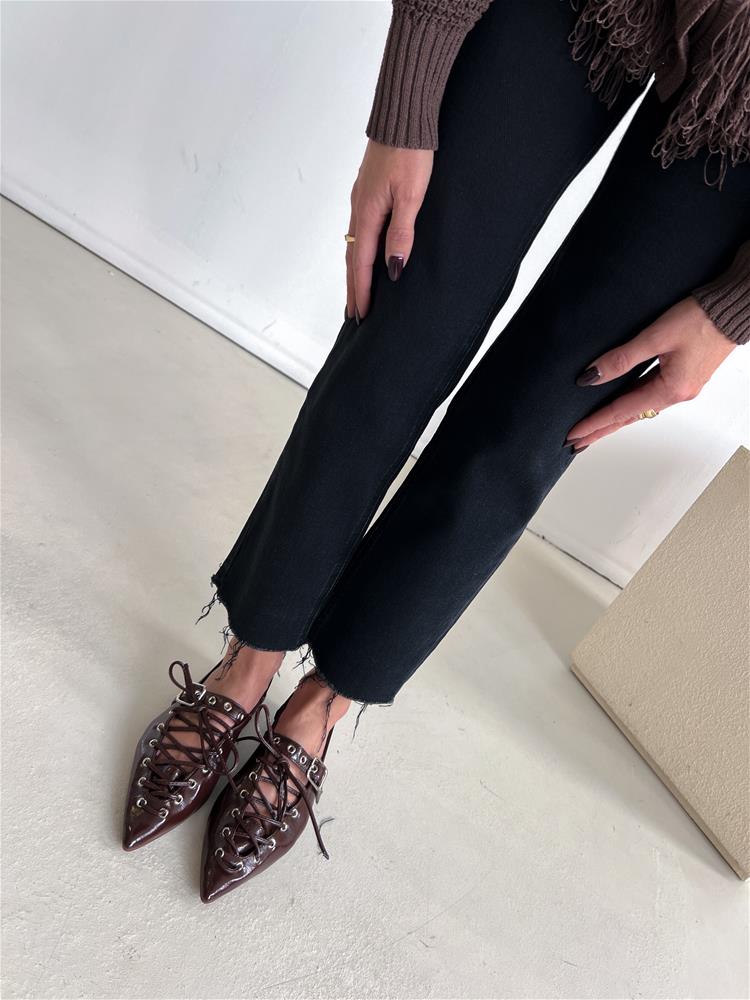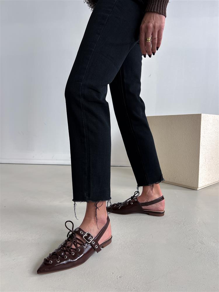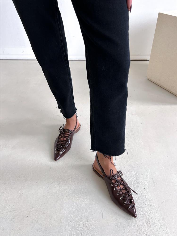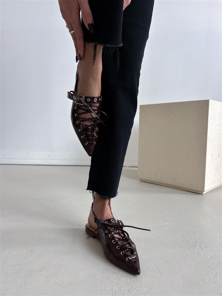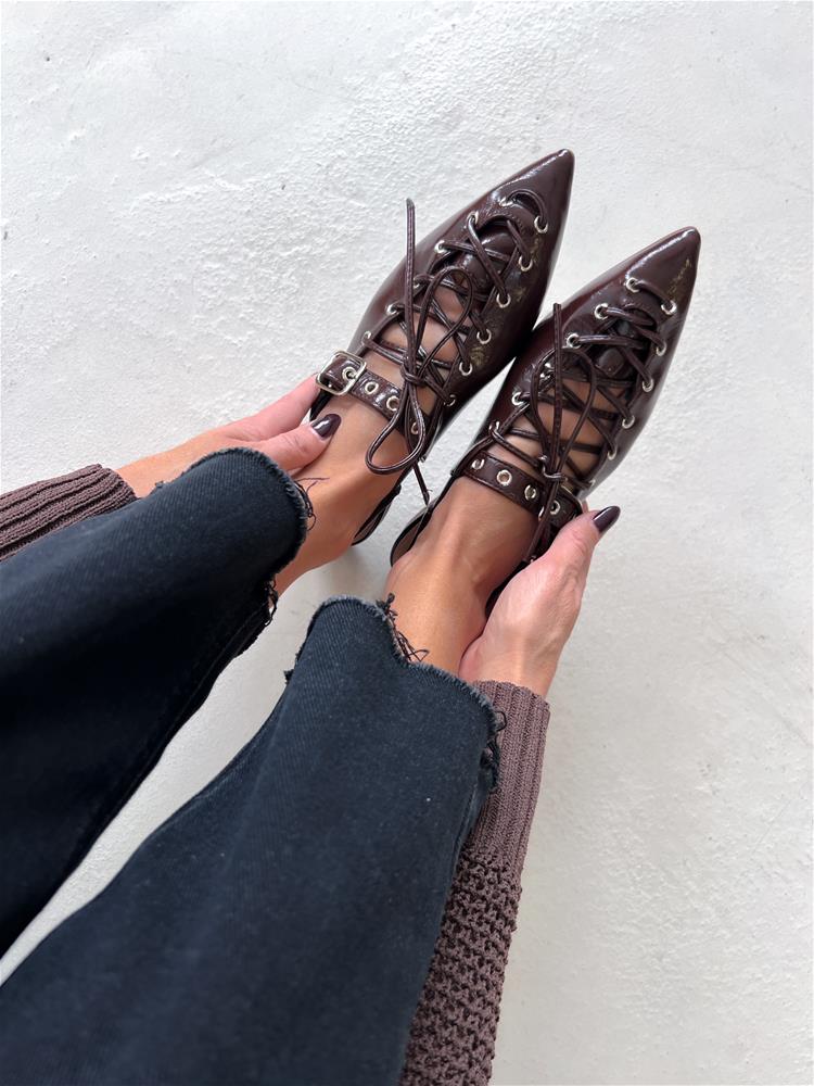 Nízke topánky na rovnej podrážke. Zadná časť päty je otvorená. Predná časť je zdobená šnurovaním a vybíjaným remienkom so striebornou prackou.