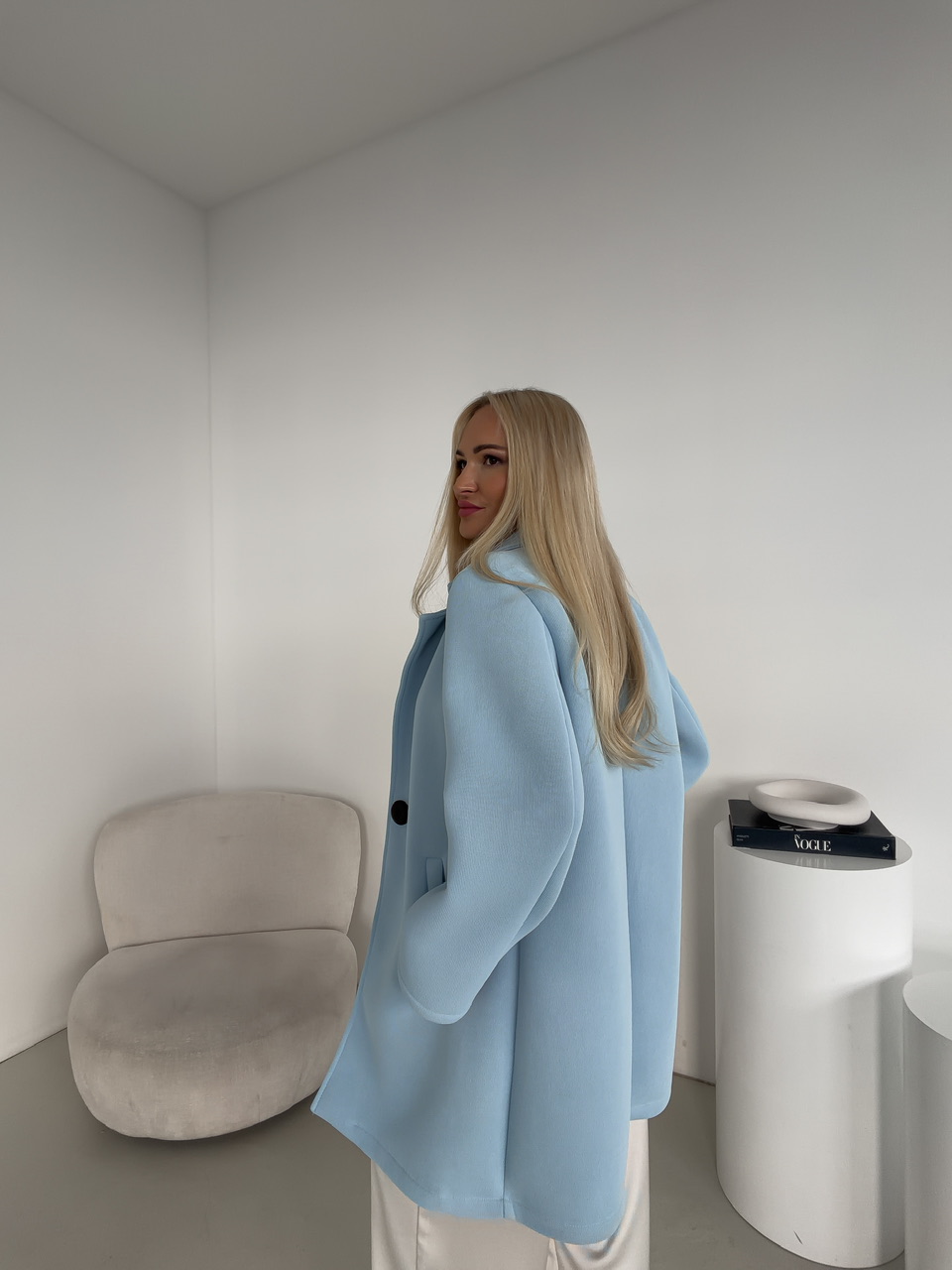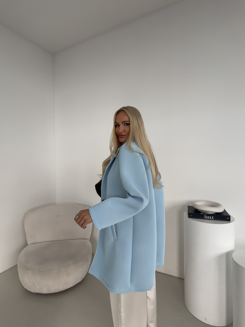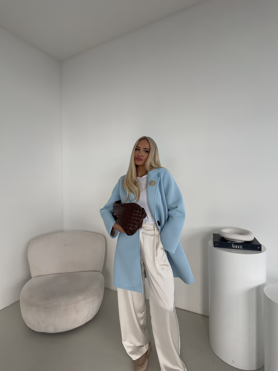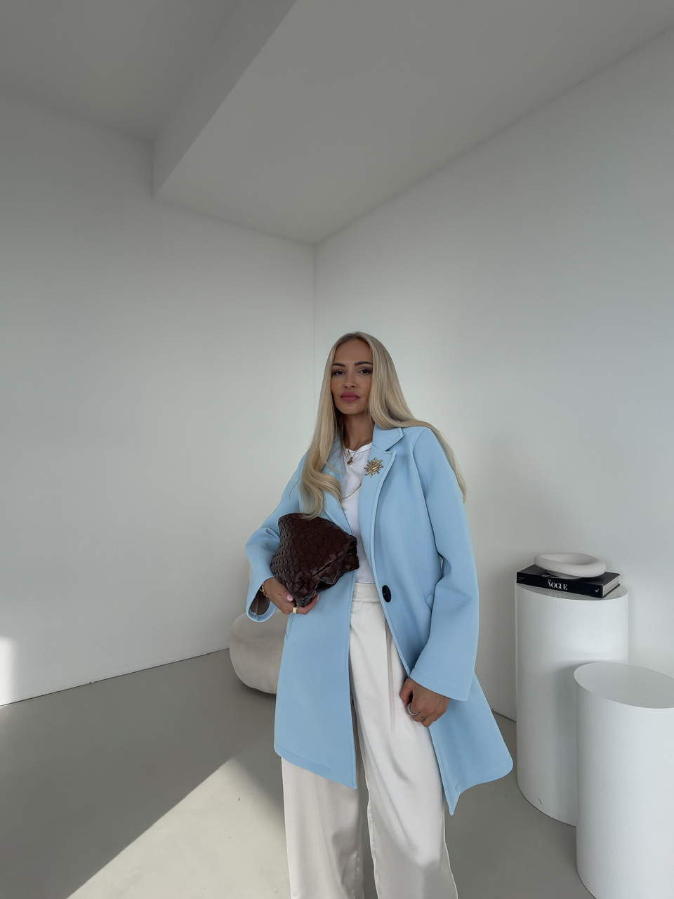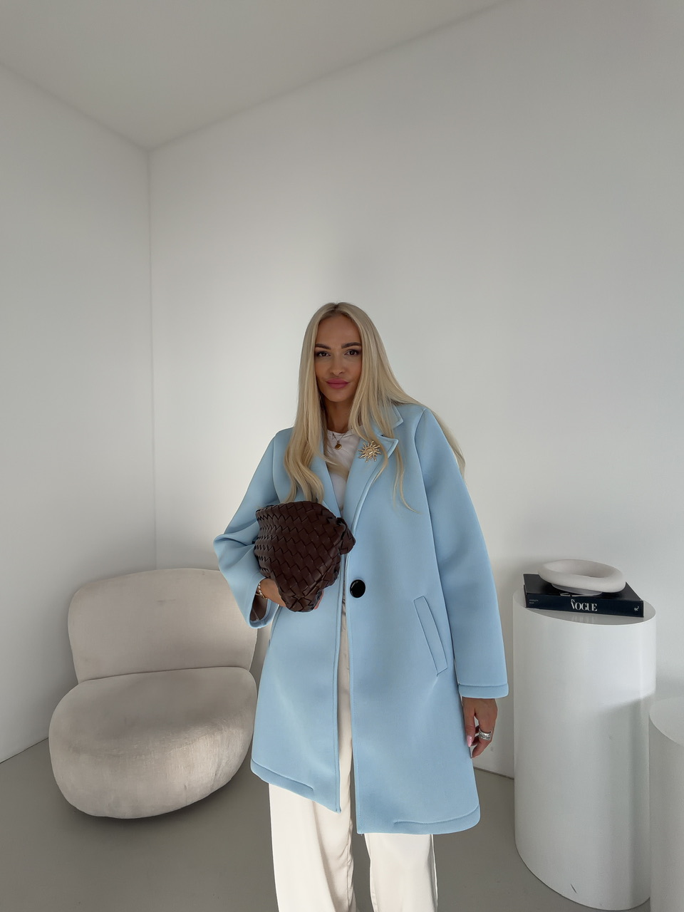 Elegantný kabát s bočnými vreckami je štýlovým kúskom, ktorý spája praktickosť s originálnym dizajnom. Kabát je vybavený funkčnými bočnými vreckami a zapína sa na jeden výrazný gombík, ktorý dodáva modelu jedinečný charakter. Dominantným detailom je dekoratívna brošňa v tvare slnka, ktorá pôsobí ako elegantný akcent a zvýrazňuje celkový vzhľad kabáta. Nadčasový strih zabezpečuje pohodlné nosenie a robí z tohto kabáta ideálnu voľbu na každodenné nosenie aj špeciálne príležitosti.