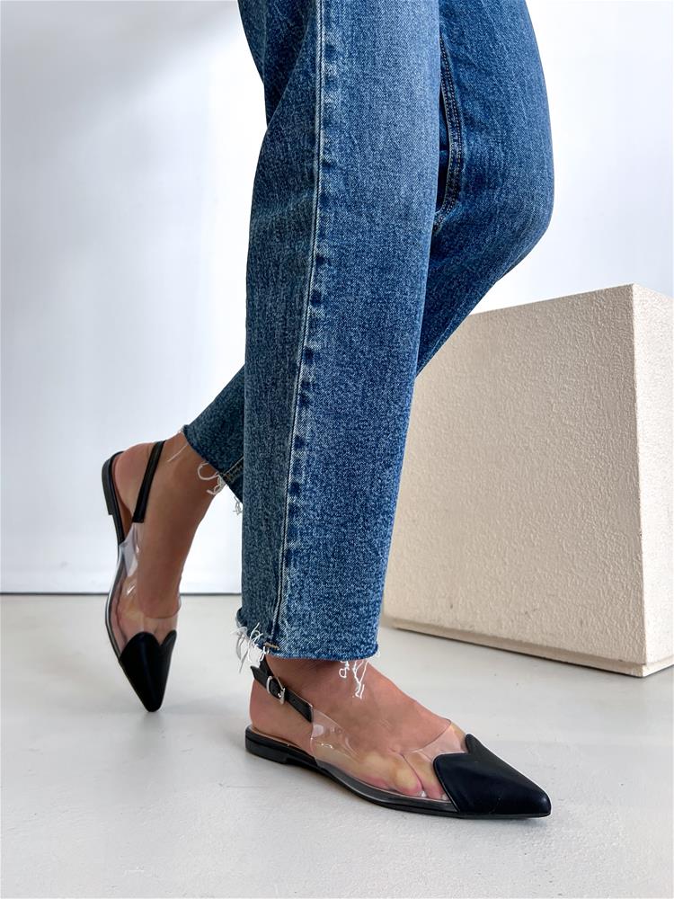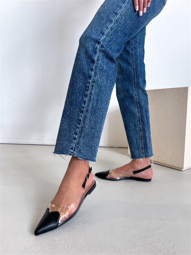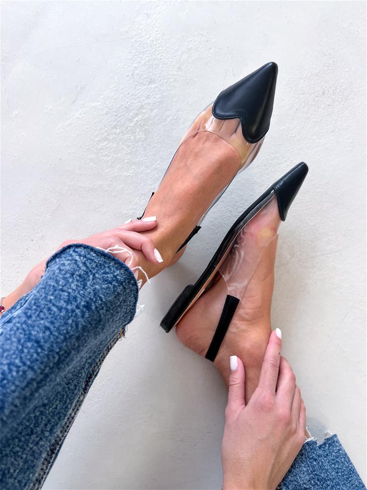 Nízke topánky na rovnej podrážke. Zvršok sa skladá z viacerých materiálov. Predná časť je špicatého tvaru. Zadná časť päty je otvorená. Okolo päty je remienok so striebornou prackou na zapínanie.