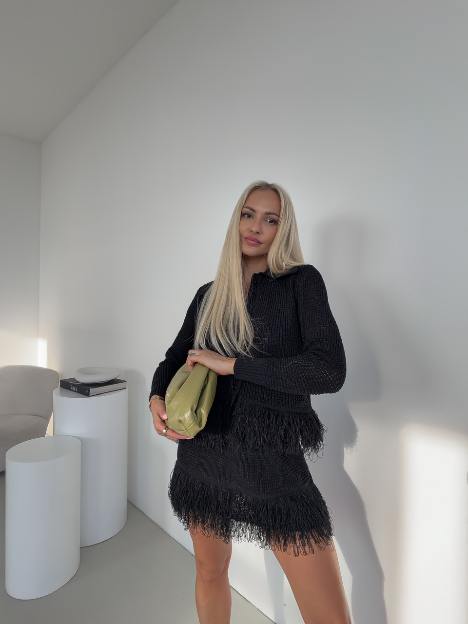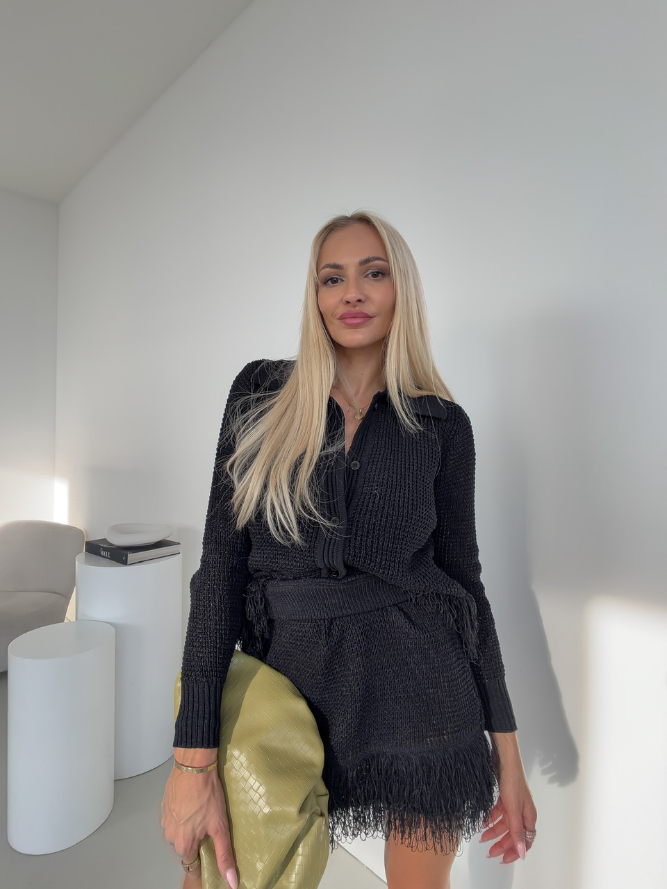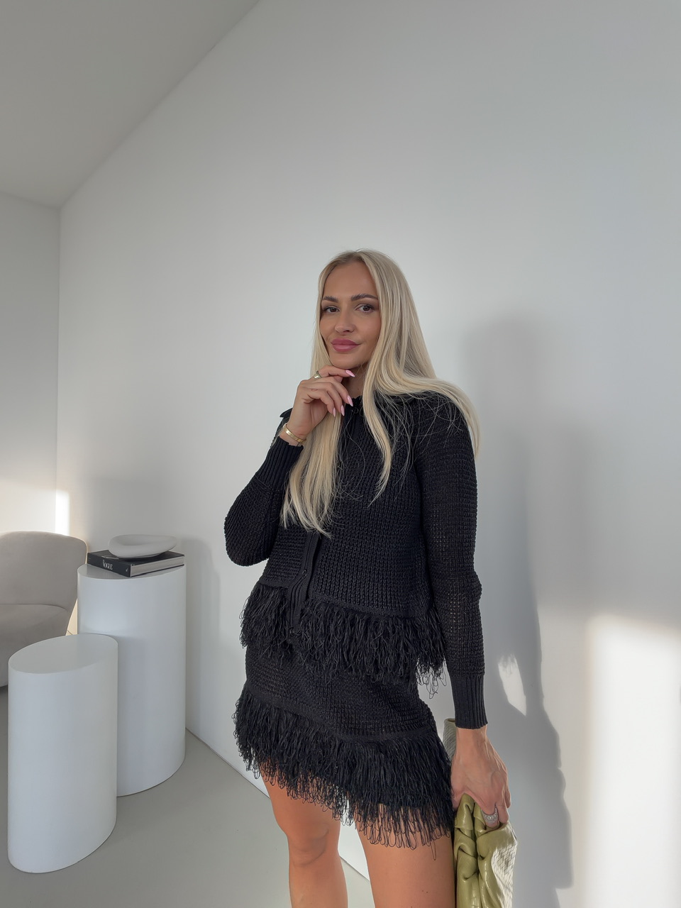 Komplet pozostávajúci zo sukne a svetra je štýlovým a zároveň pohodlným outfitom, ktorý okamžite zaujme. Sukňa s pásom na gumu sa perfektne prispôsobí postave a zaručuje komfort počas celého dňa, zatiaľ čo sveter so zapínaním na gombíky a golierom dodáva elegantný a upravený vzhľad.Oba kúsky sú doplnené jemnými strapcami na spodnej časti, čo dodáva celému setu hravý a módny nádych.