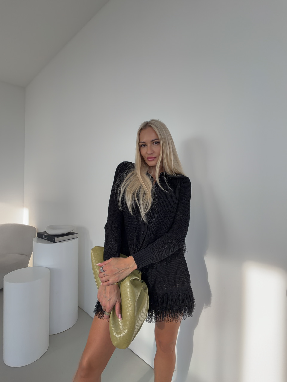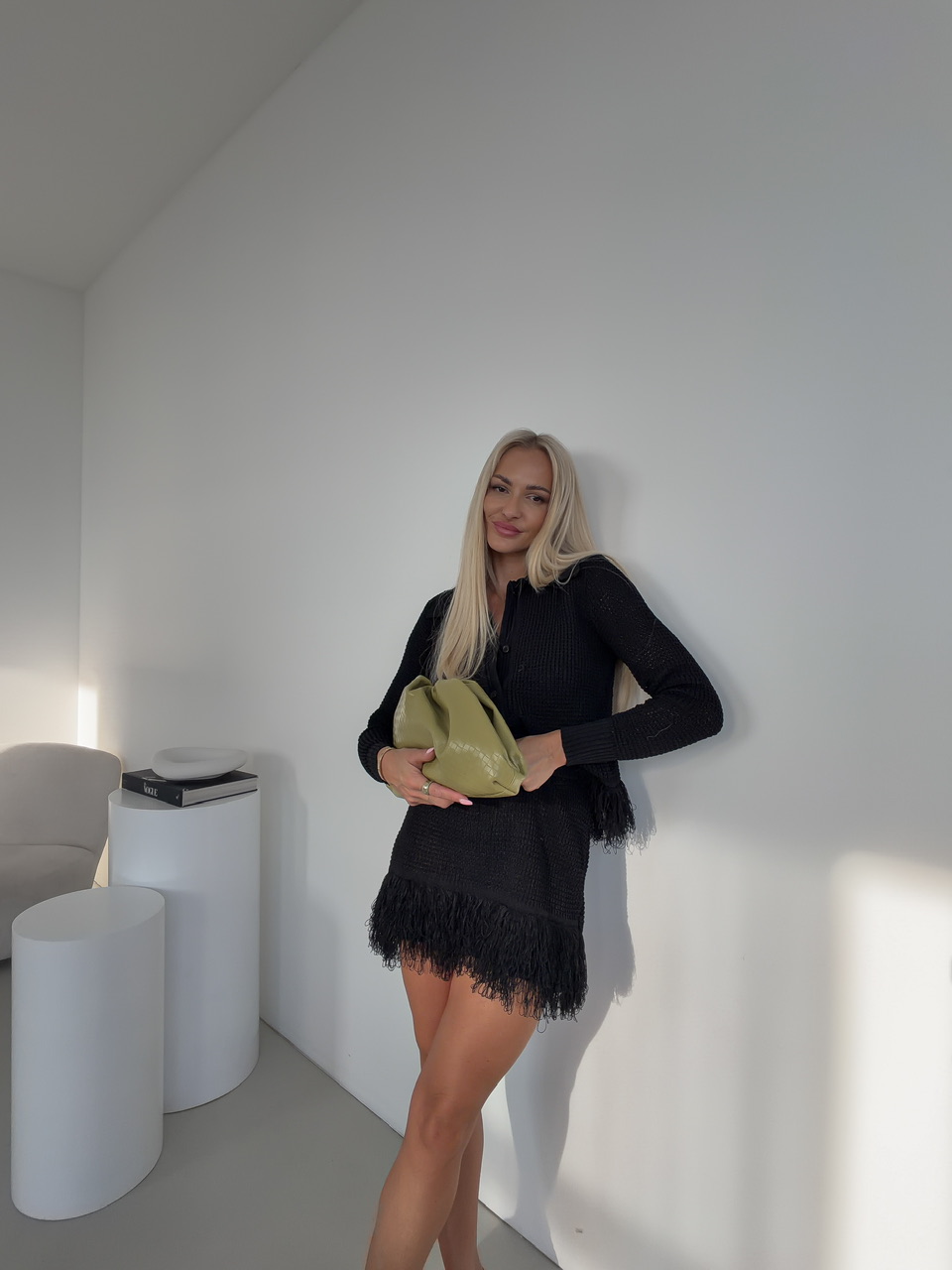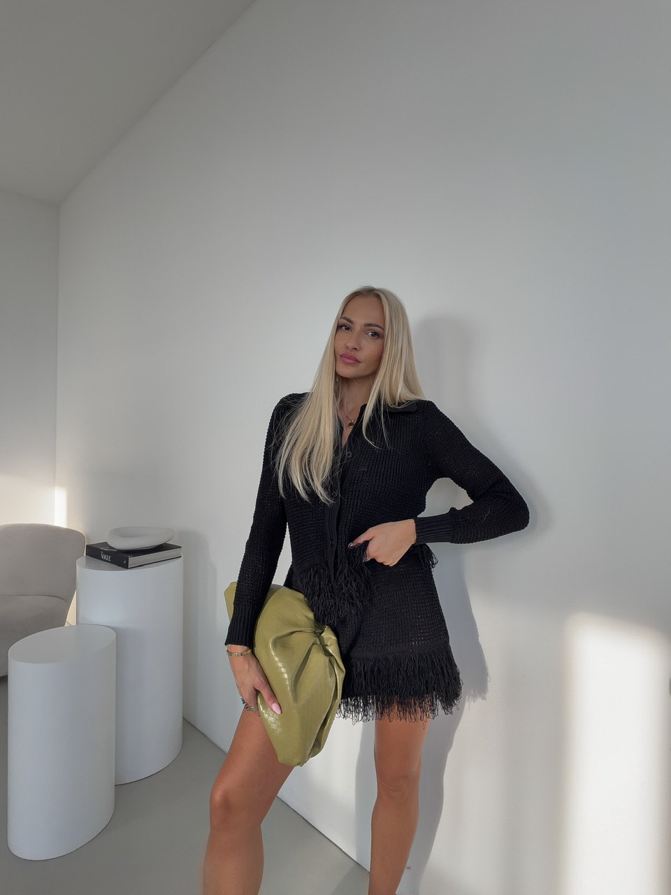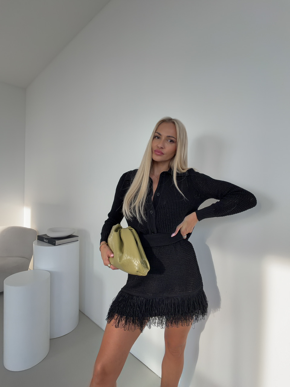 Komplet pozostávajúci zo sukne a svetra je štýlovým a zároveň pohodlným outfitom, ktorý okamžite zaujme. Sukňa s pásom na gumu sa perfektne prispôsobí postave a zaručuje komfort počas celého dňa, zatiaľ čo sveter so zapínaním na gombíky a golierom dodáva elegantný a upravený vzhľad.Oba kúsky sú doplnené jemnými strapcami na spodnej časti, čo dodáva celému setu hravý a módny nádych.