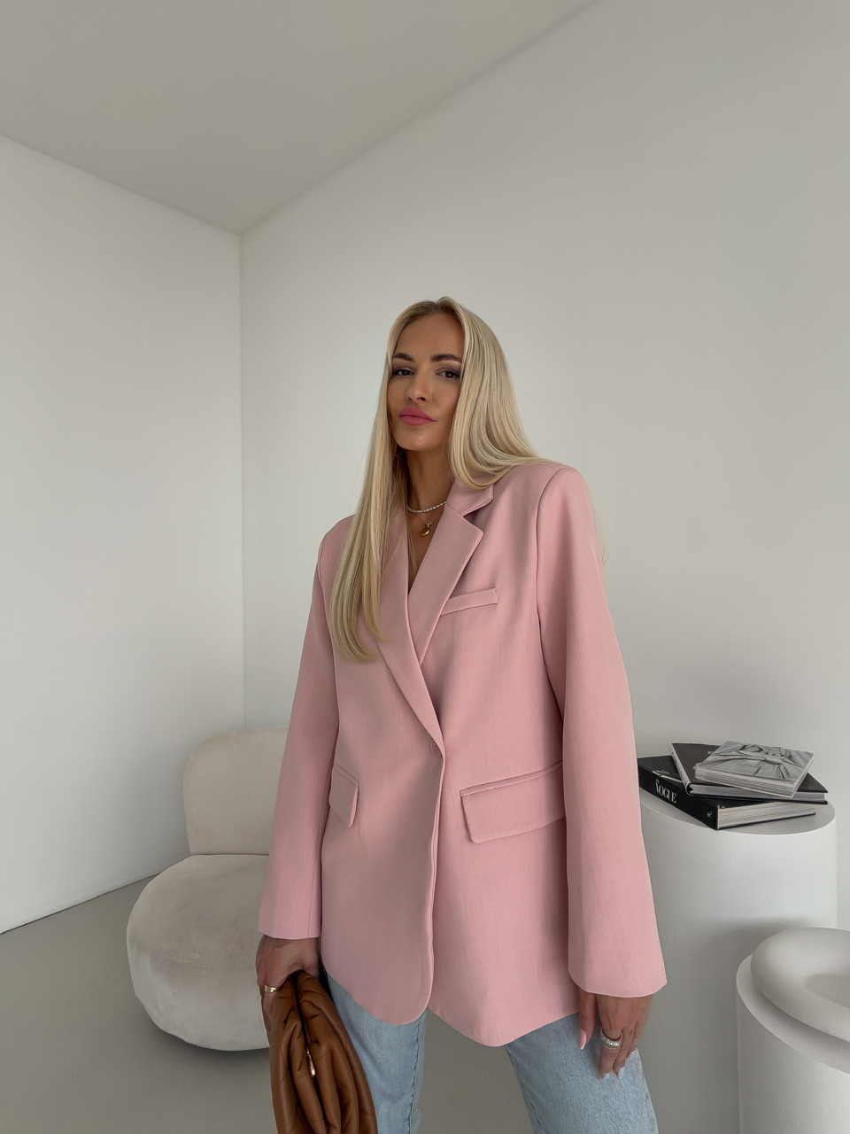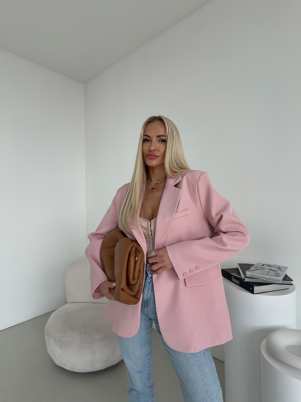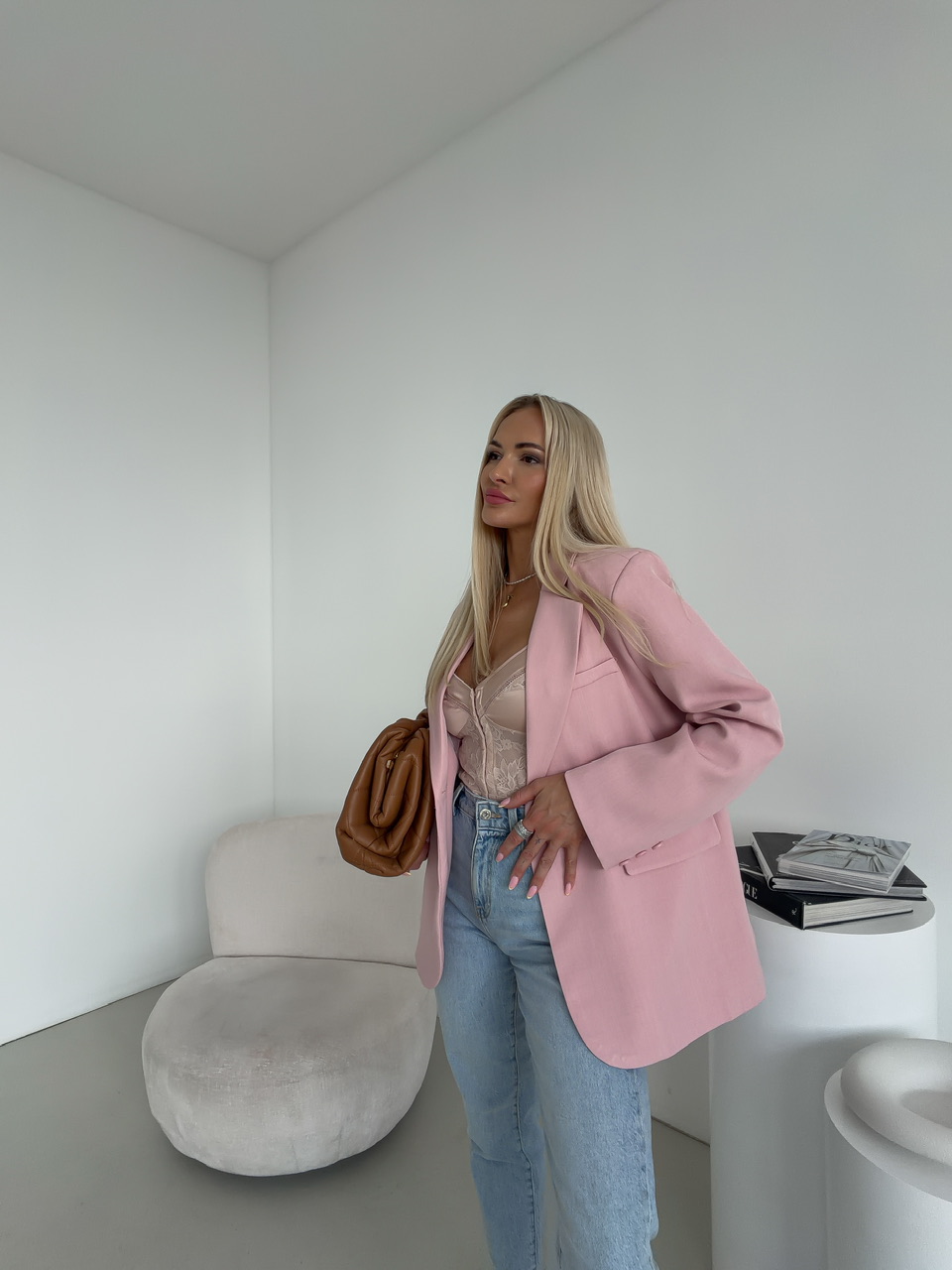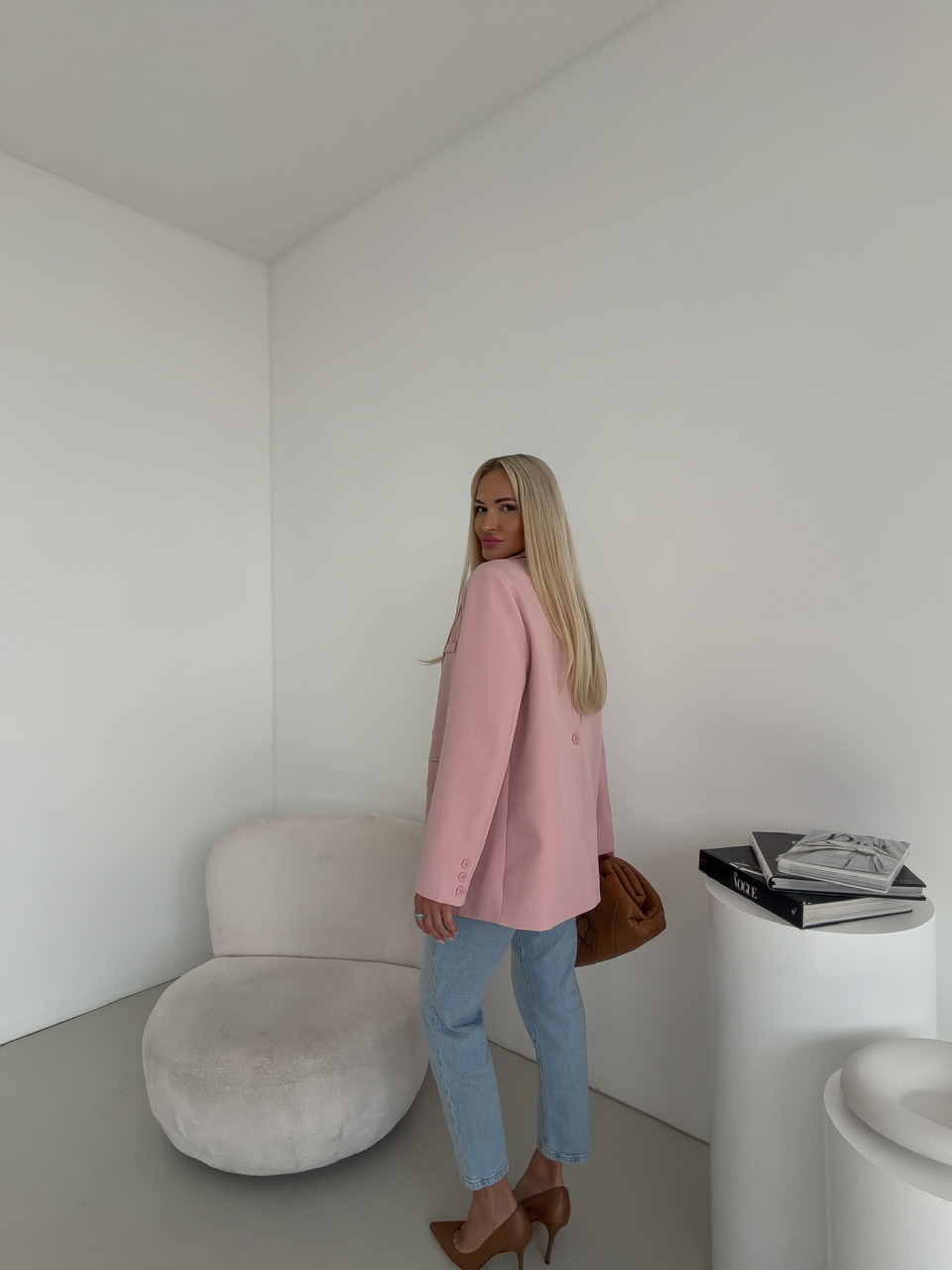 Štýlové sako s vypchávkami na pleciach, ktoré dodávajú outfitu elegantnú a modernú siluetu. Disponuje dvomi prednými vreckami a klasickým golierom so zapínaním na gombíky. Zaujímavým detailom je odhalený chrbát so zapínaním na jeden gombík vzadu, ktorý pridáva šmrnc a nečakaný nádych rafinovanosti. Ideálne na formálne aj spoločenské príležitosti, kde chcete vyniknúť štýlom a originalitou.