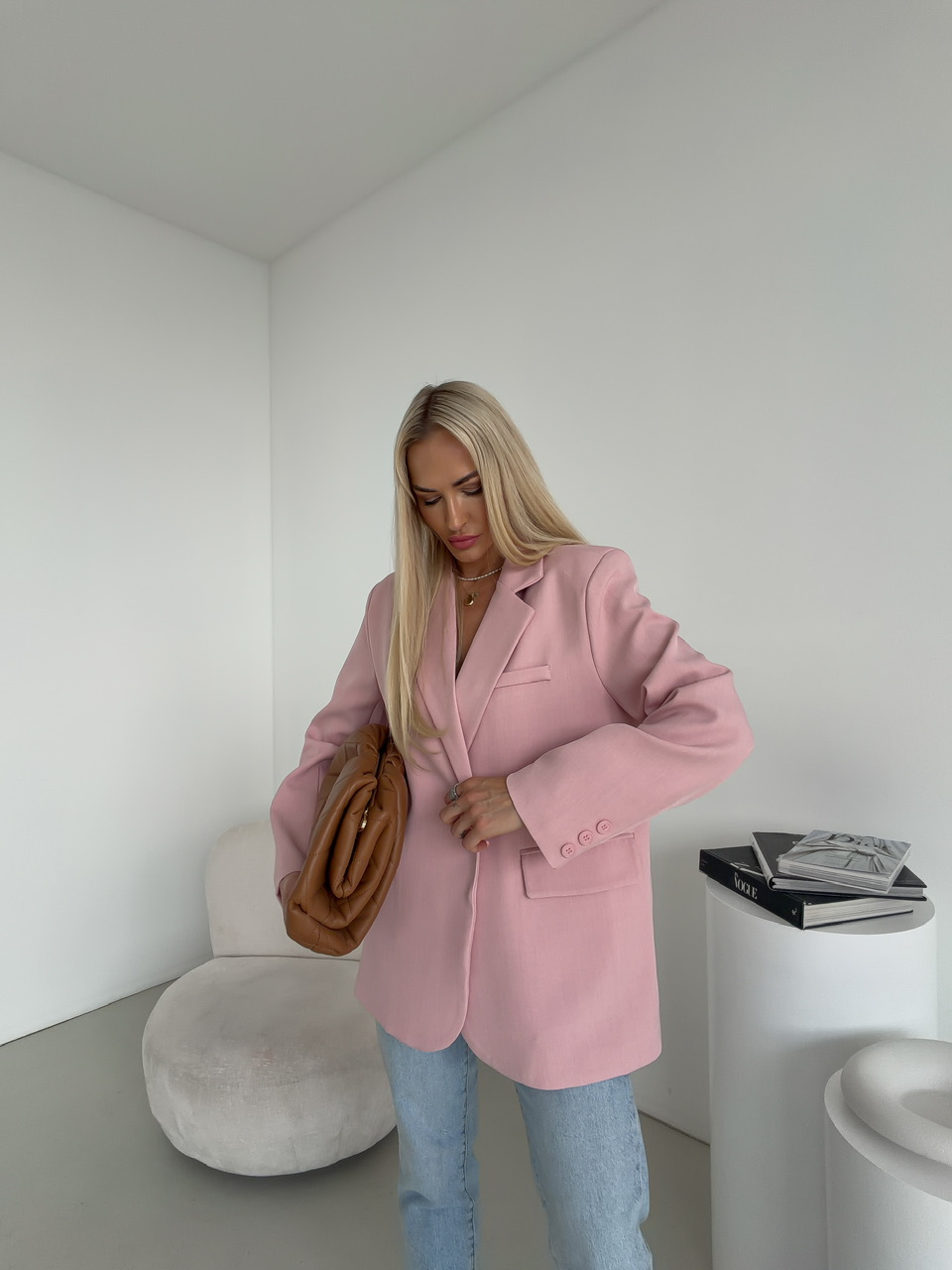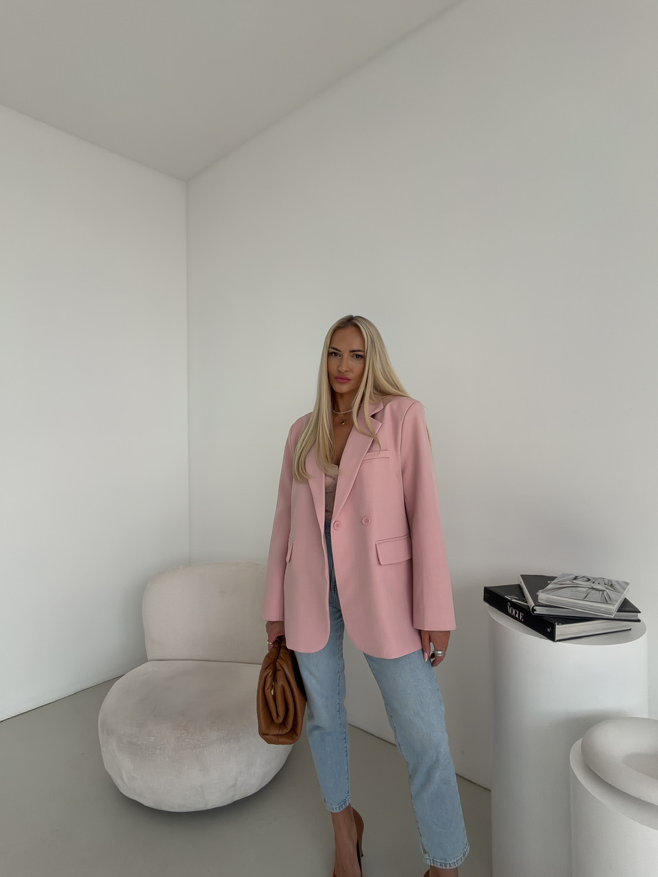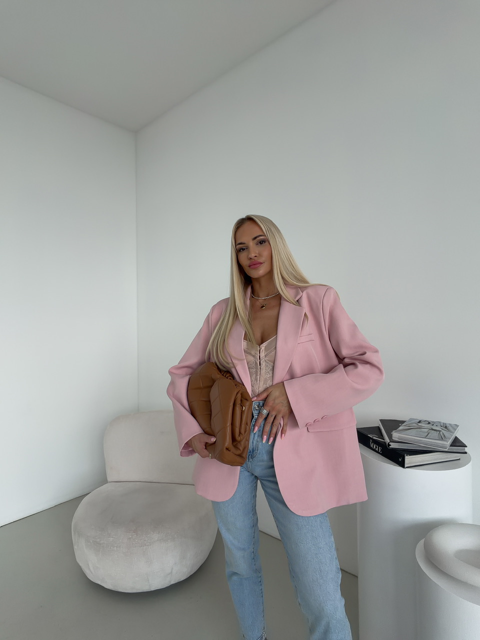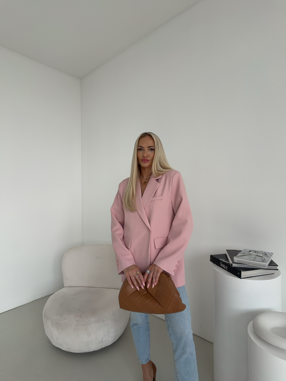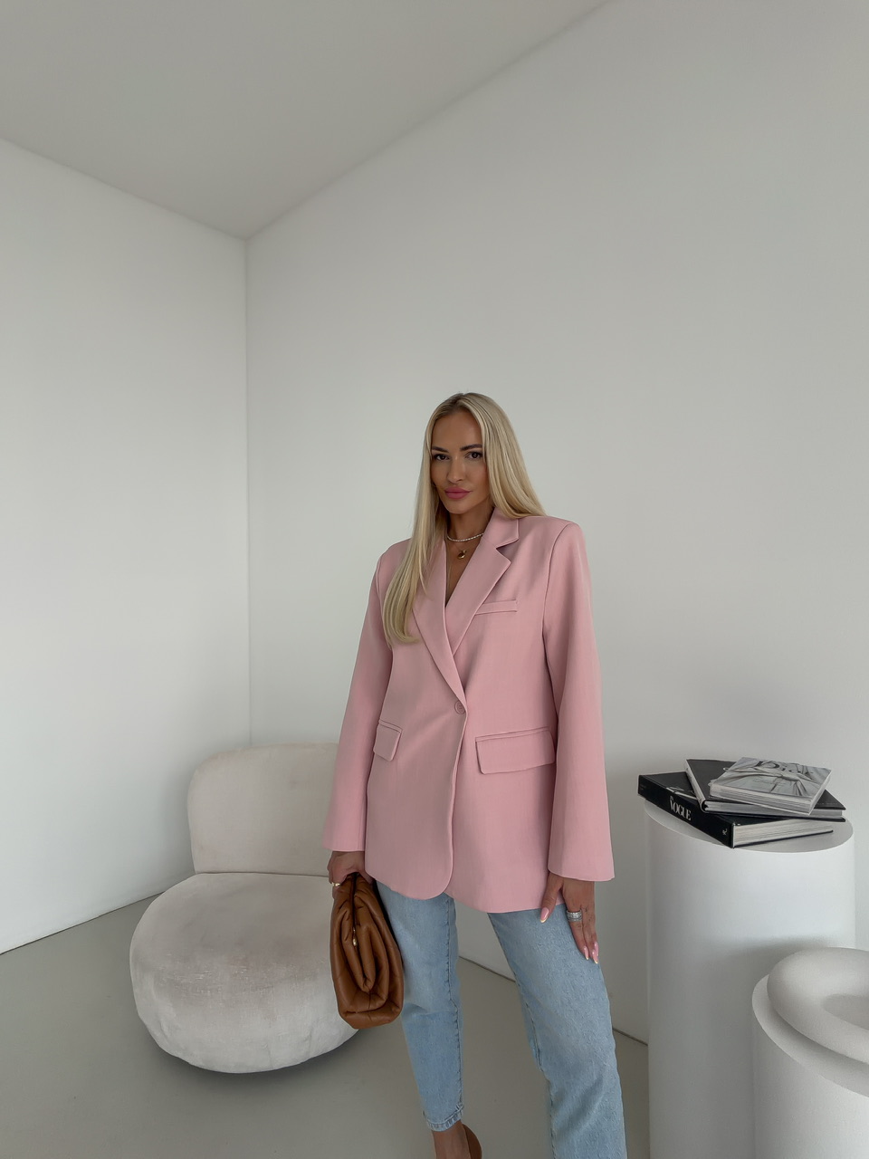 Štýlové sako s vypchávkami na pleciach, ktoré dodávajú outfitu elegantnú a modernú siluetu. Disponuje dvomi prednými vreckami a klasickým golierom so zapínaním na gombíky. Zaujímavým detailom je odhalený chrbát so zapínaním na jeden gombík vzadu, ktorý pridáva šmrnc a nečakaný nádych rafinovanosti. Ideálne na formálne aj spoločenské príležitosti, kde chcete vyniknúť štýlom a originalitou.