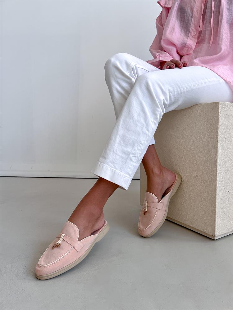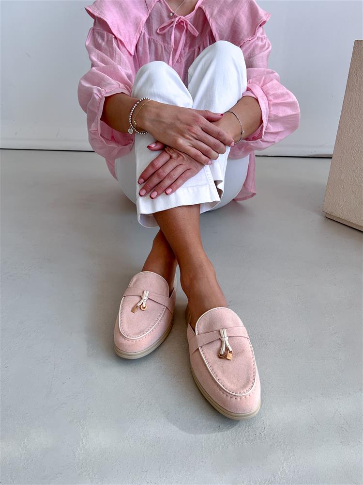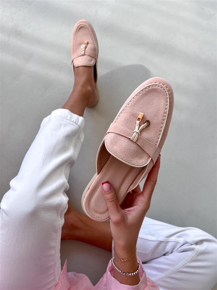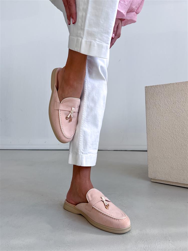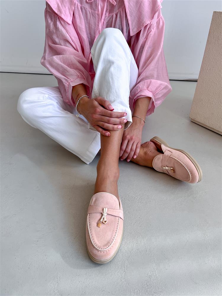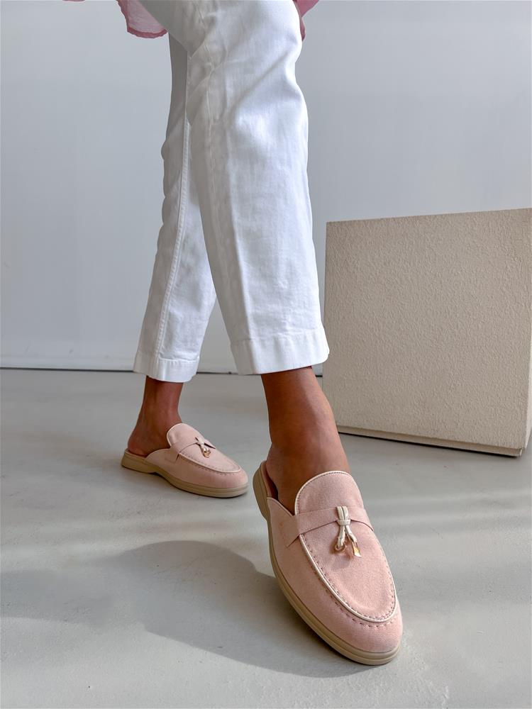 Svetloružové topánky na nízkej podrážke. Zvršok je semišového materiálu. Vrchná časť je zdobená bielym lemovaním a zlatými aplikáciami. Zadná časť päty je otvorená.