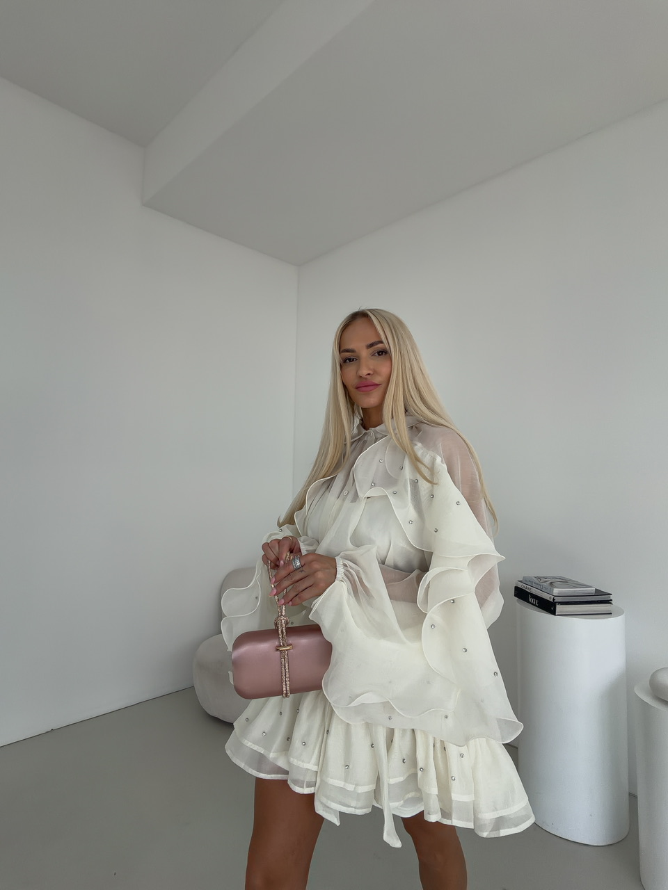 Elegantné dámske šaty, ktoré spájajú komfort s jemným ženským štýlom. Model pozostáva z dvoch častí – spodného a vrchného dielu, ktoré spolu vytvárajú harmonický a moderný vzhľad.Spodný diel je riešený na tenké ramienka a vyrobený z elastického materiálu, vďaka čomu sa krásne prispôsobí postave a zvýrazní siluetu. Vrchný diel dopĺňa šaty o sofistikovaný nádych. Má dlhé rukávy s efektnými volánmi a pružným, gumičkovým lemom, ktoré dodávajú modelu romantický charakter. Predná časť je zdobená jednoradovým zapínaním na gombíky s jemným lesklým detailom, čo podčiarkuje eleganciu celku. Po vybraných častiach šiat sú decentne umiestnené trblietavé kamienky, ktoré dodávajú outfitu luxusný nádych a jemný lesk pri každom pohybe.