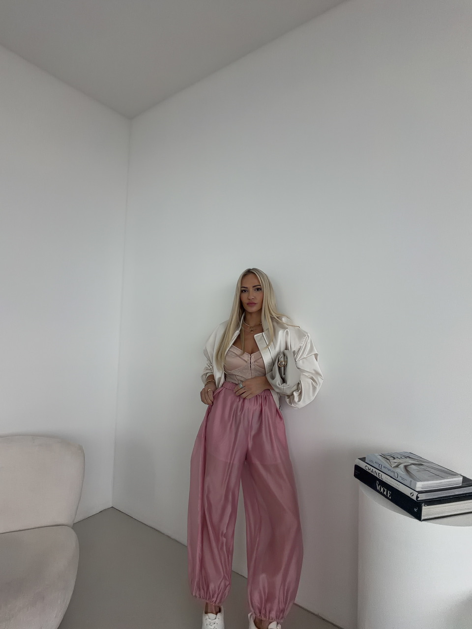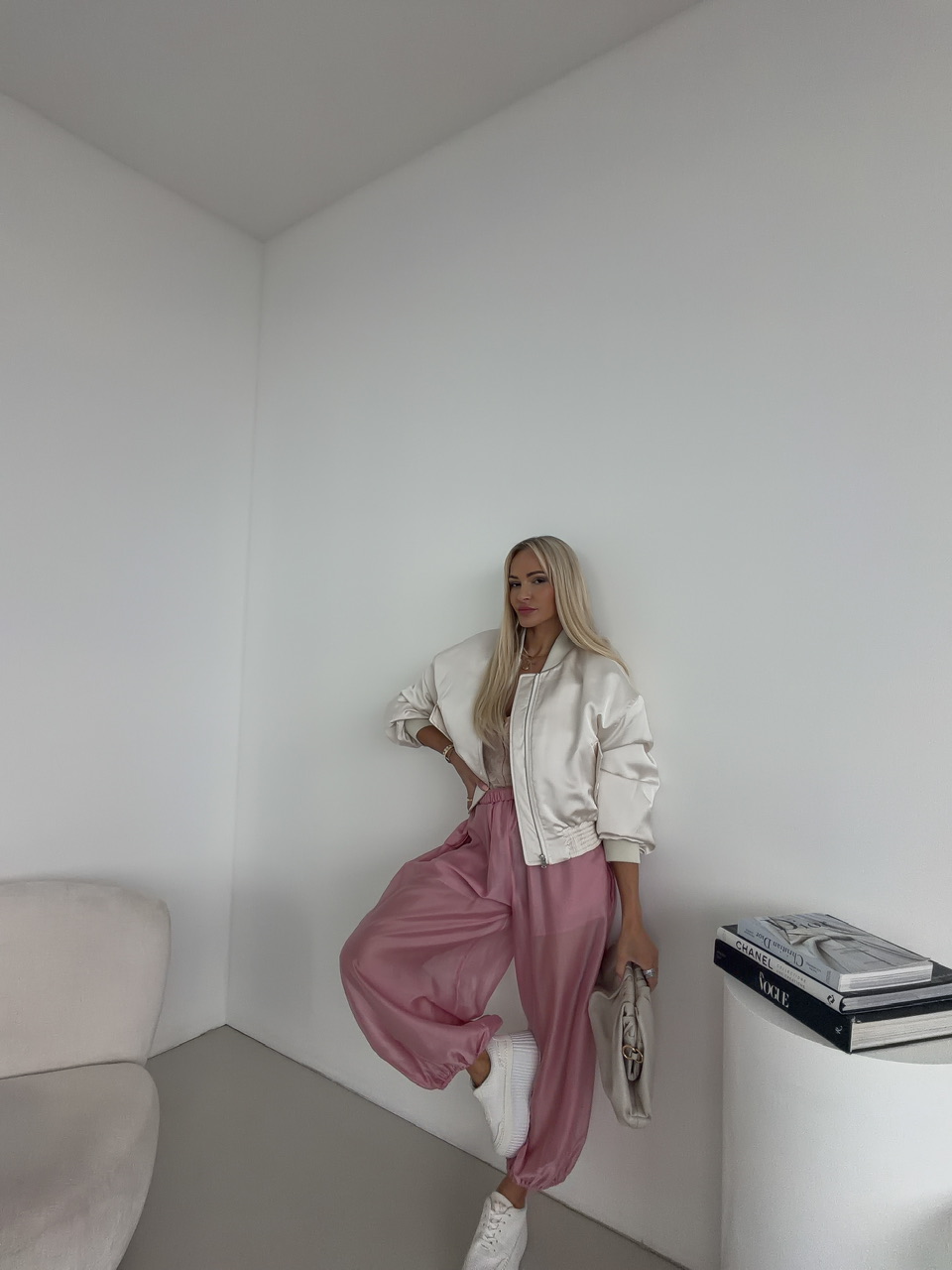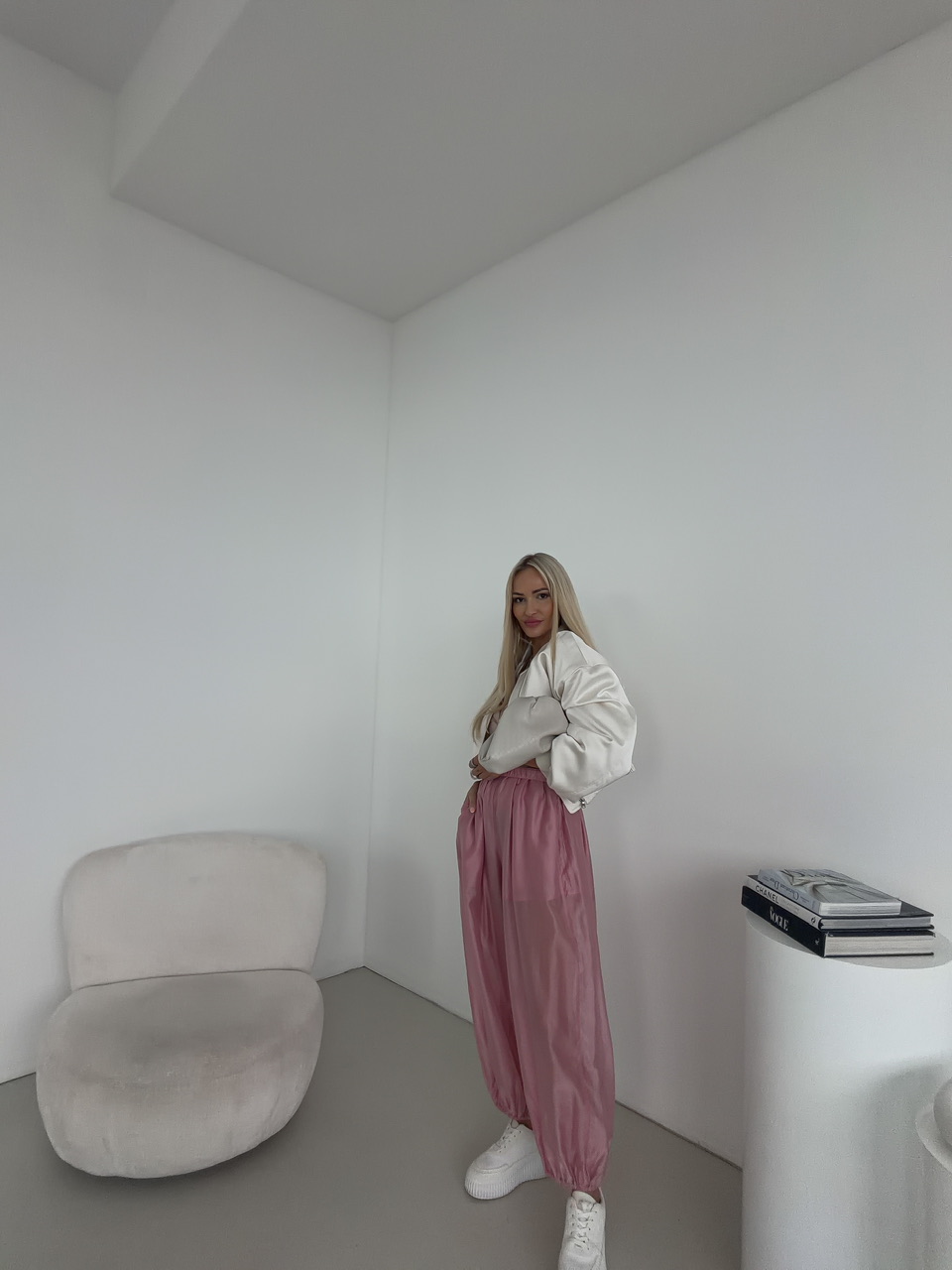 Voľné nohavice z ľahkého priehľadného materiálu predstavujú dokonalú kombináciu štýlu, pohodlia a jemnej elegancie. Vzdušná tkanina pôsobí moderne a žensky, pričom jemne odhaľuje siluetu bez toho, aby stratila na decentnosti. Elastická gumička v páse zabezpečuje pohodlné nosenie a prispôsobí sa postave bez nepríjemného tlaku. Rovnaký detail na spodnej časti nohavíc dodáva modelu zaujímavý tvar. Praktické vrecká po bokoch pridávajú funkčnosť, zatiaľ čo jemná podšívka vo vrchnej časti zaručuje komfort a pocit istoty pri nosení.