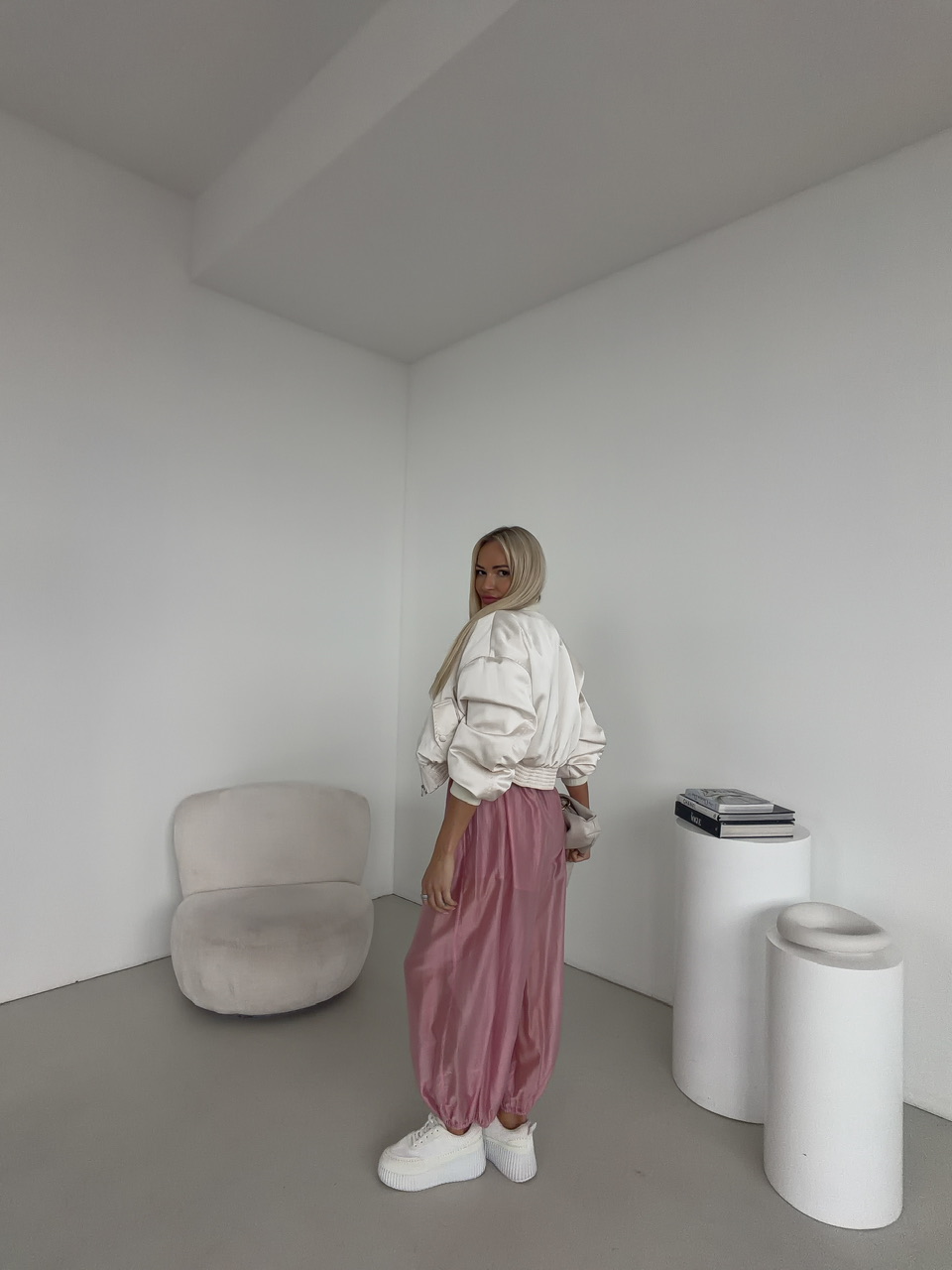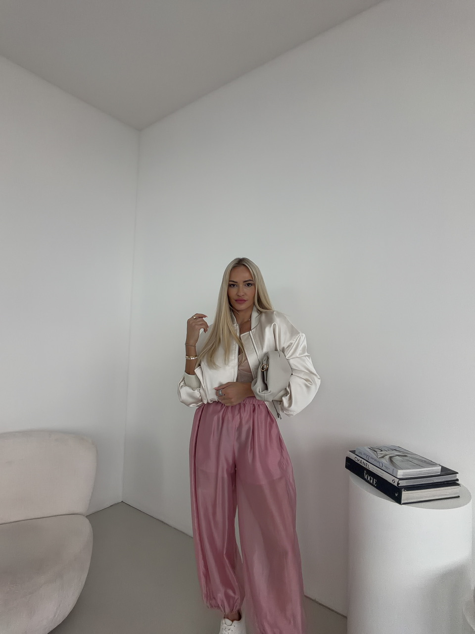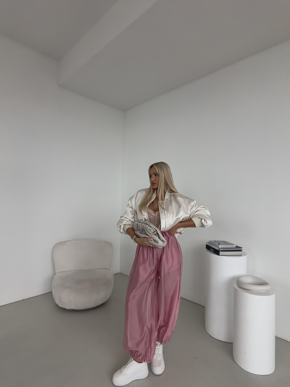 Voľné nohavice z ľahkého priehľadného materiálu predstavujú dokonalú kombináciu štýlu, pohodlia a jemnej elegancie. Vzdušná tkanina pôsobí moderne a žensky, pričom jemne odhaľuje siluetu bez toho, aby stratila na decentnosti. Elastická gumička v páse zabezpečuje pohodlné nosenie a prispôsobí sa postave bez nepríjemného tlaku. Rovnaký detail na spodnej časti nohavíc dodáva modelu zaujímavý tvar. Praktické vrecká po bokoch pridávajú funkčnosť, zatiaľ čo jemná podšívka vo vrchnej časti zaručuje komfort a pocit istoty pri nosení.