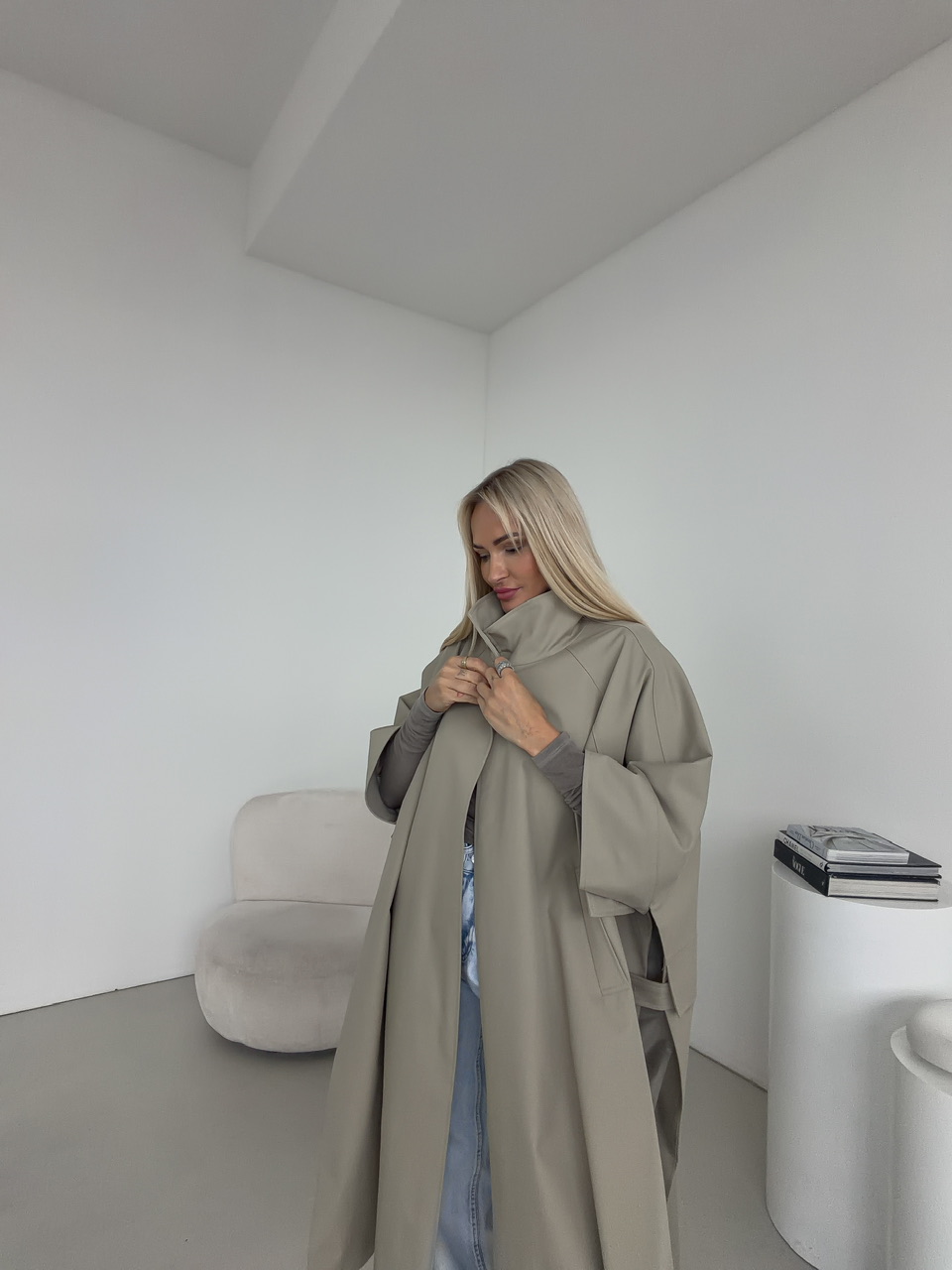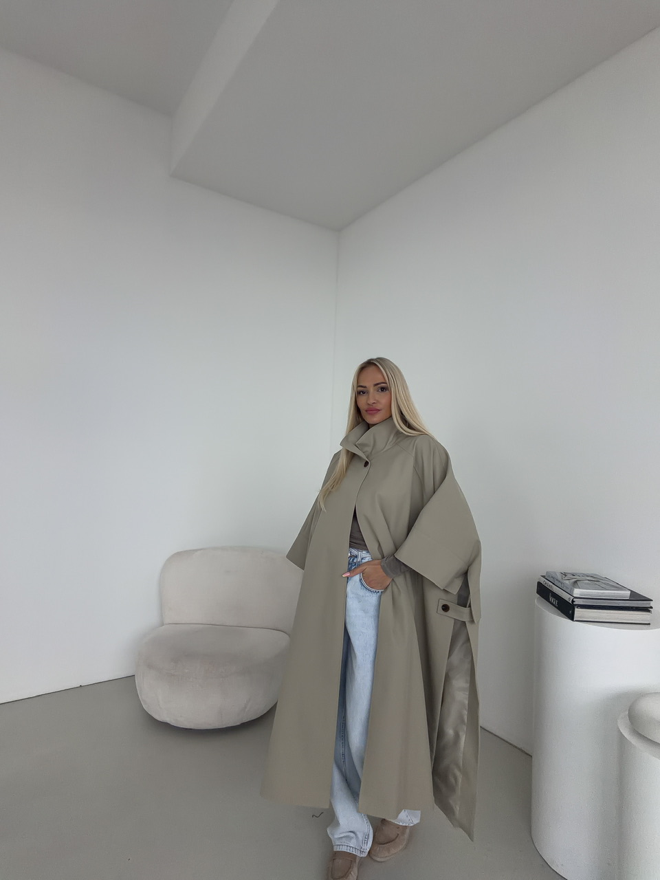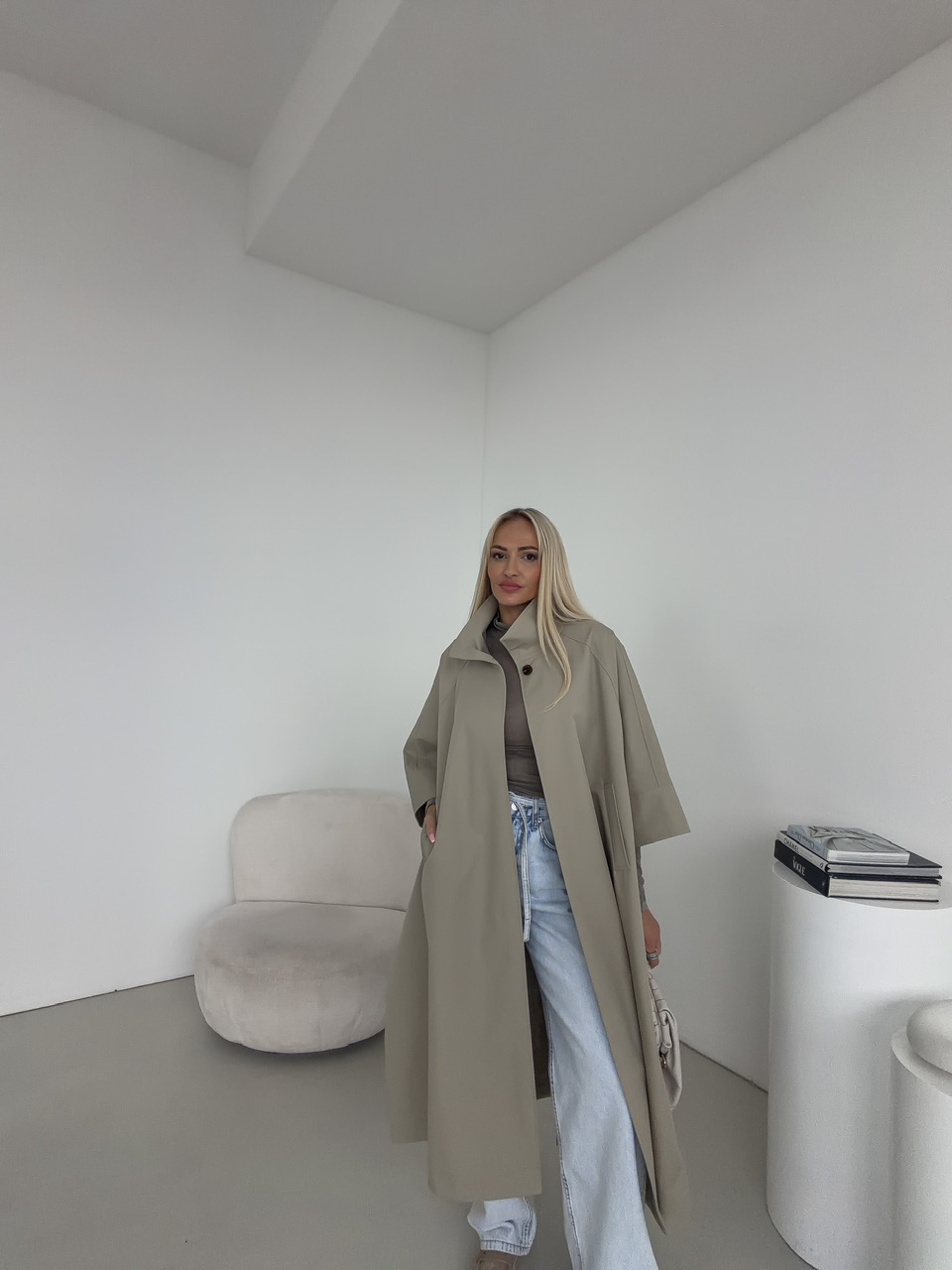 Trenčkot s golierom je elegantný kúsok, ktorý spája nadčasový dizajn s modernými detailmi. Jeho čisté línie a kvalitné spracovanie zaručujú sofistikovaný vzhľad vhodný do práce aj na voľný čas. Zapínanie na jeden gombík pri krku a gombíkové detaily na bočnej strane dodávajú trenčkotu originálny a štýlový charakter, zatiaľ čo gombík na manžete umožňuje jednoduché prispôsobenie rukávov. Dve predné vrecká pridávajú praktickosť a zároveň dopĺňajú minimalistický dizajn.