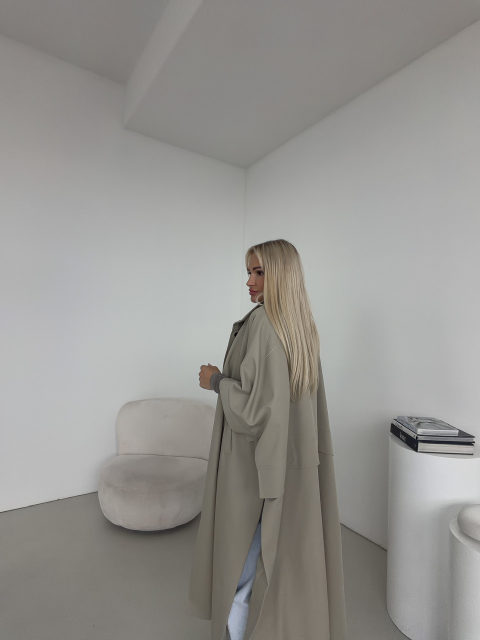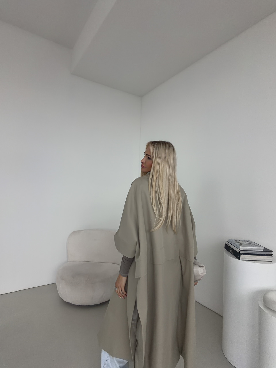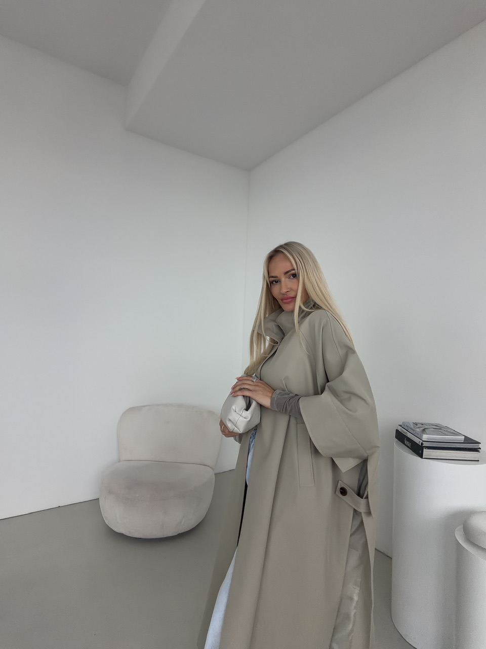 Trenčkot s golierom je elegantný kúsok, ktorý spája nadčasový dizajn s modernými detailmi. Jeho čisté línie a kvalitné spracovanie zaručujú sofistikovaný vzhľad vhodný do práce aj na voľný čas. Zapínanie na jeden gombík pri krku a gombíkové detaily na bočnej strane dodávajú trenčkotu originálny a štýlový charakter, zatiaľ čo gombík na manžete umožňuje jednoduché prispôsobenie rukávov. Dve predné vrecká pridávajú praktickosť a zároveň dopĺňajú minimalistický dizajn.