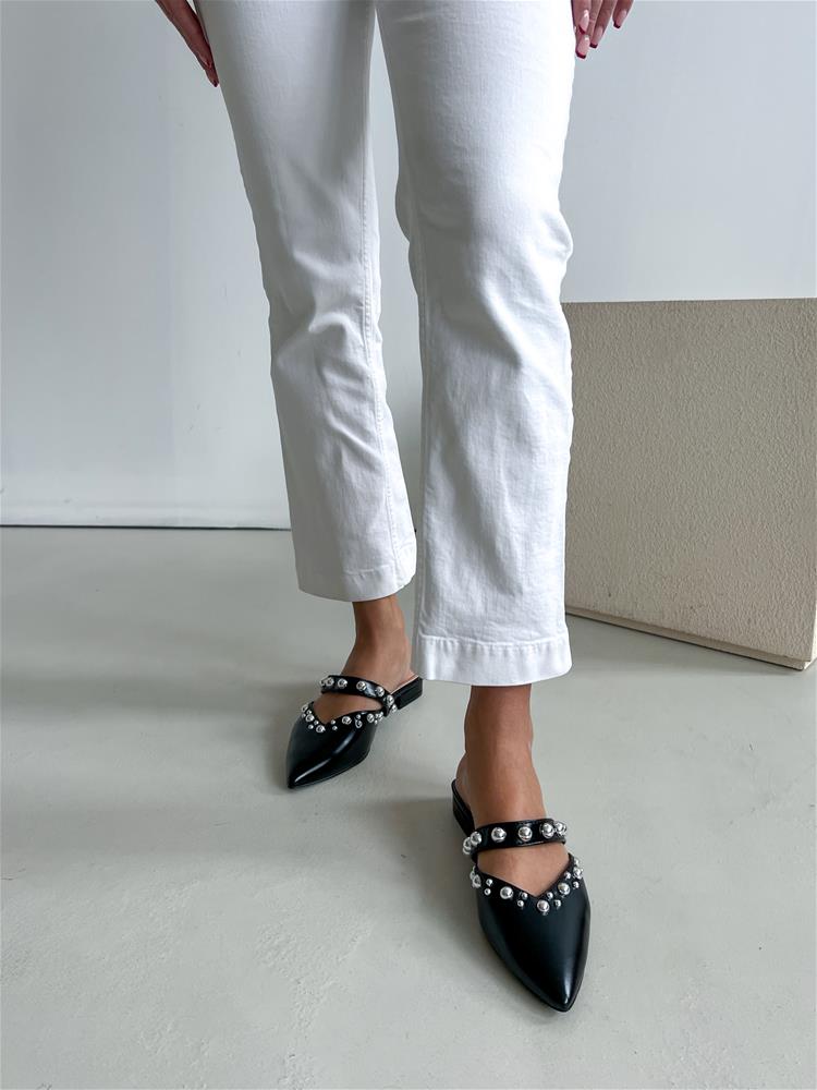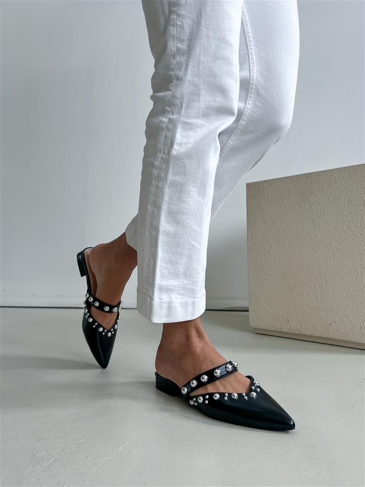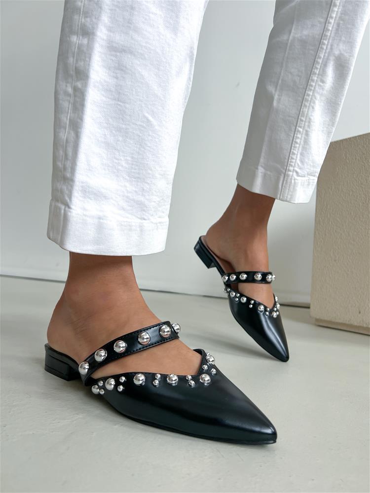 Nízke šľapky s mierne vysokým hrubým podpätkom (cca 2,5 cm). Zvršok je zdobený strieborným vybíjaním. Predná čať je špicatého tvaru.
