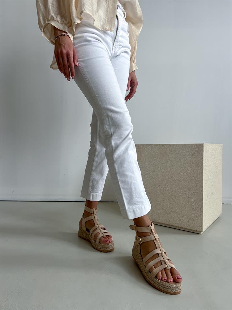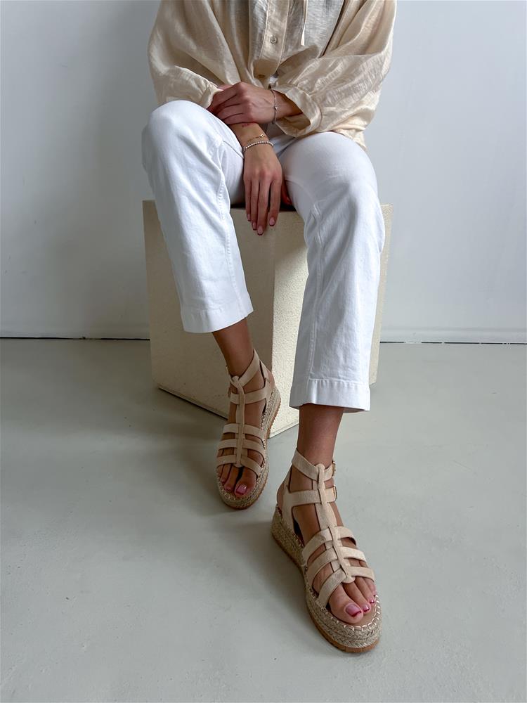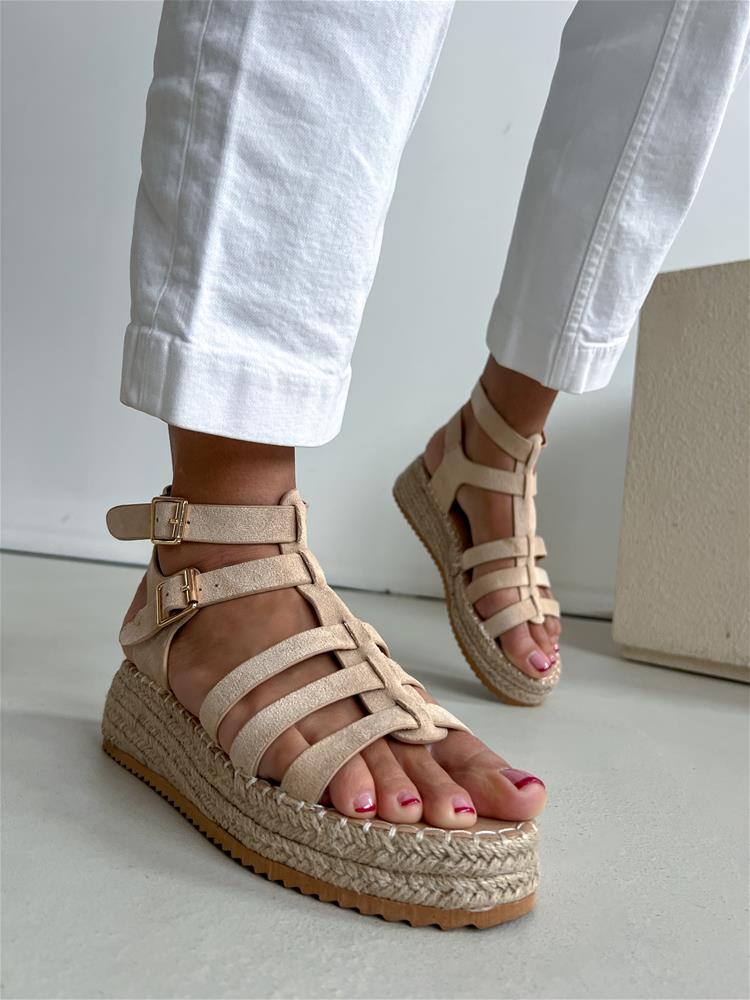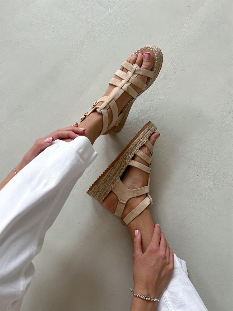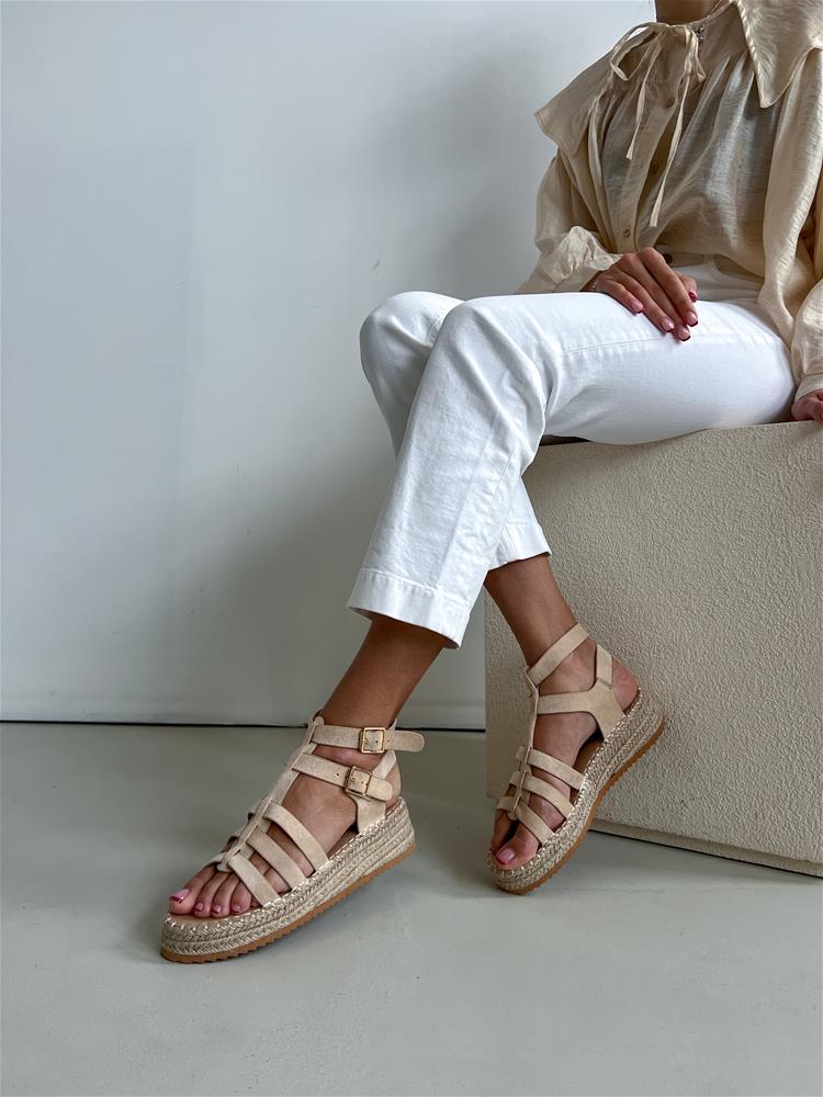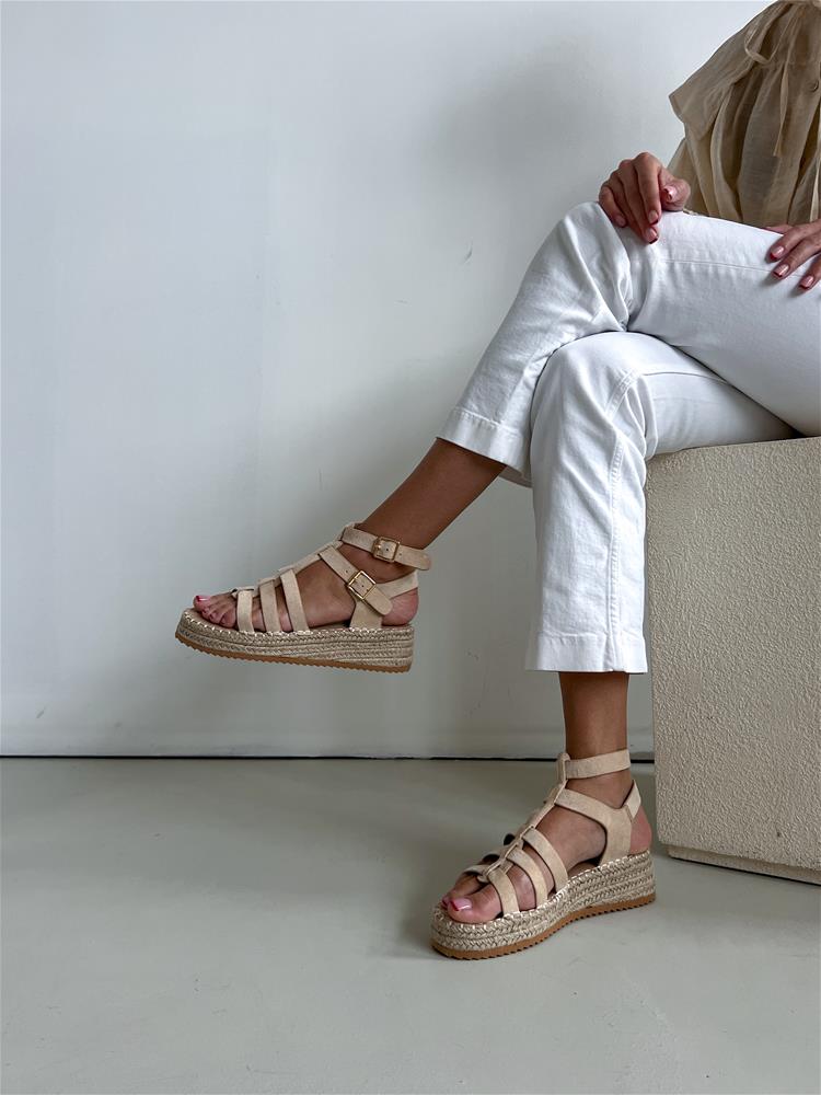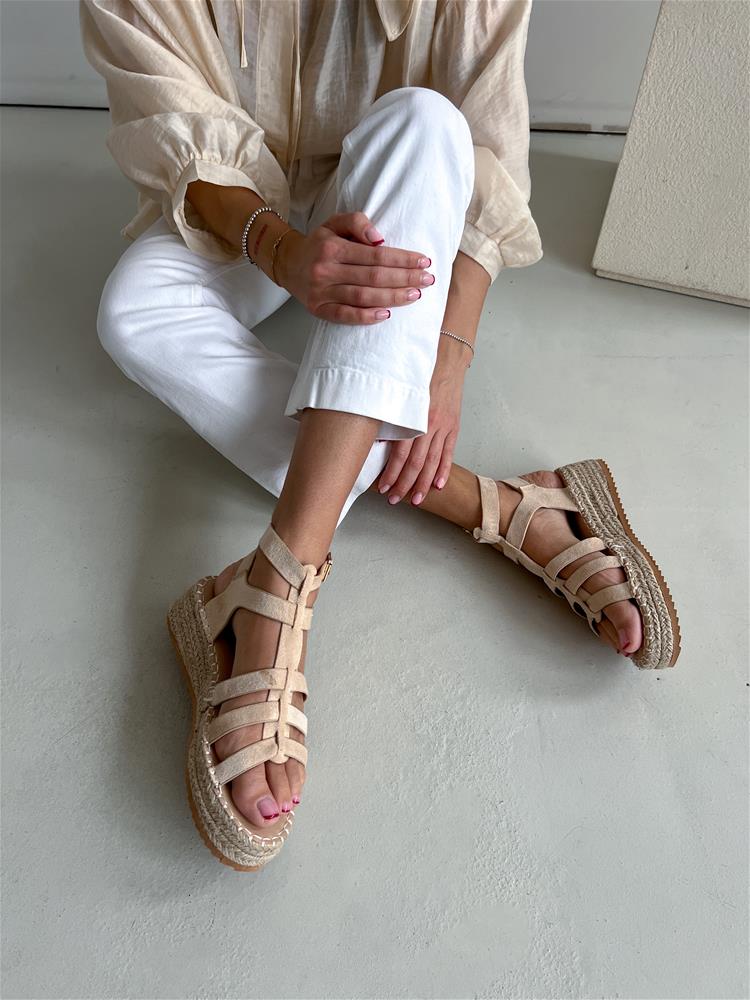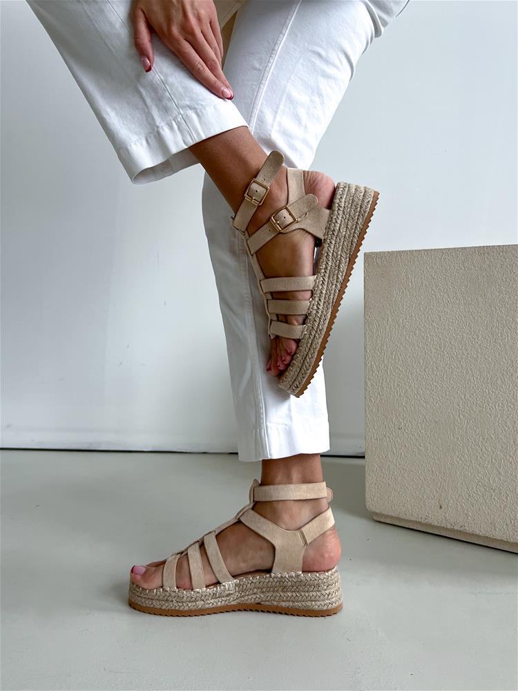 Béžové sandále na rovnej, mierne vyvýšenej podrážke (cca 4 cm). Obvod podrážky je potiahnutý prírodnou jutou. Zvršok sa skladá z viacerých remienkov, ktoré sú semišového materiálu. Z vonkajšej bočnej strany sú dve zlaté pracky na zapínanie.