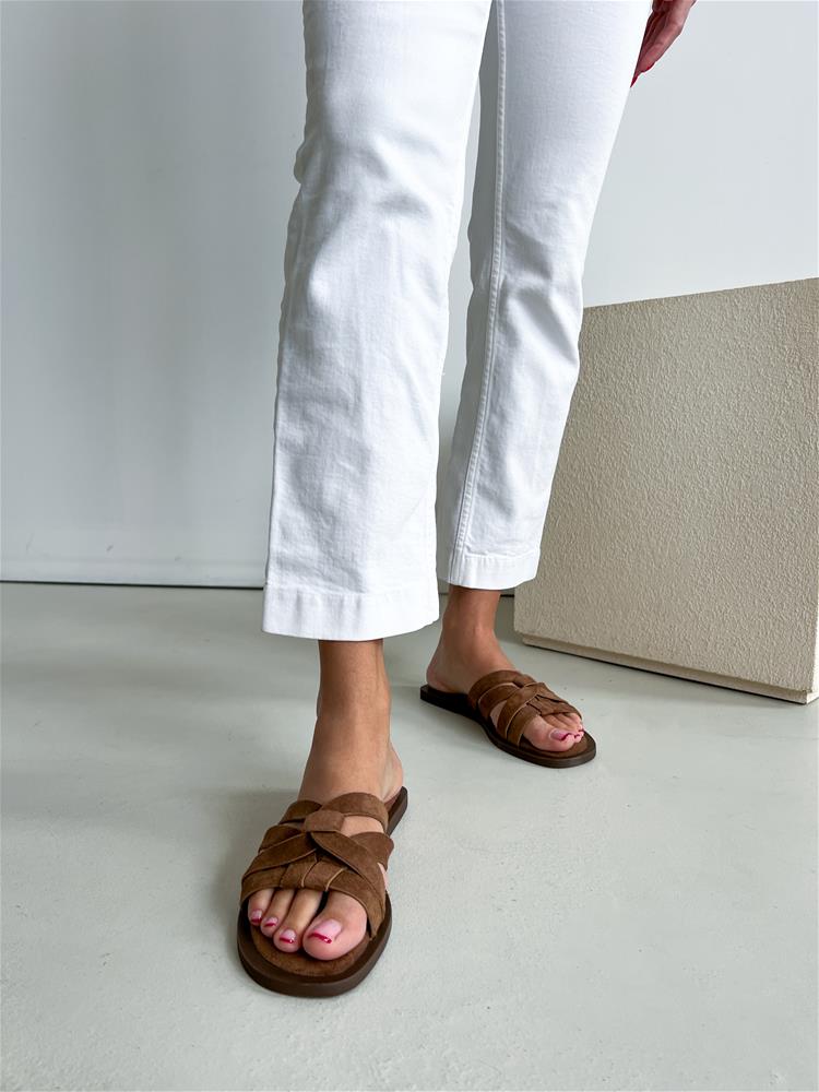 Nízke šľapky na rovnej podrážke. Zvršok je semišového materiálu a skladá sa z viacerých remienkov.