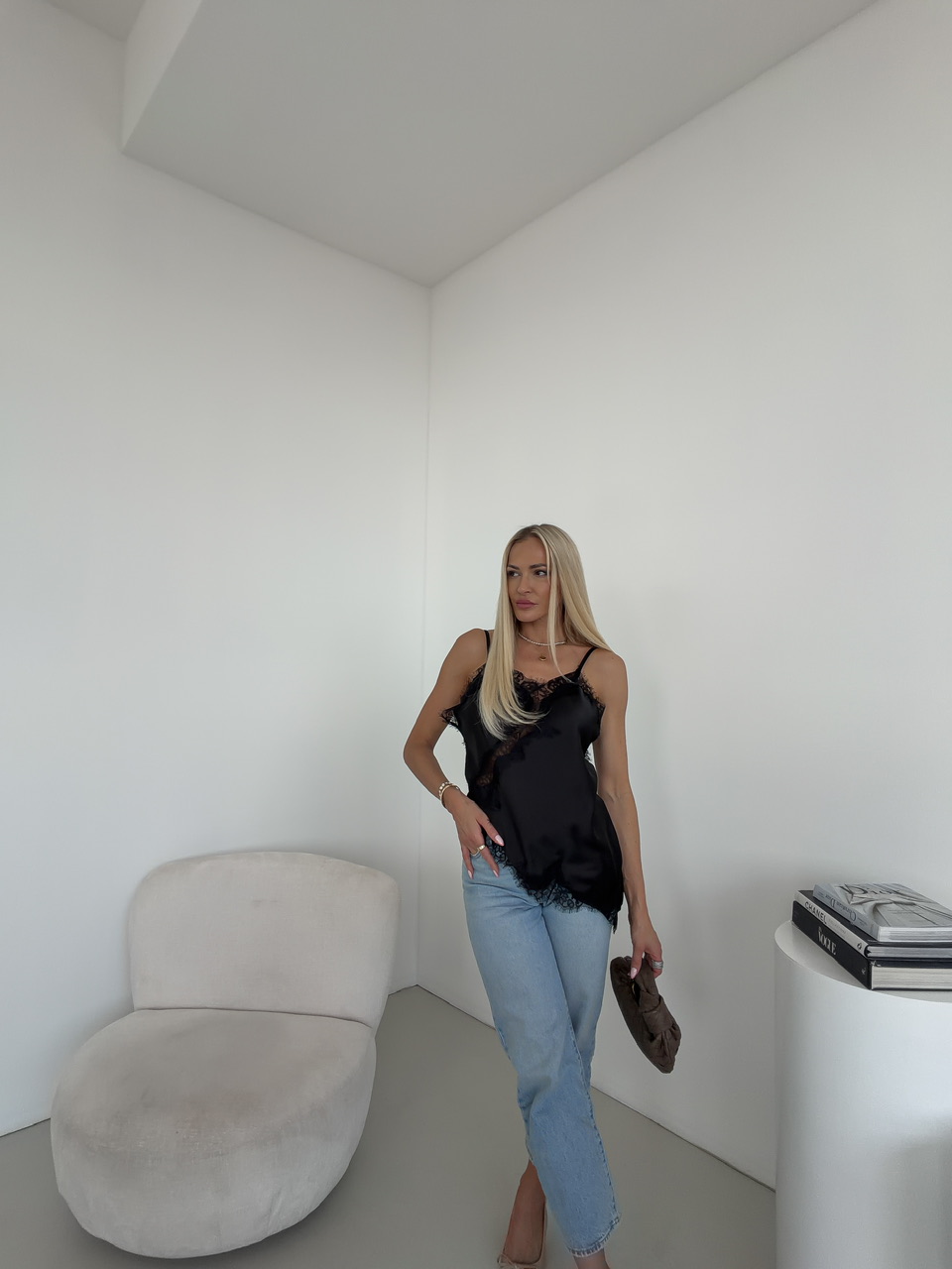 Elegantný a zároveň zvodný top, ktorý zaujme na prvý pohľad. Tento čipkovaný asymetrický kúsok vyniká jemným saténovým efektom, ktorý dodáva outfitu luxusný nádych. Asymetrický strih krásne zvýrazní siluetu a dodá vášmu vzhľadu moderný a originálny charakter. Top je vybavený nastaviteľnými ramienkami, vďaka čomu si ho jednoducho prispôsobíte.
