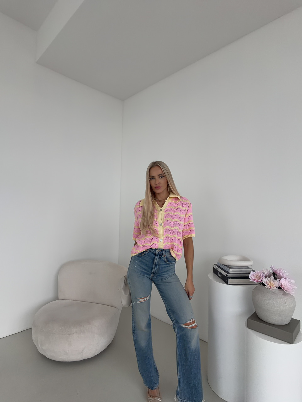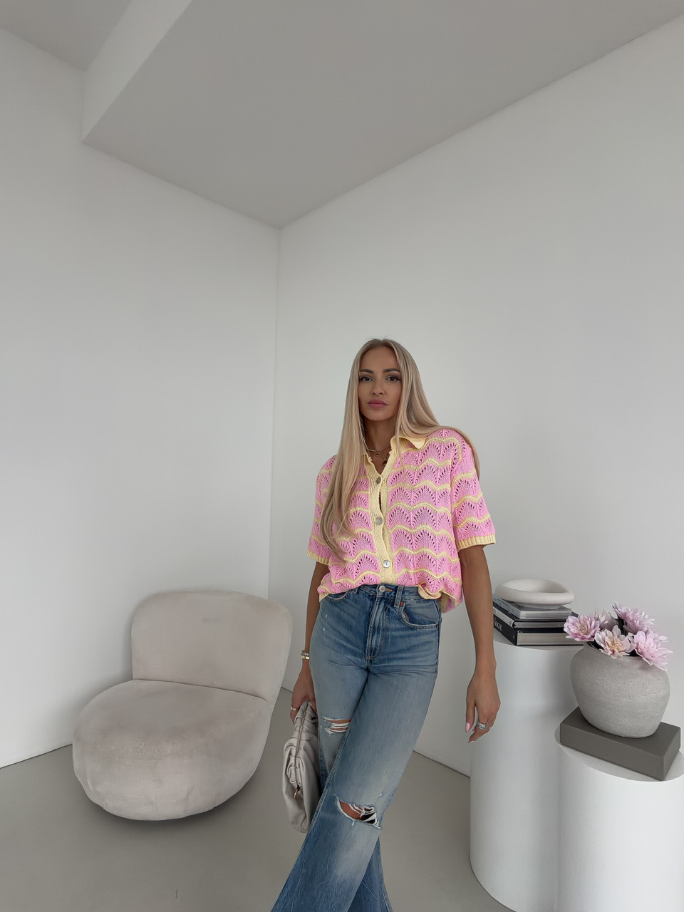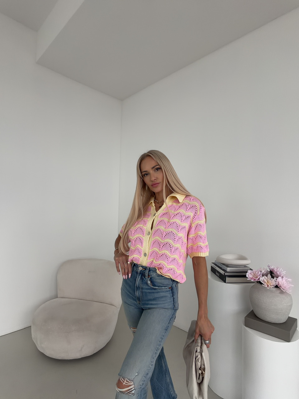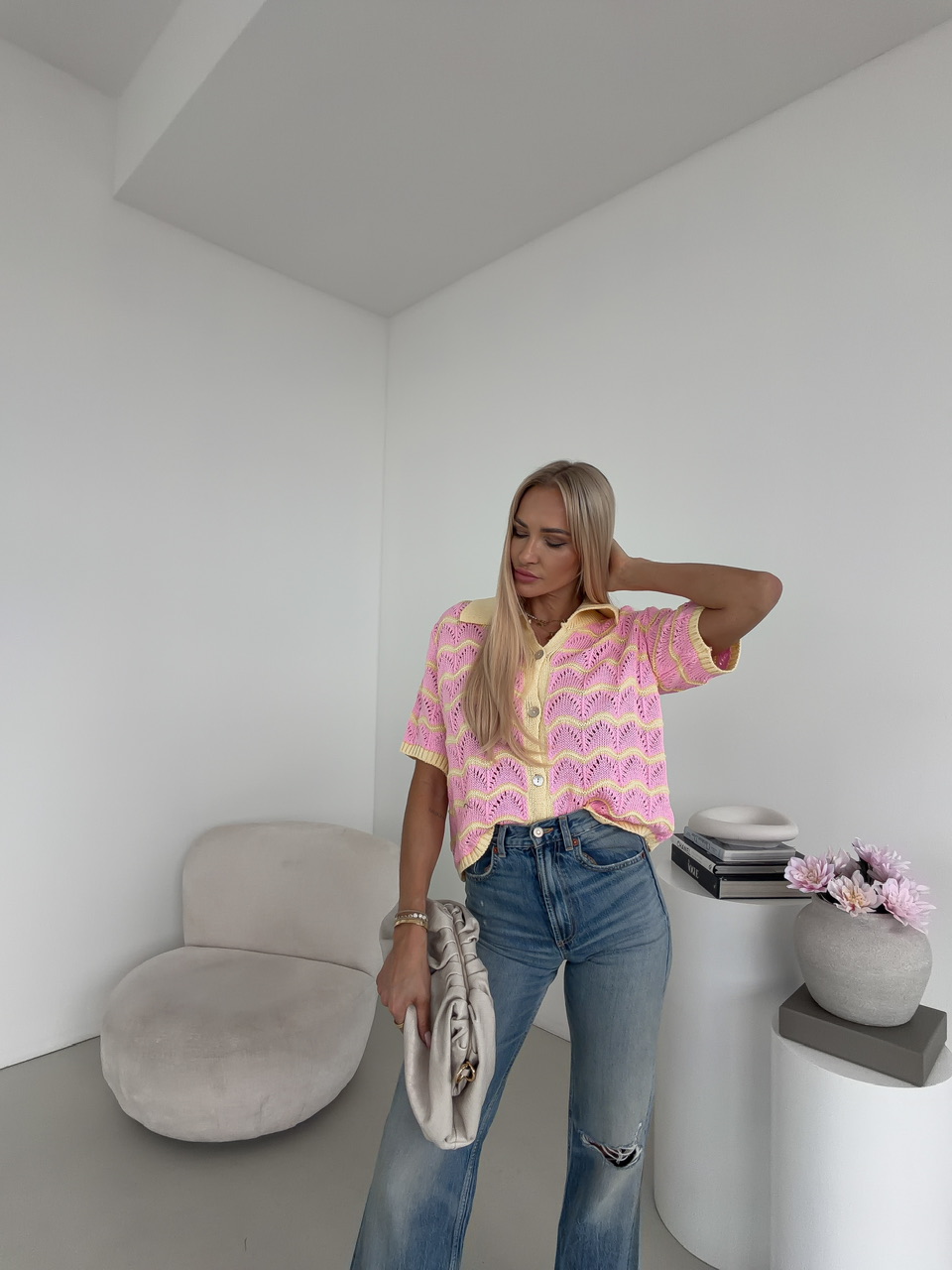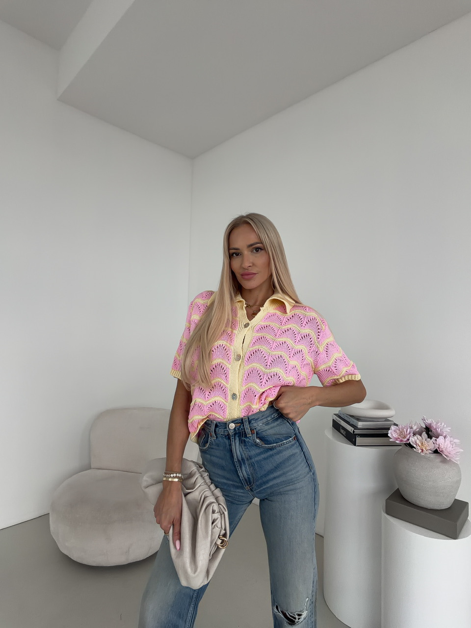 Dierkovaný svetrík s krátkym rukávom pôsobí nežne a zároveň štýlovo. Vzdušný pletený vzor dodáva ľahkosť a eleganciu, zatiaľ čo golier so zapínaním na gombíky prináša nádych retro šarmu. Perfektný na vrstvenie aj samostatné nosenie – skvelo sa hodí k džínsom pre ležérny look alebo k sukni pre romantický outfit.