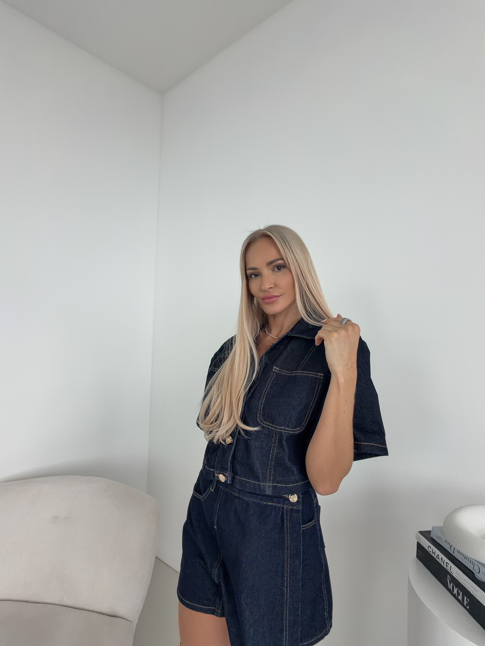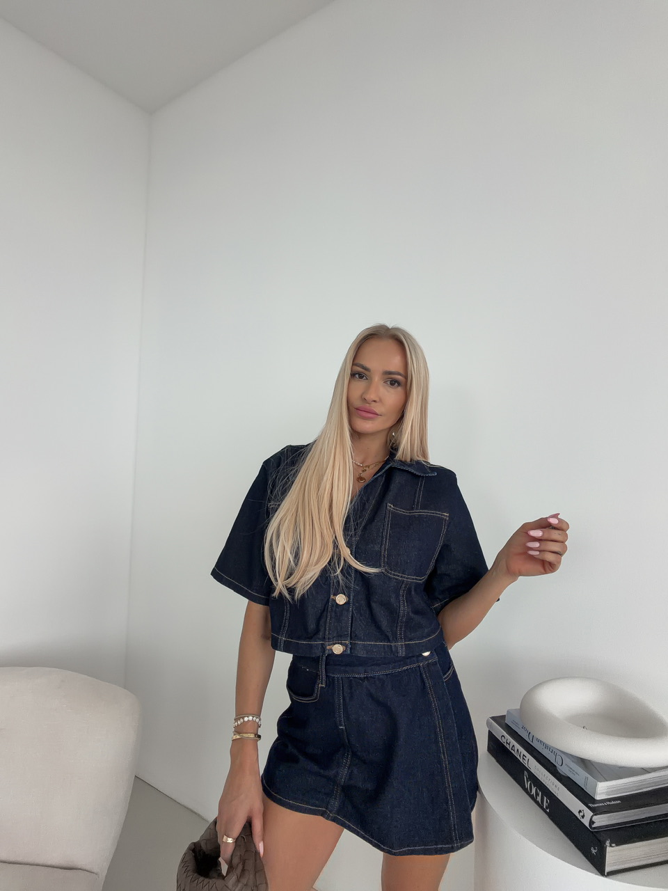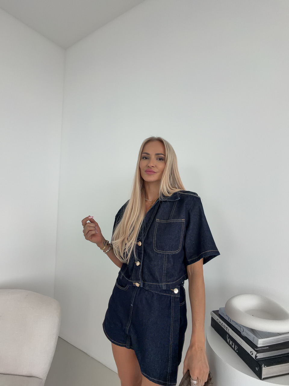 Skrátený denimový top/bundička s golierom pôsobí štýlovo a sviežo, ideálny na vrstvenie aj samostatné nosenie počas teplejších dní. Zapínanie na gombíky podčiarkuje jeho klasický charakter, zatiaľ čo krátke rukávy mu dodávajú uvoľnený, letný vibe. Náprsné vrecká pridávajú praktický aj dizajnový detail, ktorý celý look krásne oživí.