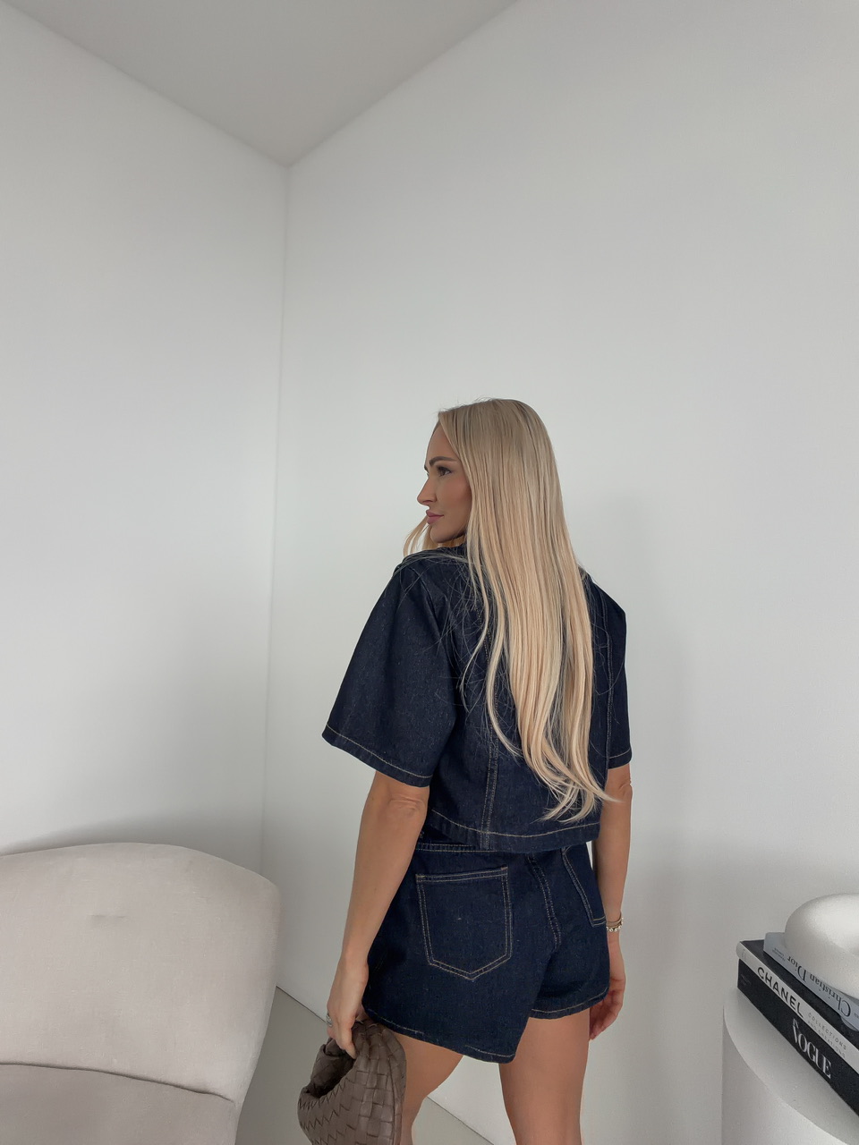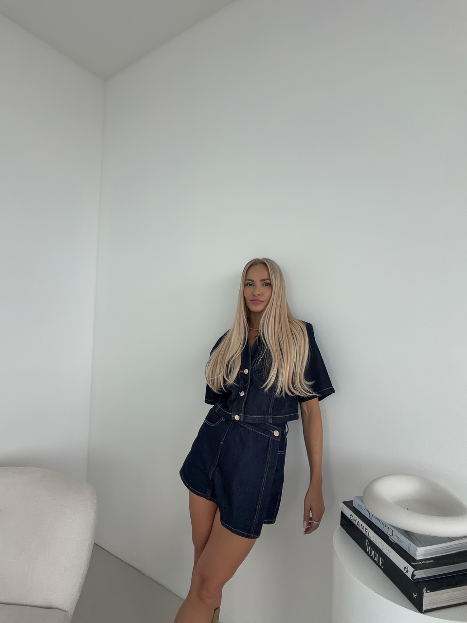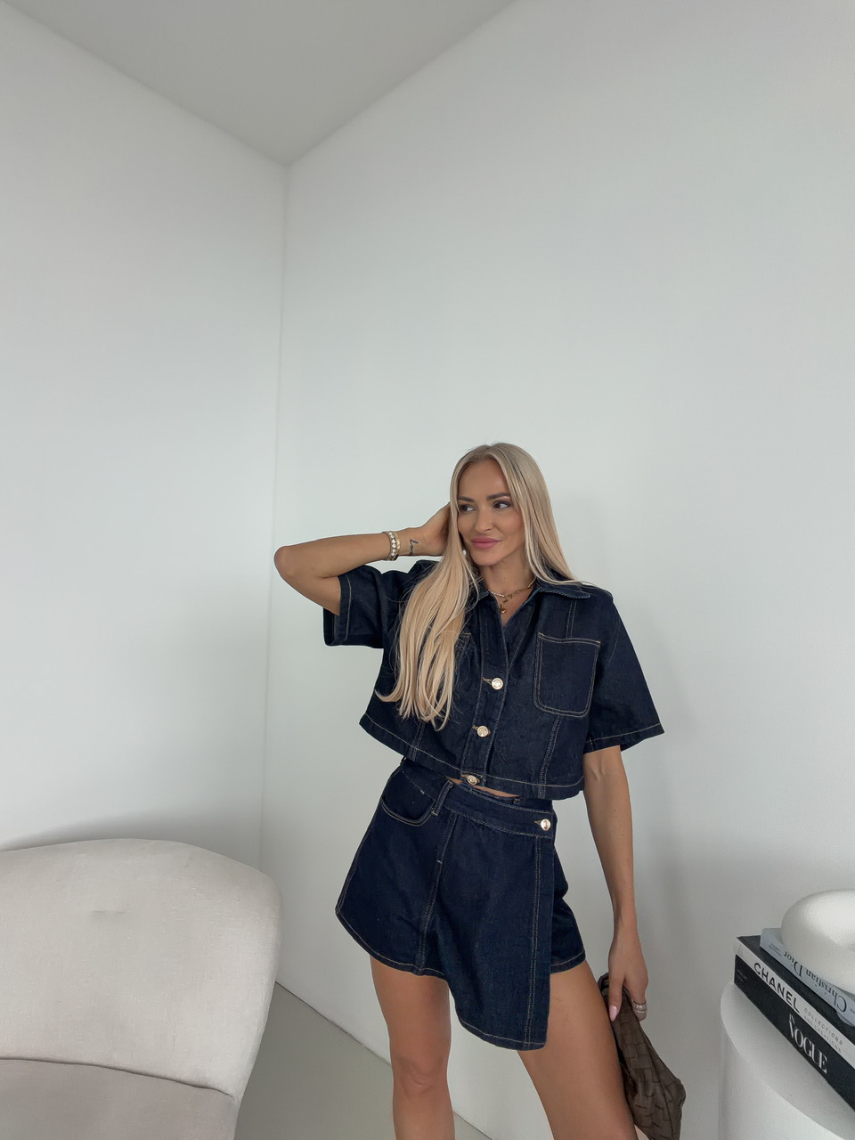 Skrátený denimový top/bundička s golierom pôsobí štýlovo a sviežo, ideálny na vrstvenie aj samostatné nosenie počas teplejších dní. Zapínanie na gombíky podčiarkuje jeho klasický charakter, zatiaľ čo krátke rukávy mu dodávajú uvoľnený, letný vibe. Náprsné vrecká pridávajú praktický aj dizajnový detail, ktorý celý look krásne oživí.