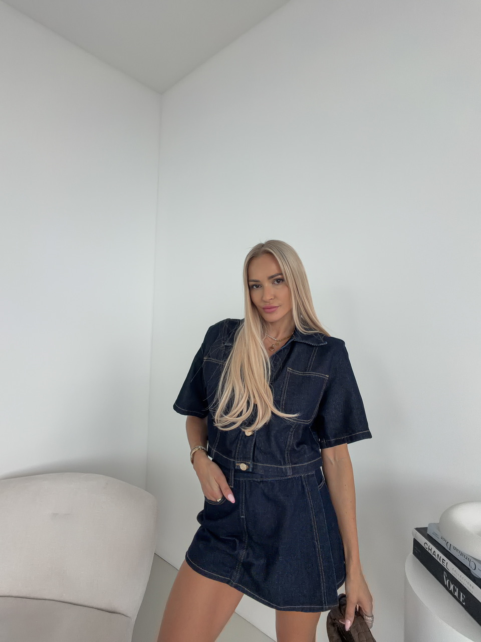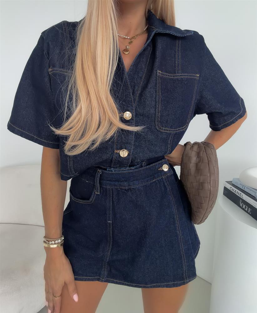 Štýlový denimové šortky, ktorý majú klasické zapínanie na gombík a zips, doplnené o pútka na opasok pre jednoduché doladenie outfitu. Zaujímavým detailom je šikmé zapínanie na prednej strane, ktoré vytvára efekt sukne a dodáva šortkám jedinečný, módny vzhľad. Praktické bočné vrecká spolu so zadnými vreckami zaisťujú pohodlie aj funkčnosť pri každodennom nosení.
