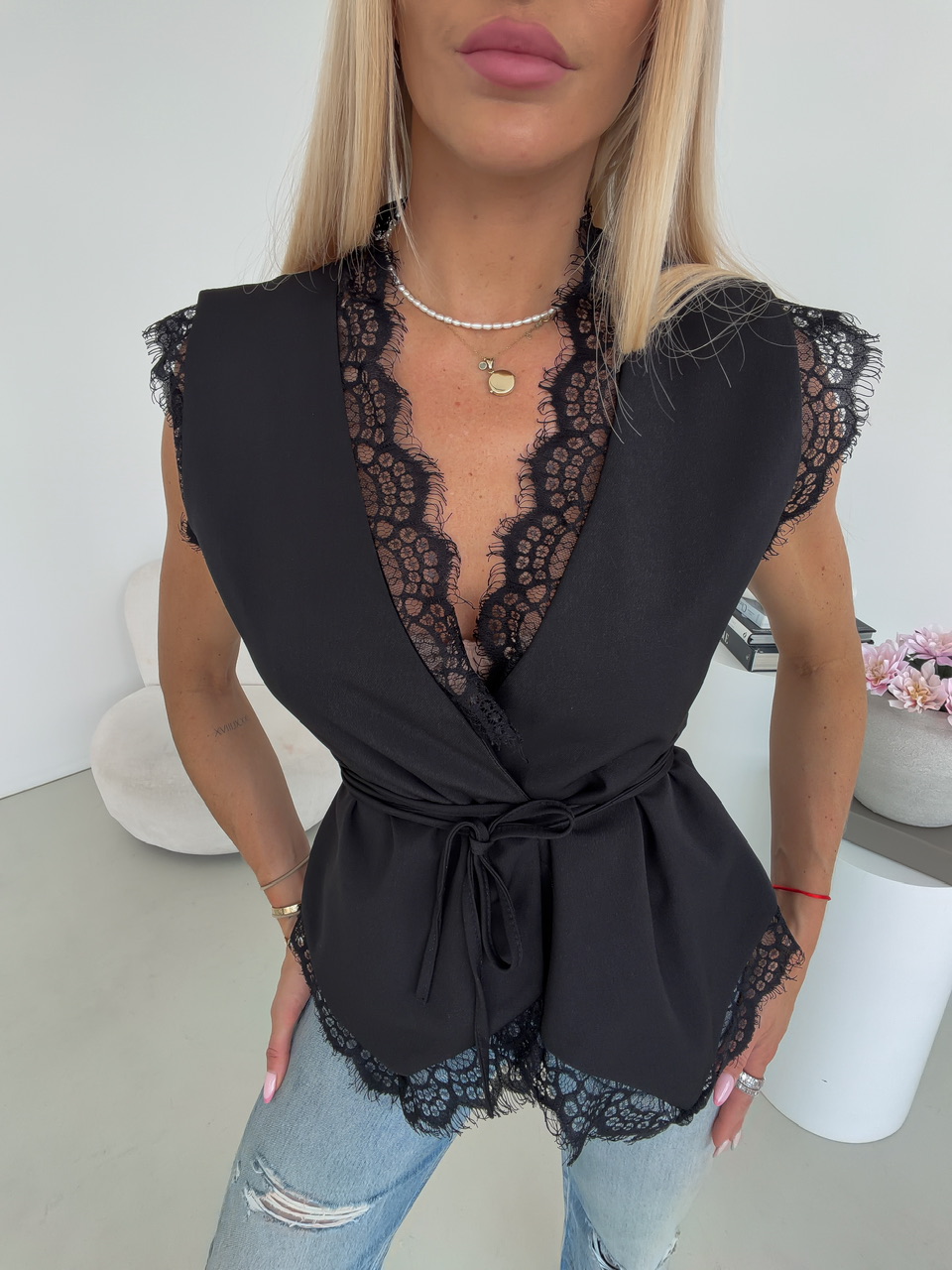 Elegantná vesta s véčkovým výstrihom je štýlový doplnok, ktorý dodá outfitu ženskosť a sofistikovanosť. Zapínanie na jeden gombík vytvára čistý a minimalistický vzhľad, ktorý pôsobí moderne a nadčasovo. Vesta je doplnená jemnou čipkou, ktorá jej dodáva romantický a detailne prepracovaný charakter. Vnútorná jemná podšívka zabezpečuje pohodlné nosenie a príjemný pocit na tele počas celého dňa.Vďaka možnosti viazania v páse si môžete prispôsobiť siluetu podľa potreby – zvýrazniť pás alebo nosiť vestu vo voľnejšom štýle.
