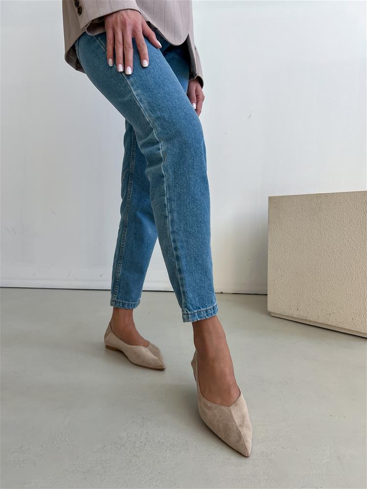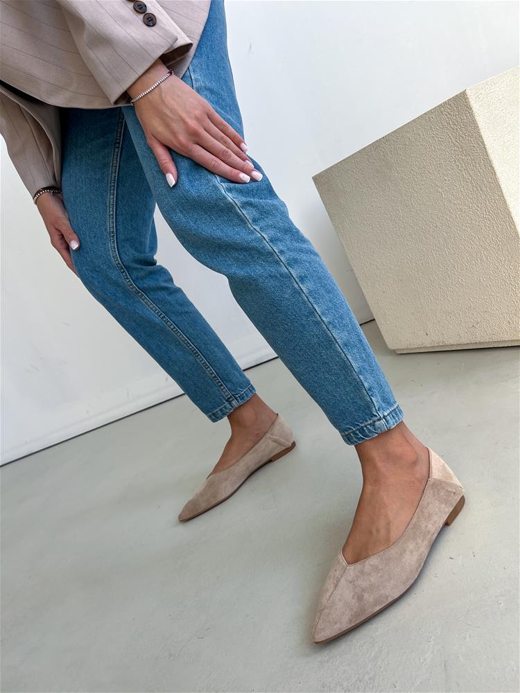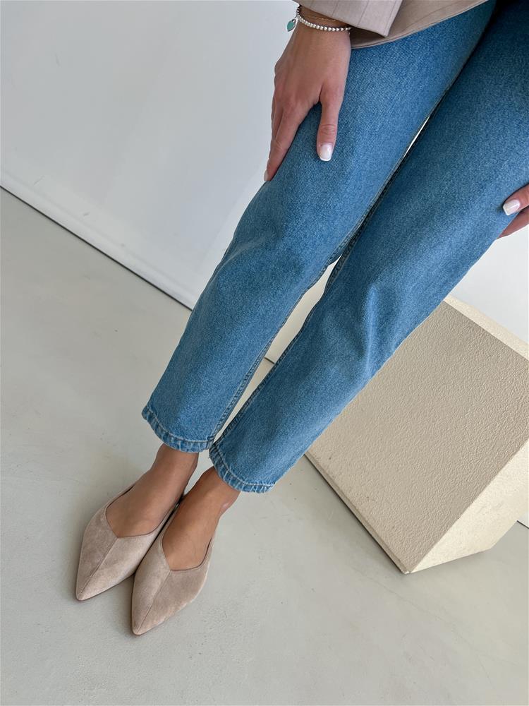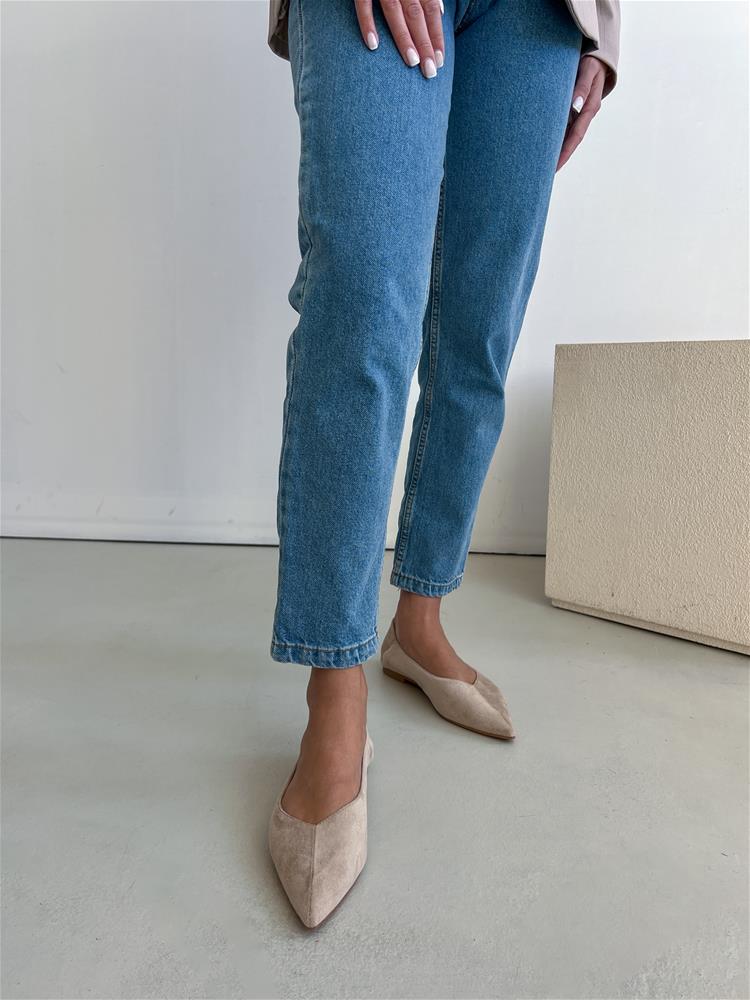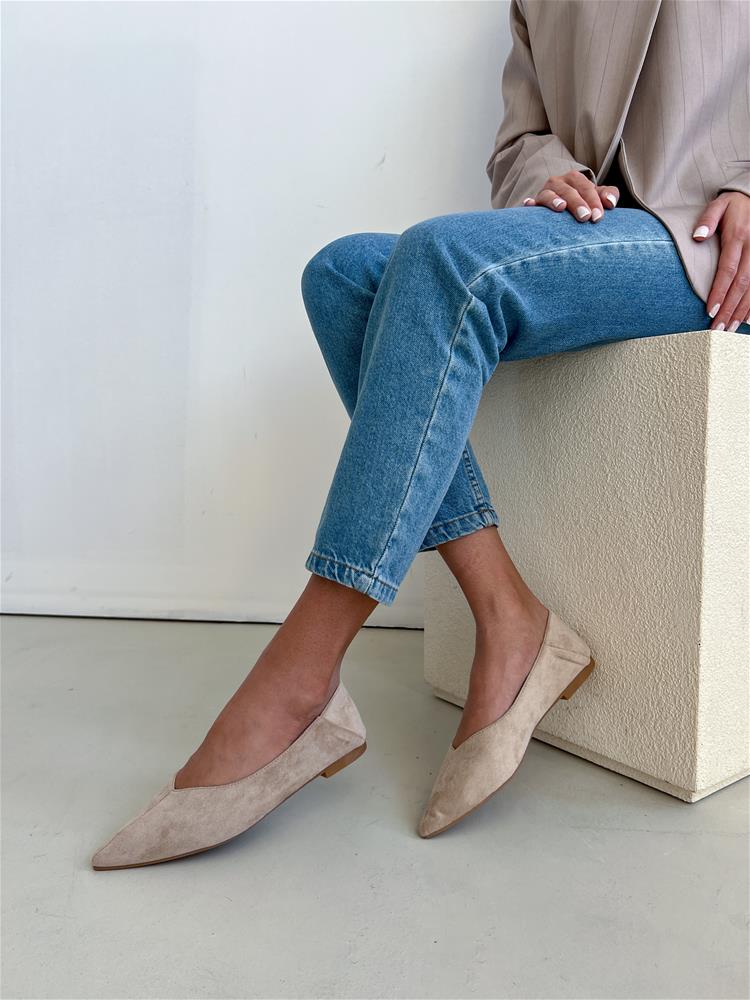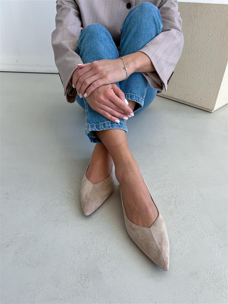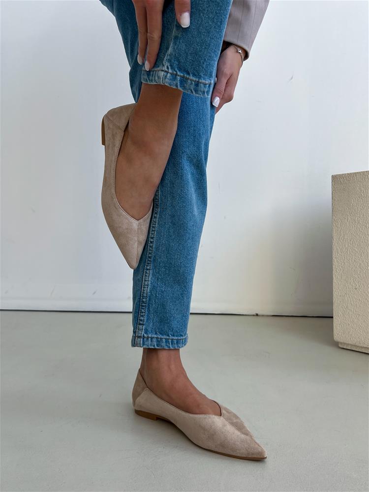 Nízke topánky na rovnej podrážke. Zvršok je semišového materiálu. Predná časť je špicatého tvaru.