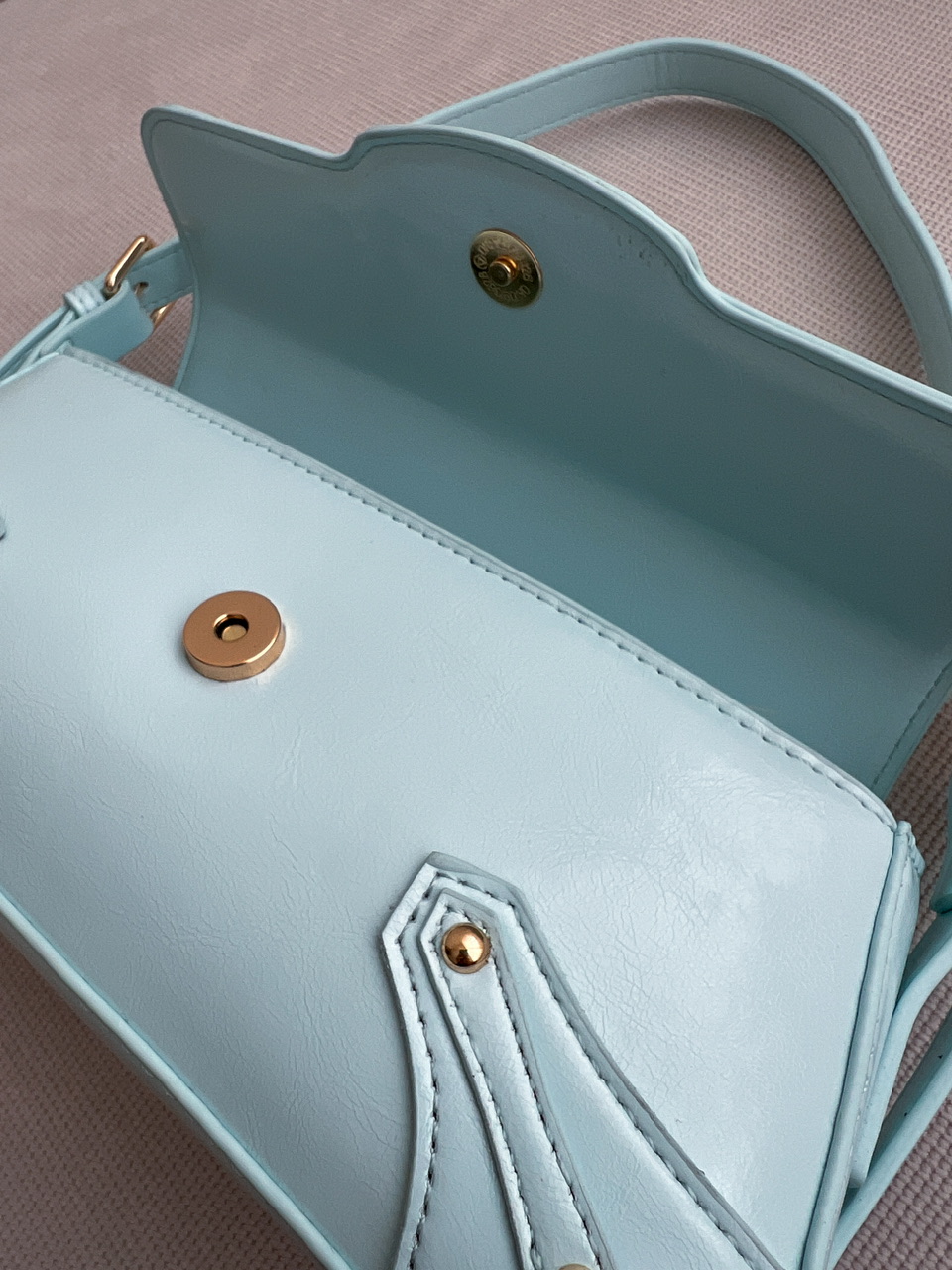 Mini kabelka do ruky alebo na plece v krásnej modro-pastelovej farbe, ktorá je hitom tejto sezóny. Zvršok kabelky je ozvláštnený zlatými prvkami. Kabelka obsahuje extra dlhšie remienko na plece, ktoré si viete zameniť za kratšie. Vnútorná časť je podšitá a po bočných stranách obsahuje jedno vrecko na zips a jedno otvorené vrecko. Kabelka má zapínanie na magnetický klips.